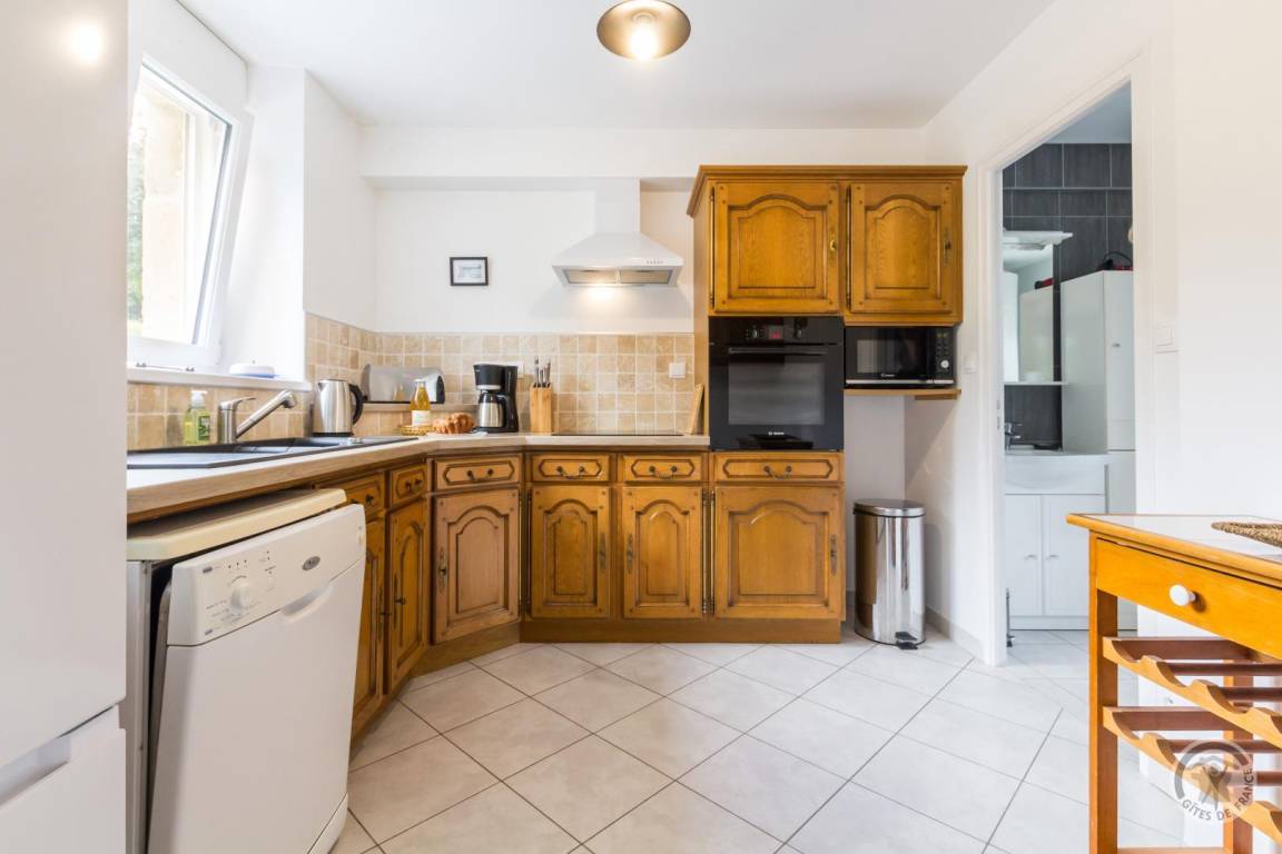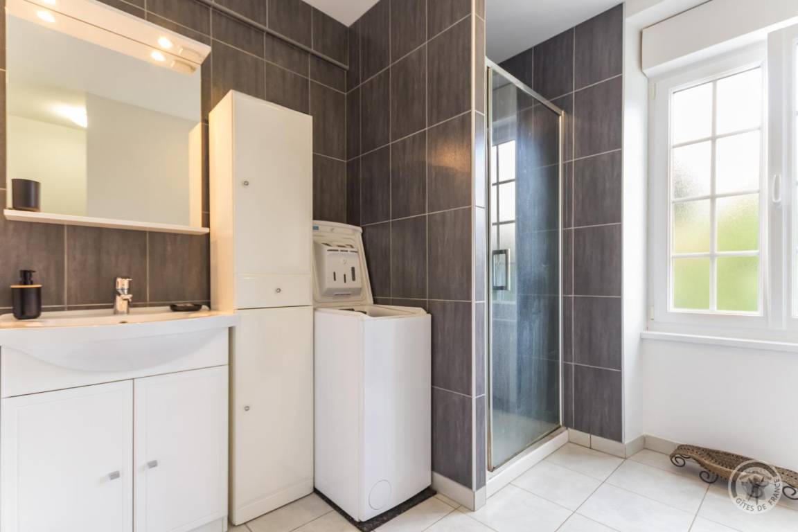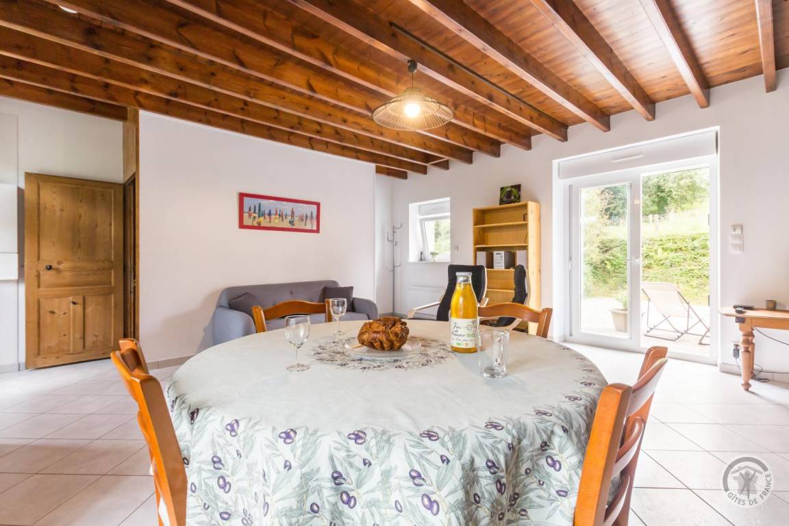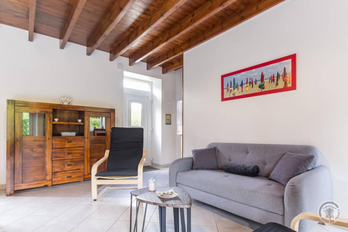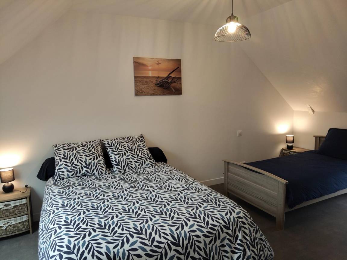 Doppelhaushälfte neben einem anderen Haus. Erdgeschoss: Wohnzimmer mit Kaminofen (TV, Internet, Stereoanlage). Voll ausgestattete Küche (Induktionskochfeld, Dunstabzugshaube, Backofen, Mikrowelle, Geschirrspüler, Kühl-/Gefrierkombination, Filterkaffeemaschine und Senseo-Kaffeemaschine). Duschbad mit WC (Waschbecken, Dusche, Handtuchwärmer, Waschmaschine, Wäschetrockner, Föhn). Abstellraum. Obergeschoss: Schlafzimmer 1 (Doppelbett 140x190 cm) mit kleinem angrenzenden Zimmer. Schlafzimmer 2 (Doppelbett 140x190 cm + Einzelbett 90x190 cm). WC. Außenbereich: Komplett umzäuntes Grundstück. Eingezäunter Innenhof mit Parkplätzen vor dem Haus. Eingezäunter Innenhof hinter dem Haus. Terrasse. Gartenmöbel. Liegestühle. Grill. Überdachter Pavillon. Parkplatz. Gesellschaftsspiele. Elektrische Heizung inklusive, Holz wird gestellt. Bettwäsche und Handtücher werden gestellt. Betten sind bei Ankunft bezogen. Reinigung optional. Babyausstattung (Reisebett, Hochstuhl und Wickelauflage). Nichtraucher-Fer