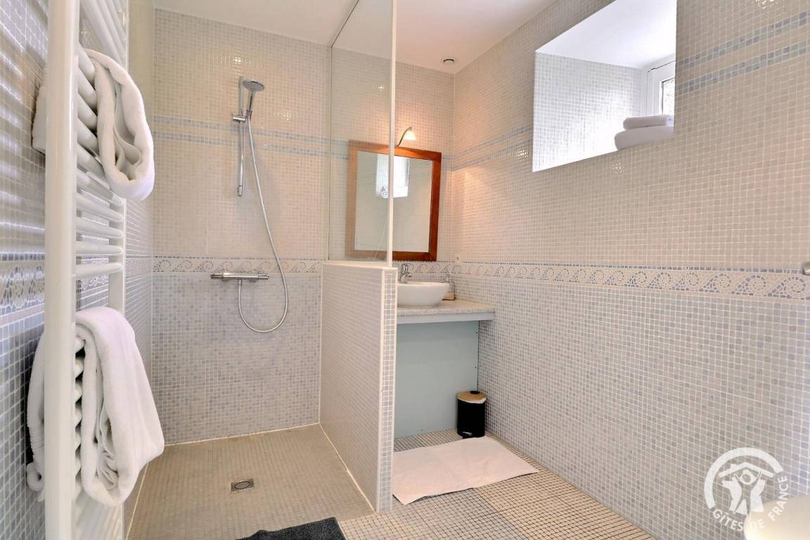 - ein Badezimmer mit einer geräumigen ebenerdigen Dusche.