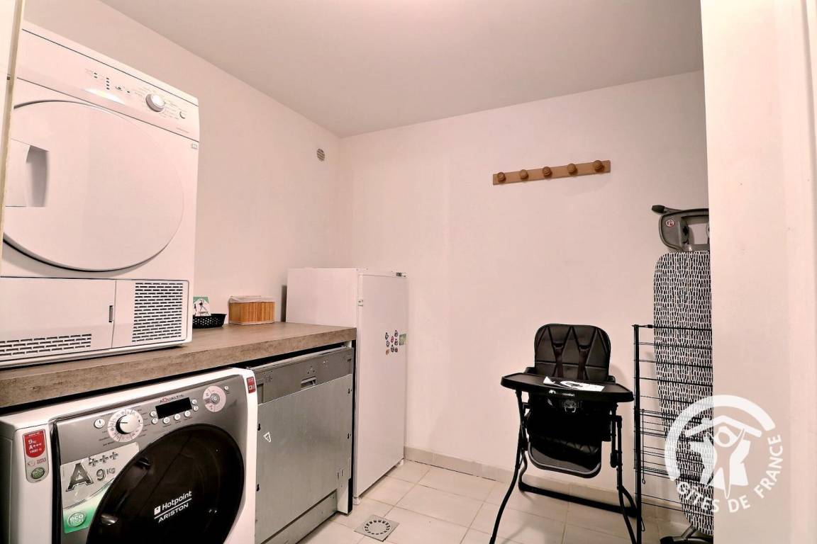 Waschküche mit Waschmaschine, Trockner, Geschirrspüler und Kühlschrank.