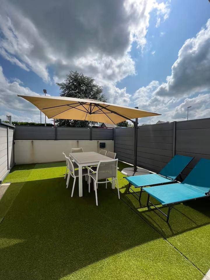 Zugang zu einem privaten, umzäunten Innenhof (Kunstrasen) mit Gartenmöbeln und Grillplatte – perfekt zum Sonnenbaden.