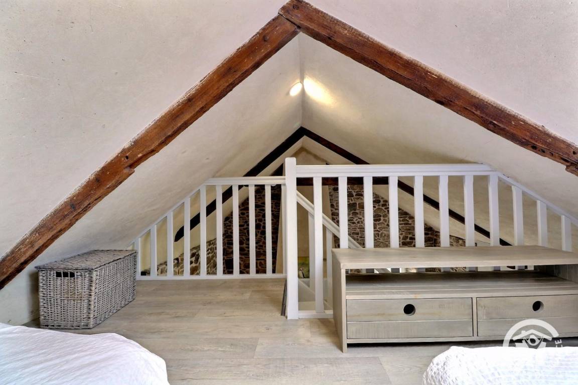 Im Zwischengeschoss, nur für Kinder geeignet (geringe Dachschräge): 2 Betten à 90 cm.