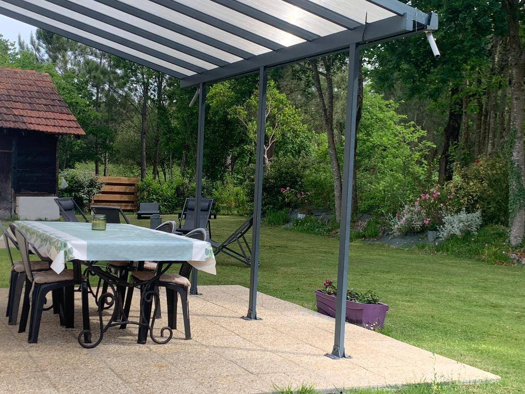 Überdachte Terrasse mit Gartenmöbeln und elektrischem Grill (in Waldnähe).