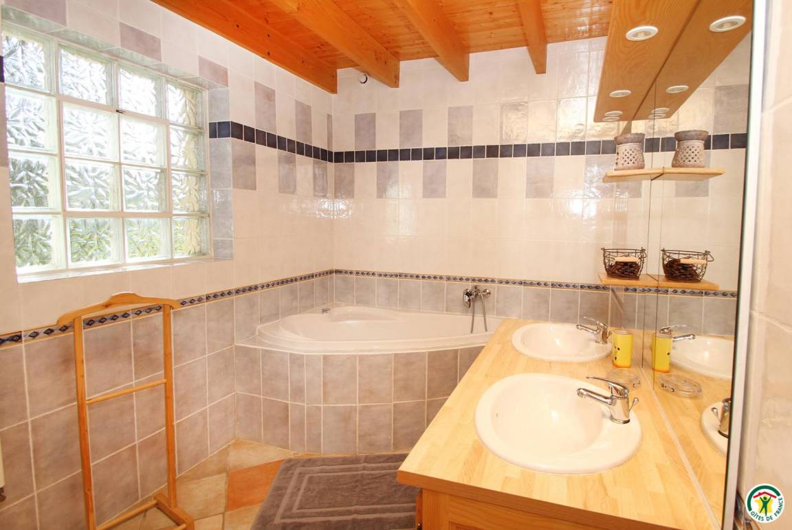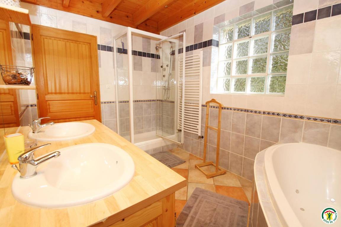 Erdgeschoss: Küche, Wohnzimmer, Bad mit Dusche, WC. Obergeschoss: 4 Schlafzimmer (1 Bett 140 cm) (2 Betten 90 cm) (1 Bett 140 cm) (1 Bett 90 cm), Badezimmer (Dusche und Spa-Badewanne), WC.