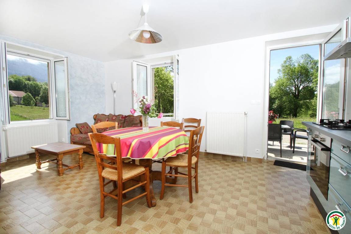 "Küche/Aufenthaltsraum mit Wohnzimmerbereich, 2 Schlafzimmer (2 Betten 90 cm) (1 Bett 140 cm), Badezimmer. Terrasse. Entdecken Sie unsere Käserei, in der der Schimmelkäse "Bleu du Vercors" hergestellt wird."