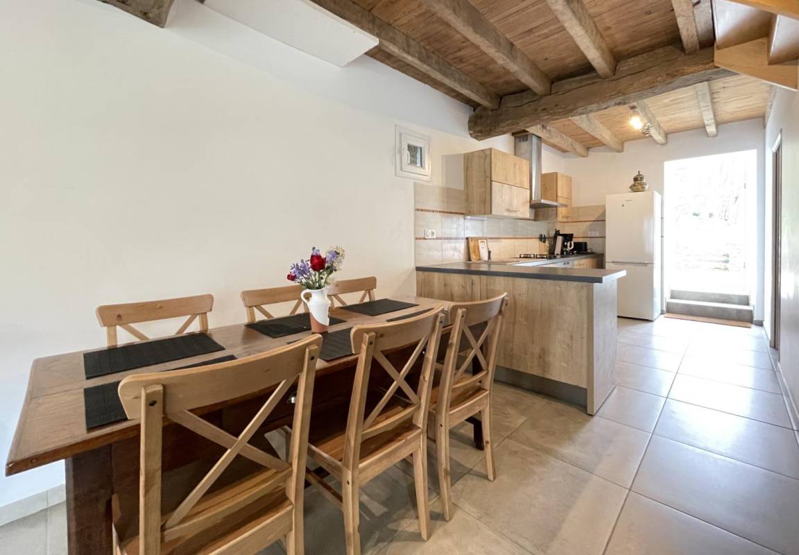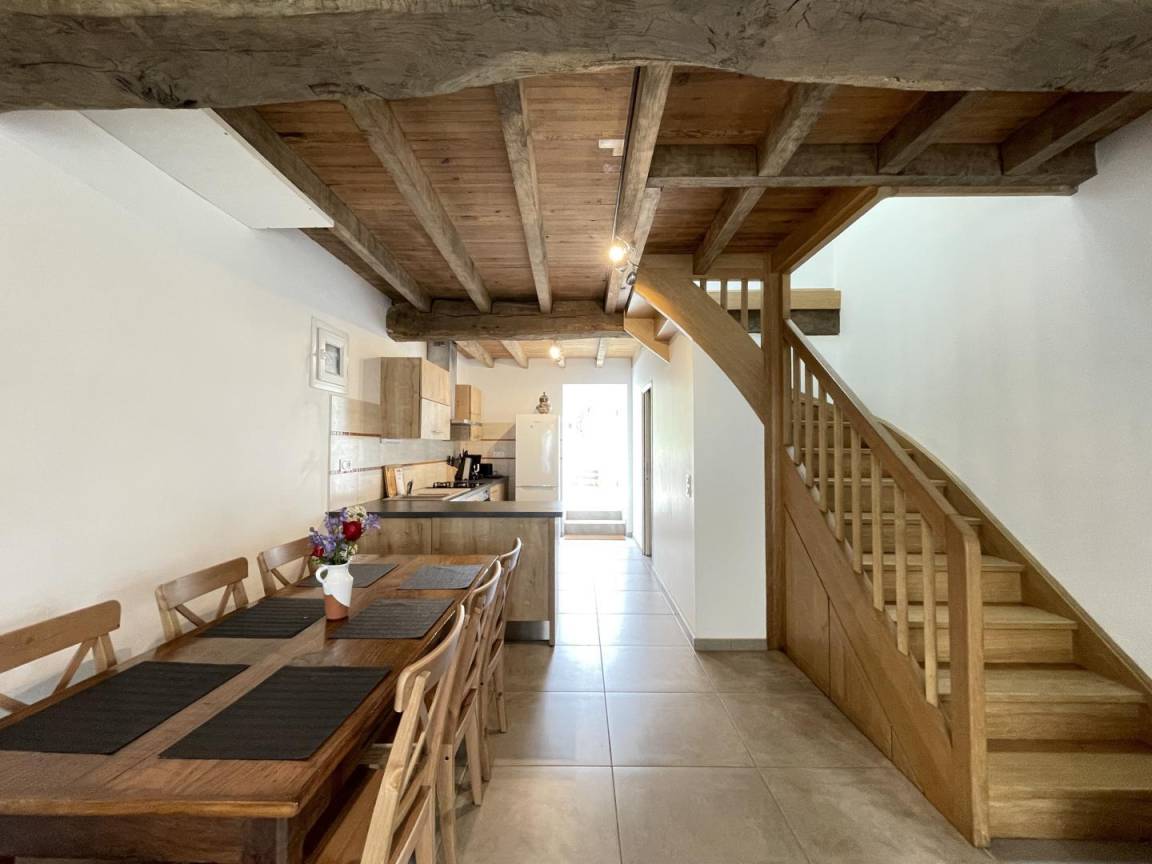 Auf der Rückseite, an der Ostseite, neben dem kleinen, flachen Bach, befindet sich eine angenehme, private Steinterrasse mit wenigen Stufen, die zum Wasser hinunterführen. Dieses ehemalige Bauernhaus erstreckt sich über zwei Etagen. Erdgeschoss: Wohnzimmer (mit Zugang zur Terrasse über zwei Stufen):