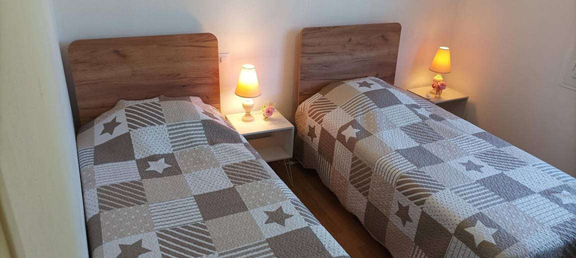 Ihre ebenerdige Ferienwohnung beinhaltet: Küche, Wohnzimmer, 2 Schlafzimmer [1 Doppelbett (140x190), 2 Einzelbetten (90x190 kombinierbar), Badezimmer mit Dusche, WC mit Waschbecken, Terrasse, Innenhof (250 m²), 2000 m² Liegewiese mit Rutsche und Schaukel, Fahrrad- und Motorradunterstand, Glasfaser-Internet.