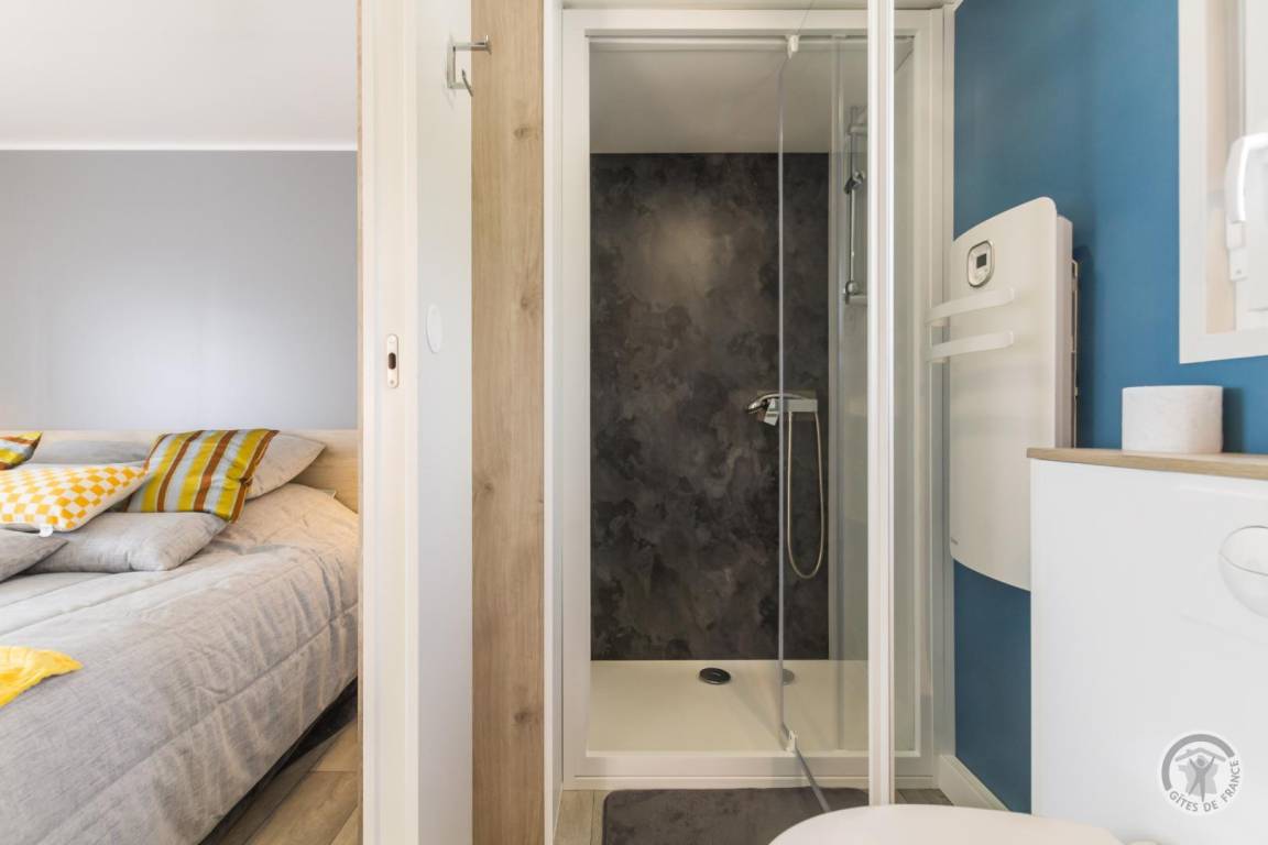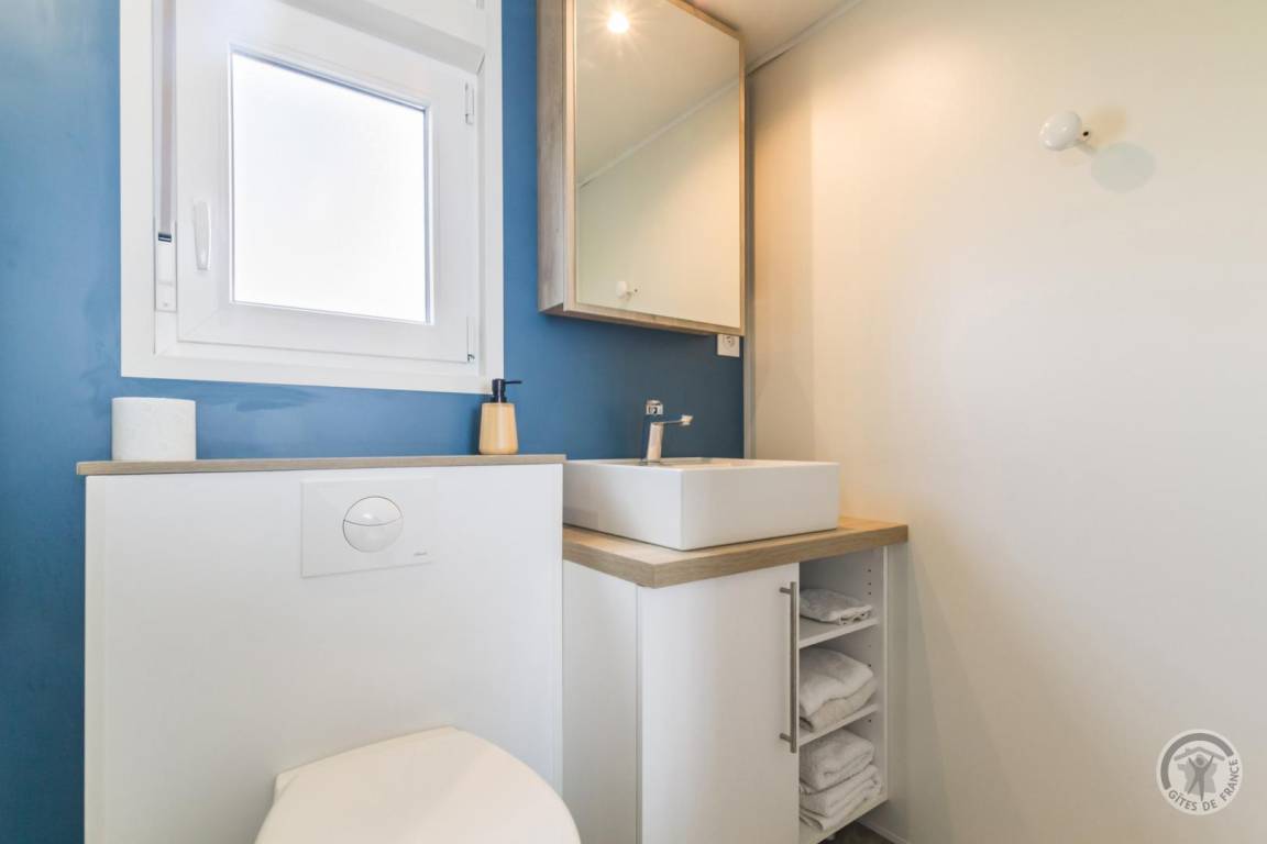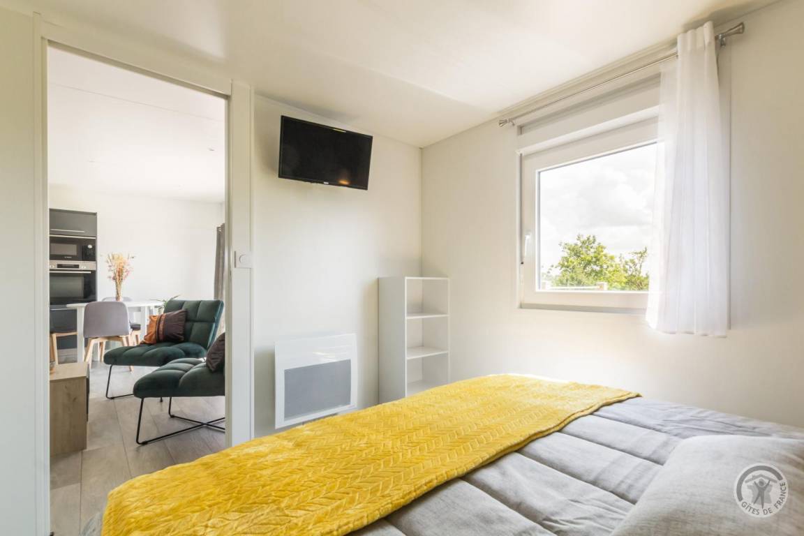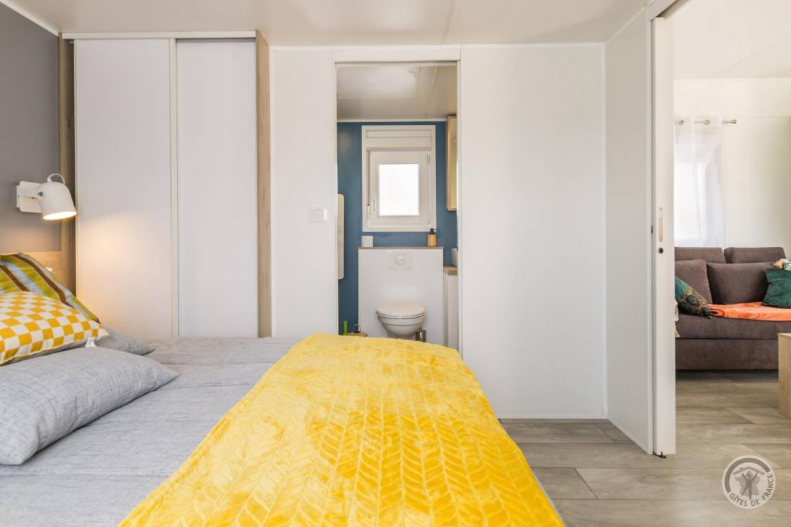 Großes Mobilheim bestehend aus einem Wohnzimmer (TV, WLAN) mit voll ausgestatteter Küche (Induktionskochfeld, Backofen, Kühlschrank mit Gefrierfach, Mikrowelle, Geschirrspüler, Espressomaschine) und Essbereich. 1 Schlafzimmer (Doppelbett 160 x 200) mit TV und eigenem Bad (WC, Waschtisch und Duschkabine). Keine Waschmaschine. Babyausstattung auf Anfrage. Schlafsofa. Alle Gebühren inbegriffen. Bettwäsche wird gestellt und Betten sind bei Ankunft bezogen. Haushaltswäsche und Handtücher werden gestellt. Reinigungsservice inbegriffen. Holzterrasse. Gartenmöbel. Liegestühle. Gemeinsames, nicht eingezäuntes Grundstück. Ein zweites Mobilheim vor Ort. Parkplatz. Gemeinsamer Unterstand.