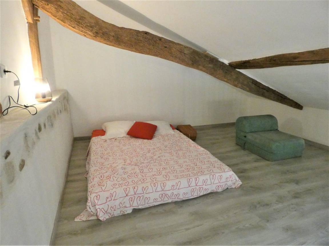 ein Zwischengeschoss mit einem 140 cm breiten Futonbett und 1 Einzelstuhl,