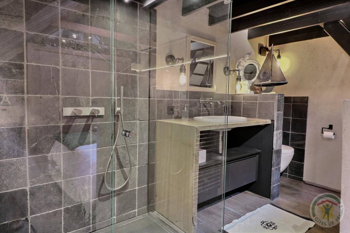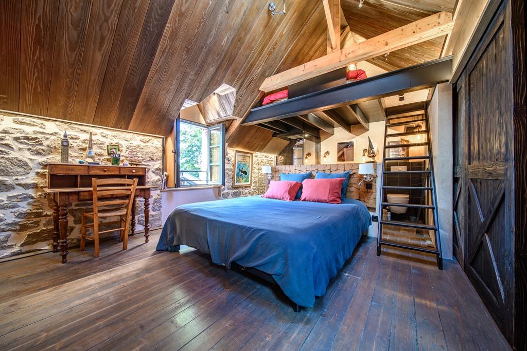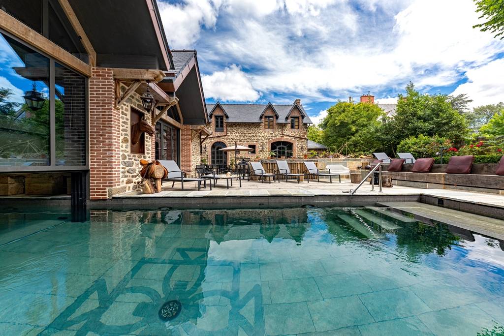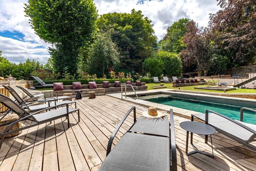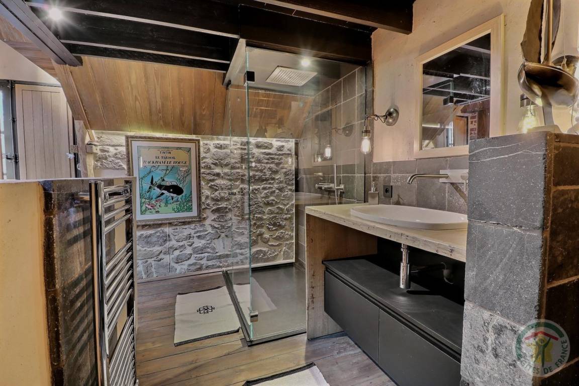 Im Erdgeschoss: Ein Aufenthaltsraum mit Videoprojektor, eine professionelle Küche mit historischer Theke, die sich zu einem privaten Weinkeller mit Panoramablick auf eine nach Süden ausgerichtete Holzterrasse öffnet. In der Küche befindet sich ein großer, fahrbarer Tisch, der auf die Terrasse geschoben werden kann, um die Natur zu genießen. Separates WC. Im Obergeschoss: „Le Champ d'Avoine" (3 schöne Schlafzimmer, jeweils mit einem 180x200 cm großen Bett, Ankleidezimmer, Duschbad und WC), „Le Grenier sur l'eau" (2 kleine Hüttenschlafzimmer, jeweils mit einem 160x200 cm und einem 180x200 cm großen Bett, Duschbad und WC) und „La Grande aux Hirondelles" (2 Schlafzimmer, jeweils mit einem 180x200 cm großen Bett, das in zwei 90x200 cm große Betten umgewandelt werden kann, Duschbad, 1 Schlafzimmer mit einem 160x200 cm großen Bett, separates WC). Es gibt einen Innen-/Außenpool aus Stein, der im Winter und Sommer beheizt ist, sowie ein Hamam und eine Sauna.