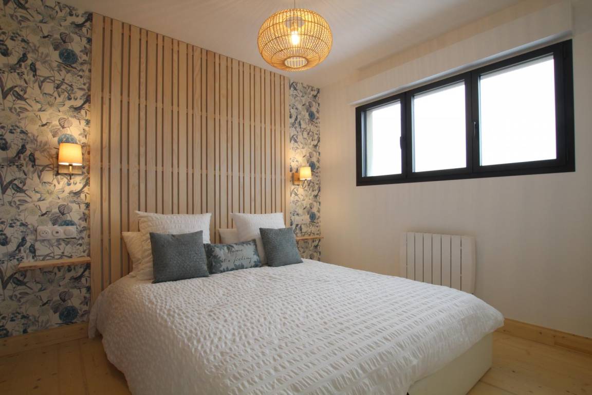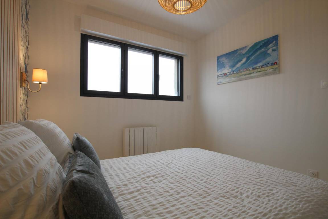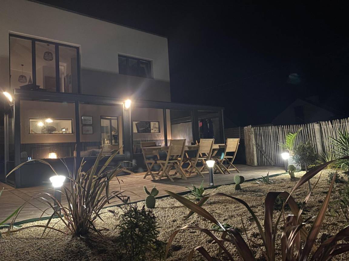 Freistehendes Haus. Veranda mit Sitzbereich. Wohnzimmer (TV, Internetzugang) mit ausgestatteter Küchenzeile (Backofen, Geschirrspüler, Gefrierschrank, Mikrowelle). Duschbad mit WC (Waschtrockner). Im Obergeschoss befindet sich eine Galerie mit Meerblick (Doppelschlafsofa). Schlafzimmer 1 (1 Doppelbett 160x200cm). Schlafzimmer 2 (2 Einzelbetten 90x200cm). WC. Babyausstattung. Bettwäsche und Handtücher können gemietet werden. Elektrische Heizung inklusive. Reinigungsservice gegen Aufpreis. Privater, umzäunter Garten. Holzterrasse. Gartenmöbel. Grill. Unterstand. Parkplatz. Direkter Strandzugang.