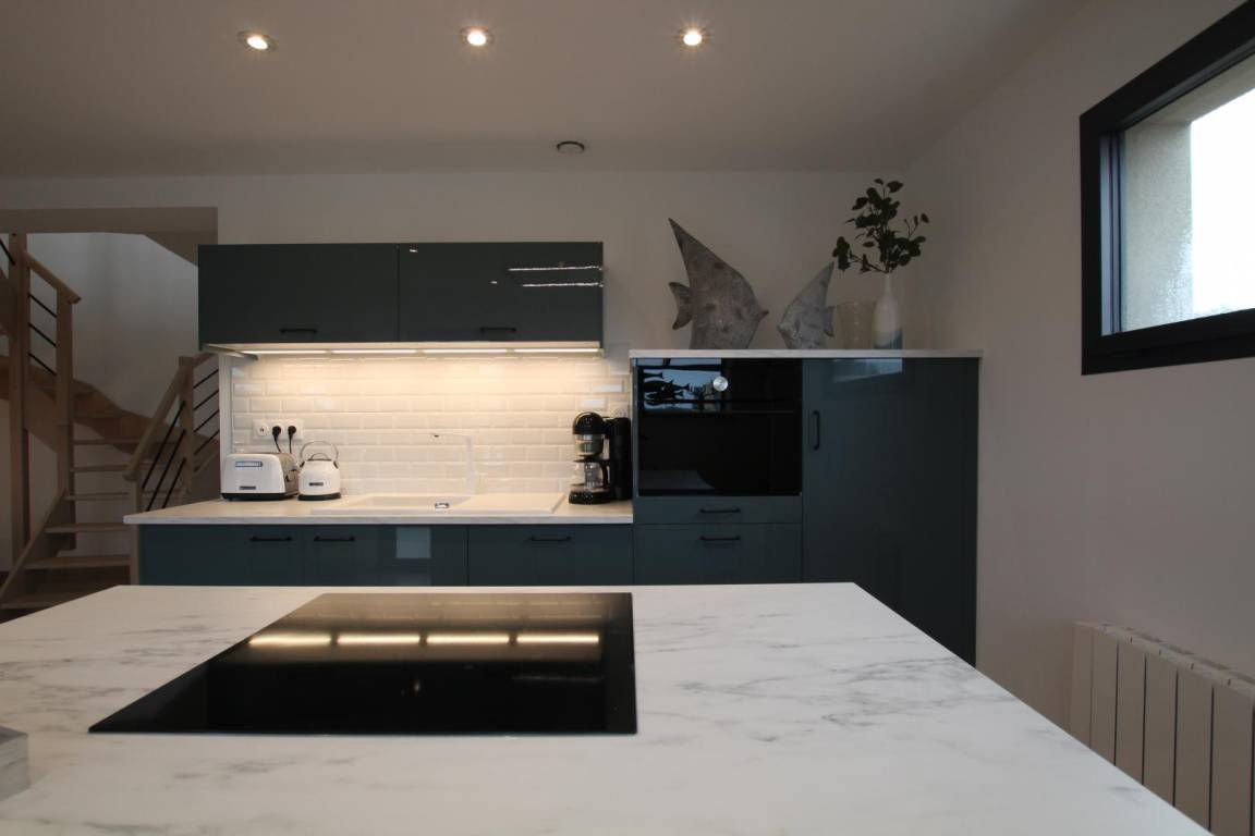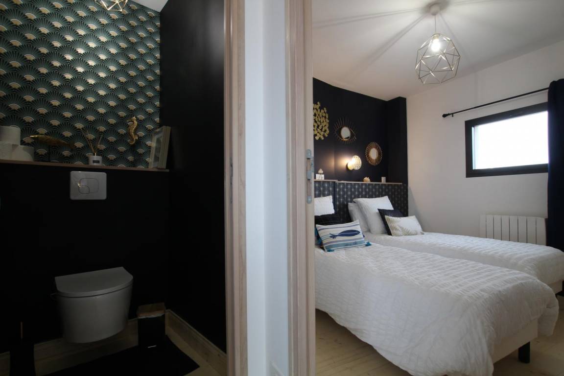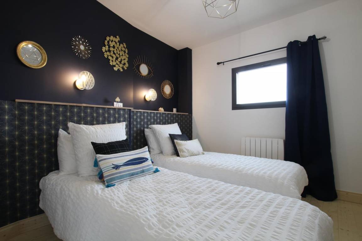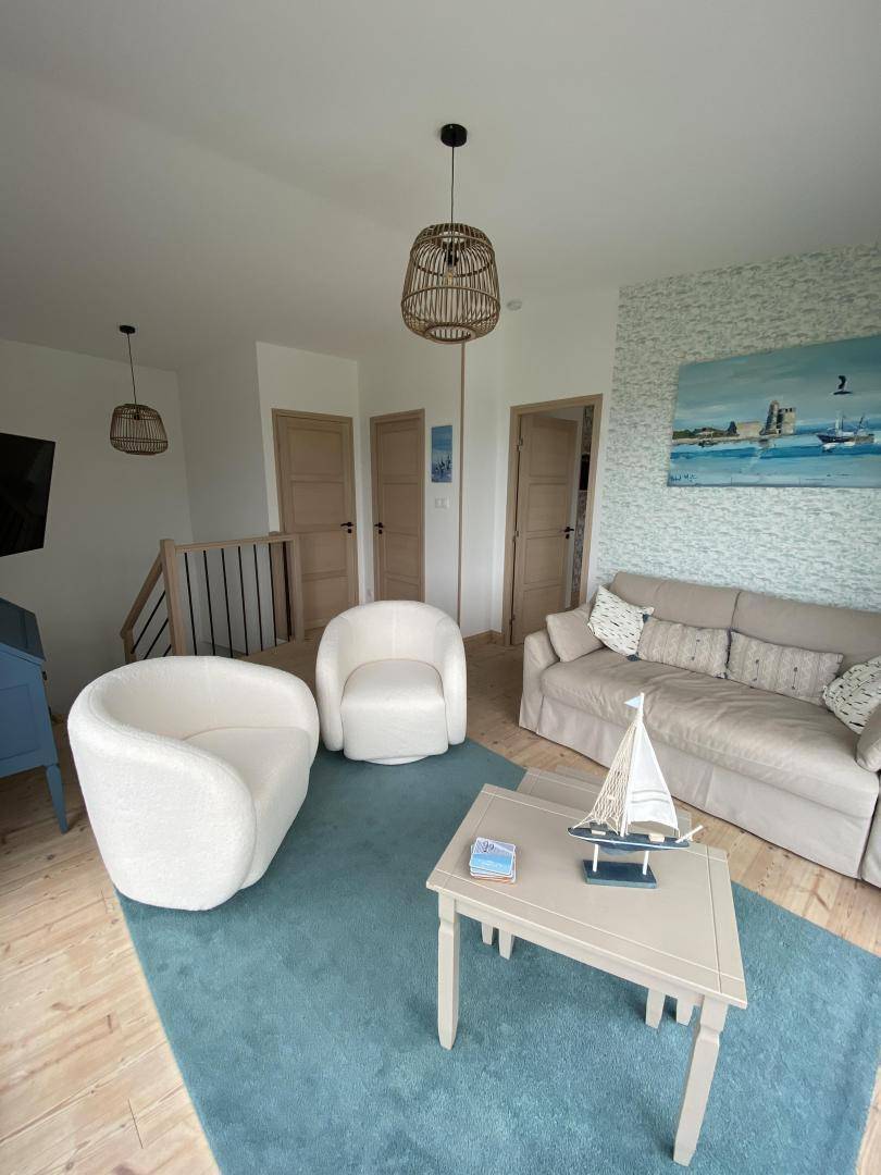 Freistehendes Haus. Veranda mit Sitzbereich. Wohnzimmer (TV, Internetzugang) mit ausgestatteter Küchenzeile (Backofen, Geschirrspüler, Gefrierschrank, Mikrowelle). Duschbad mit WC (Waschtrockner). Im Obergeschoss befindet sich eine Galerie mit Meerblick (Doppelschlafsofa). Schlafzimmer 1 (1 Doppelbett 160x200cm). Schlafzimmer 2 (2 Einzelbetten 90x200cm). WC. Babyausstattung. Bettwäsche und Handtücher können gemietet werden. Elektrische Heizung inklusive. Reinigungsservice gegen Aufpreis. Privater, umzäunter Garten. Holzterrasse. Gartenmöbel. Grill. Unterstand. Parkplatz. Direkter Strandzugang.
