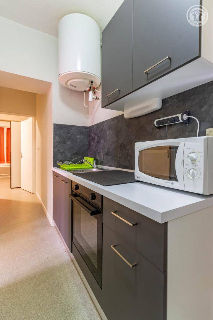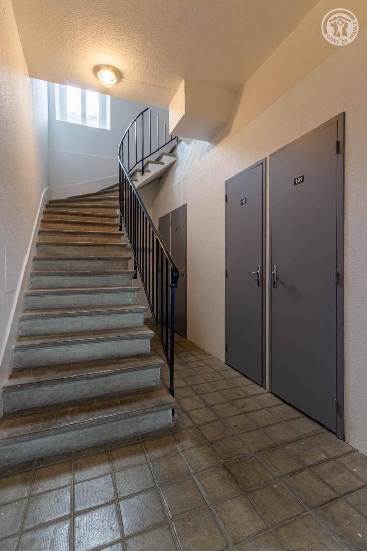 4 Gîtes im Haus. 1. Stock: Wohnzimmer mit Küchenbereich (1 Einzelschlafcouch), 1 Schlafzimmer (1 Doppelbett 140X190 CM), Badezimmer (Badewanne mit WC). Gemeinsame Terrasse im 1. Stock. Waschmaschine und Trockner im Gemeinschaftsraum im Erdgeschoss.