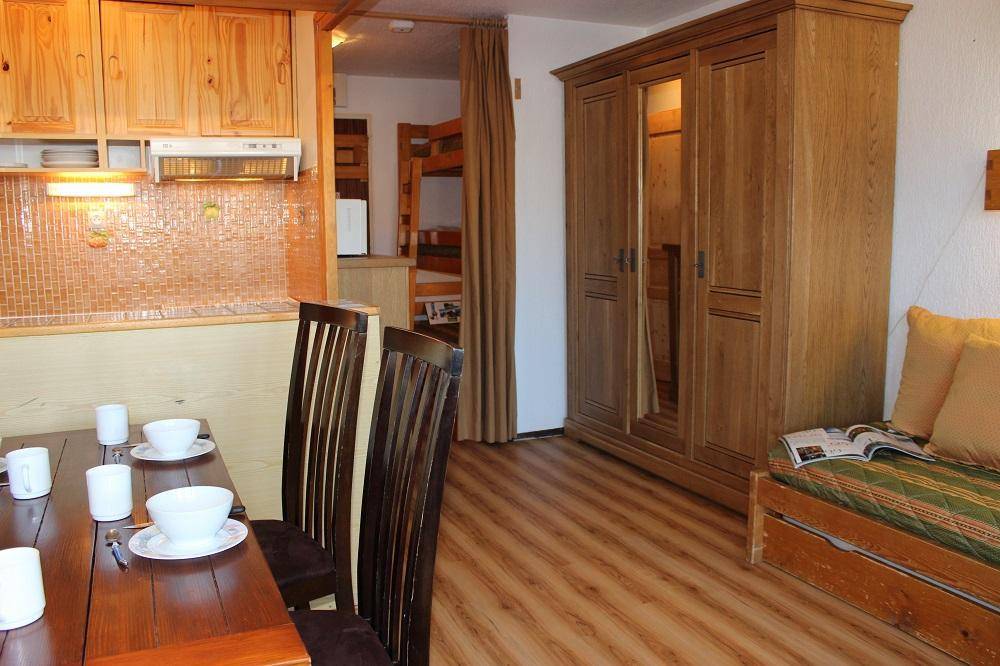 Die Residence Les Névés befindet sich im oberen Teil von Val Thorens, bekannt als Quartier Péclet. Das Viertel ist bei jungen Urlaubern sehr beliebt, da es hier mehrere Bars für tolles Après-Ski gibt. In der Nähe gibt es Geschäfte und Residenzen und die Skipisten sind nur 50 m von der Residenz entfernt. Resort-Kartenreferenz Nr. 58/E2. Fläche von ungefähr 25 m². 1te Etage. Orientierung : Süd, Süd-West, West. Wohnzimmer mit Klappschlafcouch. offener Schlafbereich mit 2 Stockbetten. Kochnische mit Backofen, Dunstabzugshaube, Geschirrspülmaschine, Mikrowellenherd, 2 Glaskeramikkochfelder, Kühlschrank. Badezimmer. separates WC. Veranda. Die oberen Betten sind nicht für Kinder unter 6 Jahren geeignet.