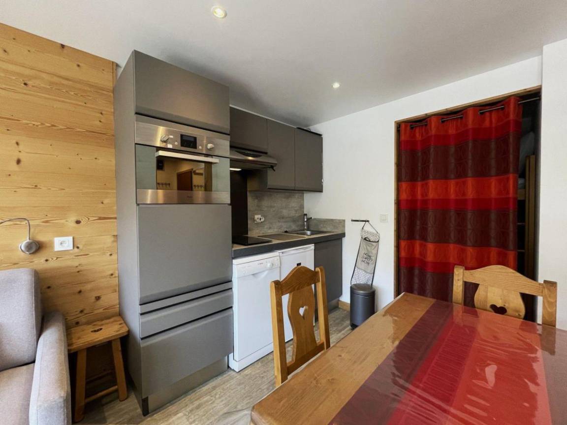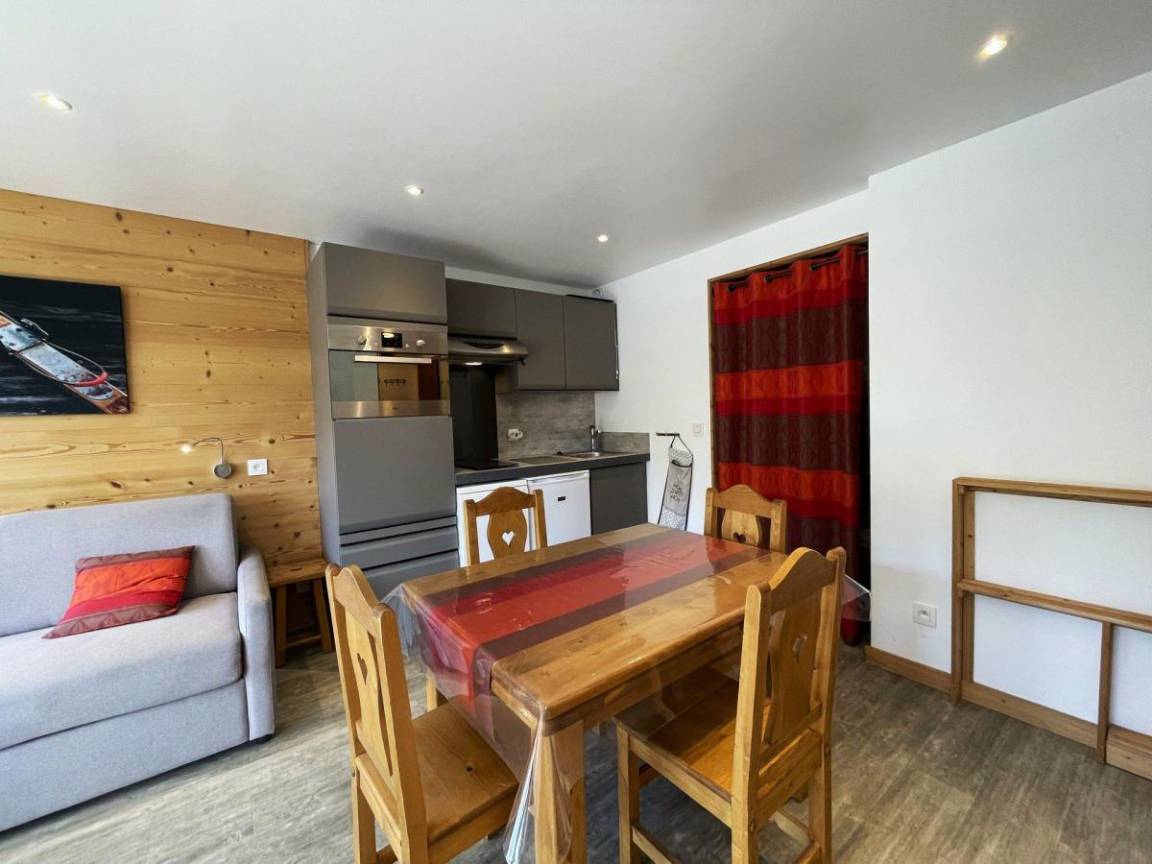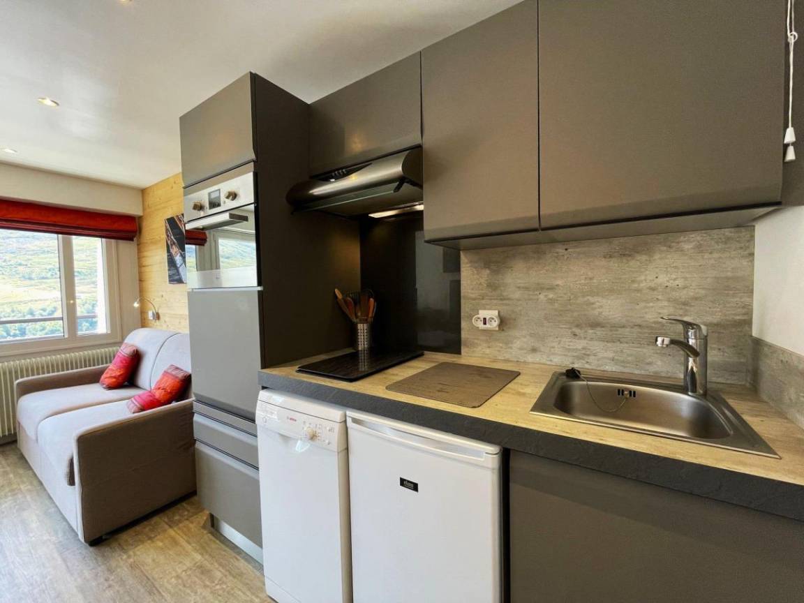 Die Résidence Oisans mit Aufzug befindet sich im Herzen der Croisette, im Zentrum des Resorts, und in der Nähe des Sportzentrums und vieler in der „Multi-Activities Card" inbegriffener Aktivitäten. Fläche von ungefähr 27 m². 6te Etage. Orientierung : Süd. Blick berg. Wohnzimmer mit Klappschlafcouch (140). offener Schlafbereich mit 2 Stockbetten (2x80). Kochnische mit Wasserkocher, Kaffeemaschine, kleiner Backofen mit Mikrowellenfunktion, Toaster, Dunstabzugshaube, Geschirrspülmaschine, 2 Induktionsherdplatten, Kühl-Gefrier-Kombination. Waschräume mit Dusche, Waschbecken. separates WC. Balkon. Die oberen Betten sind nicht für Kinder unter 6 Jahren geeignet.
