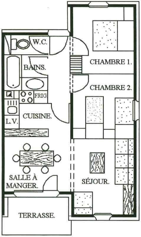 Fläche von ungefähr 52 m². Orientierung : Süd. Wohnzimmer mit Klappschlafcouch, Satelliten-Fernsehen. Schlafzimmer mit Doppelbett (140). Schlafzimmer mit 2 Einzelbetten (90). Kochnische mit Wasserkocher, Kaffeemaschine, Backofen oder kleiner Backofen, Toaster, Geschirrspülmaschine, Mikrowellenherd, Herdplatten, Kühlschrank. Badezimmer mit Badewanne, Waschbecken, Haartrockner. separates WC. Balkon ODER Terrasse. Skiaufbewahrungsfach.