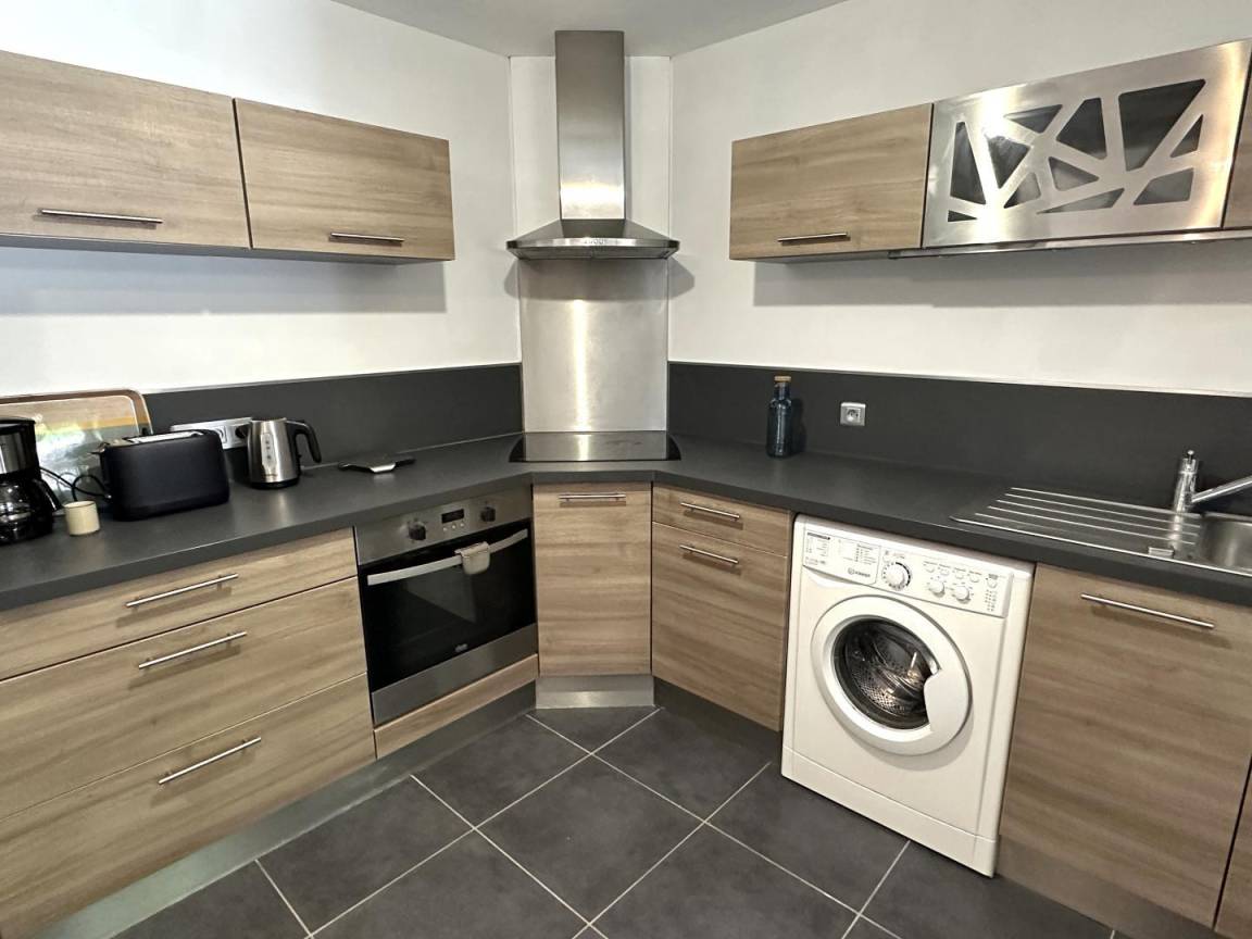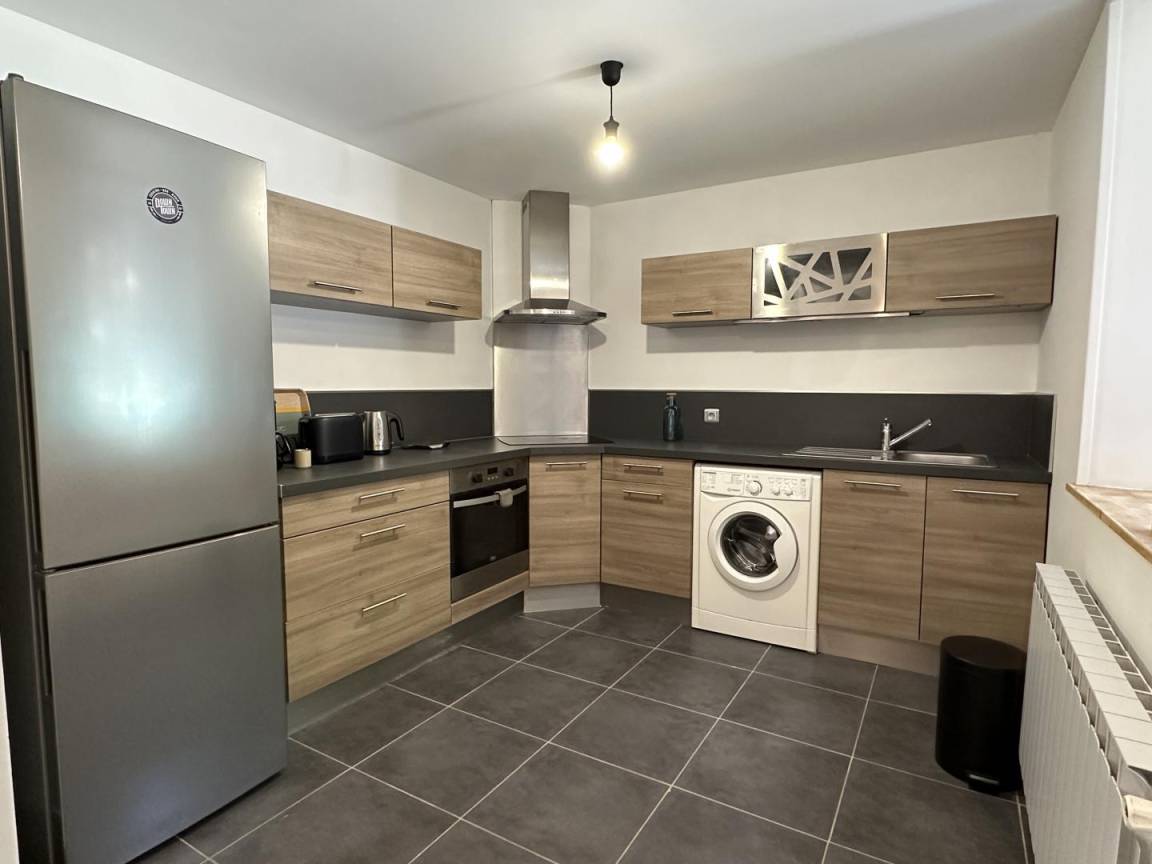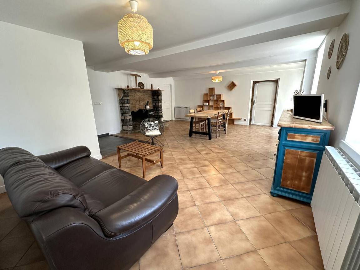– ein großes Wohnzimmer mit Sitzecke (TV), Essbereich mit großem Holztisch und offener Küche (Induktionskochfeld, Dunstabzugshaube, Elektroherd, Kühlschrank mit Gefrierfach und Waschmaschine)