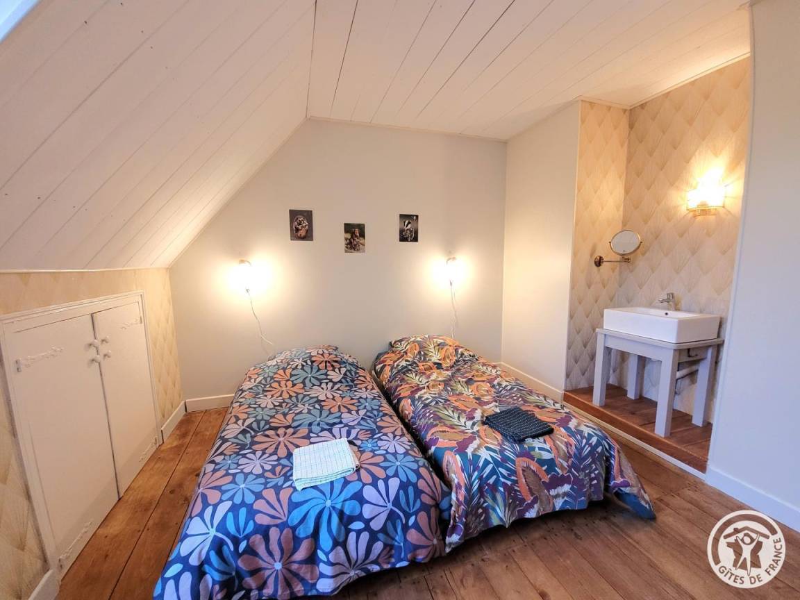 Ein zweites Schlafzimmer mit zwei Einzelbetten (90 x 190 cm), ausgestattet mit Waschbecken und Spiegel