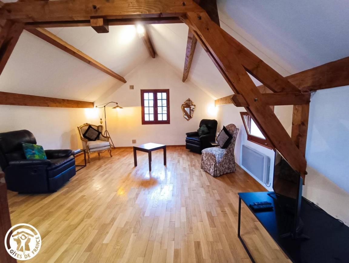 „Gîte très propre, spacieux et plutôt bien agencé (même si le séjour au R+2 est un peu "curieux", sous les toits et donc très chaud malgré la petite clim sur roulettes). Draps, serviettes et ménage inclus: Gros plus...Mais quand même beaucoup de bémols...Manque dans l'ensemble d'entretien "de fond", un peu technique... Beaucoup de volets sont durs, grincent fort (quand on veut ouvrir tôt le matin sans réveiller tout le monde), la porte d'entrée est très dure à fermer...Le bureau d'en bas ne sent pas très bon, pièce humide avec un peu de moisi sur les murs derrière le clic-clac. Comme signalé par un précédent occupant, le lit du dernier niveau fait un bruit d'enfer pour ceux qui sont dans la chambre d'en dessous. Sommiers métalliques très bruyants/grinçants (même si matelas confortables) Et enfin (même si on l'avait déjà "remarqué" en amont), il y a quand même très très peu de commerces à côté (1ère boulangerie à 4km, voiture obligatoire). Idem pour micro épicerie, sinon c'est 15/20 minutes de voiture pour une supérette, et les routes sont très étroites le long du Lot. 1ères "vraies" communes Figeac ou Cahors, à env 40/45 minutes de voiture...Proximité du magnifique village de St Cirq Lapopie et baignades dans le Lot: C'est un plus“