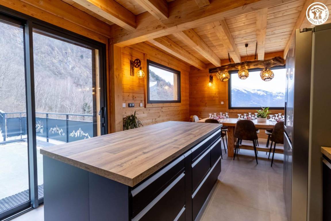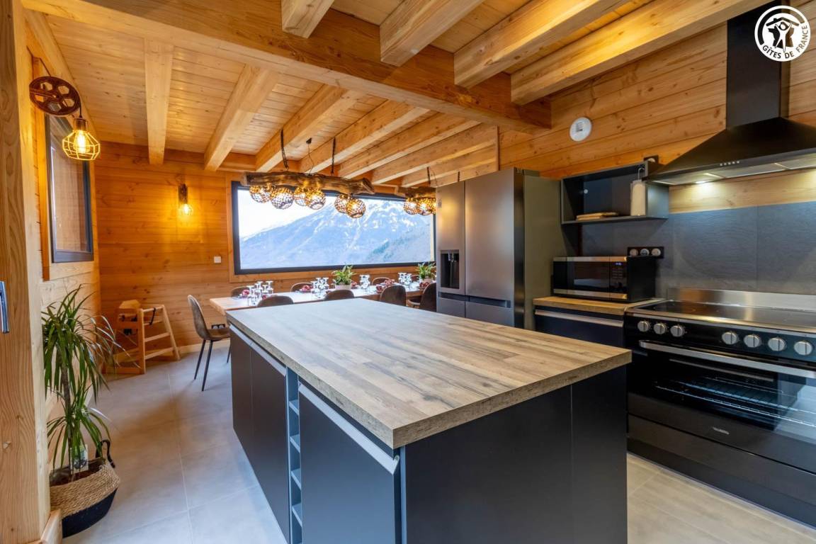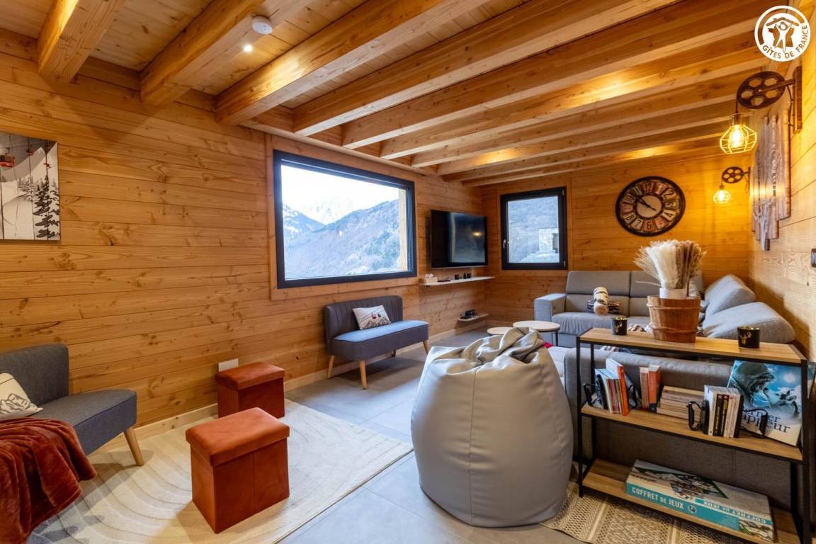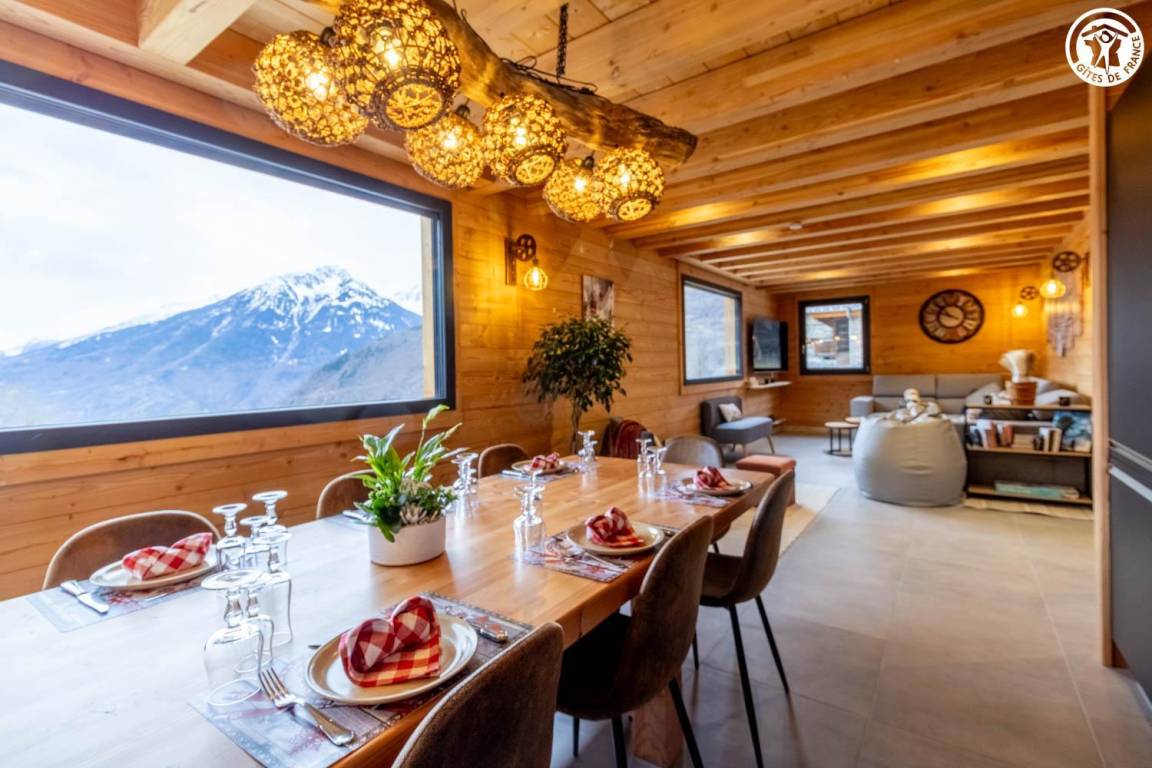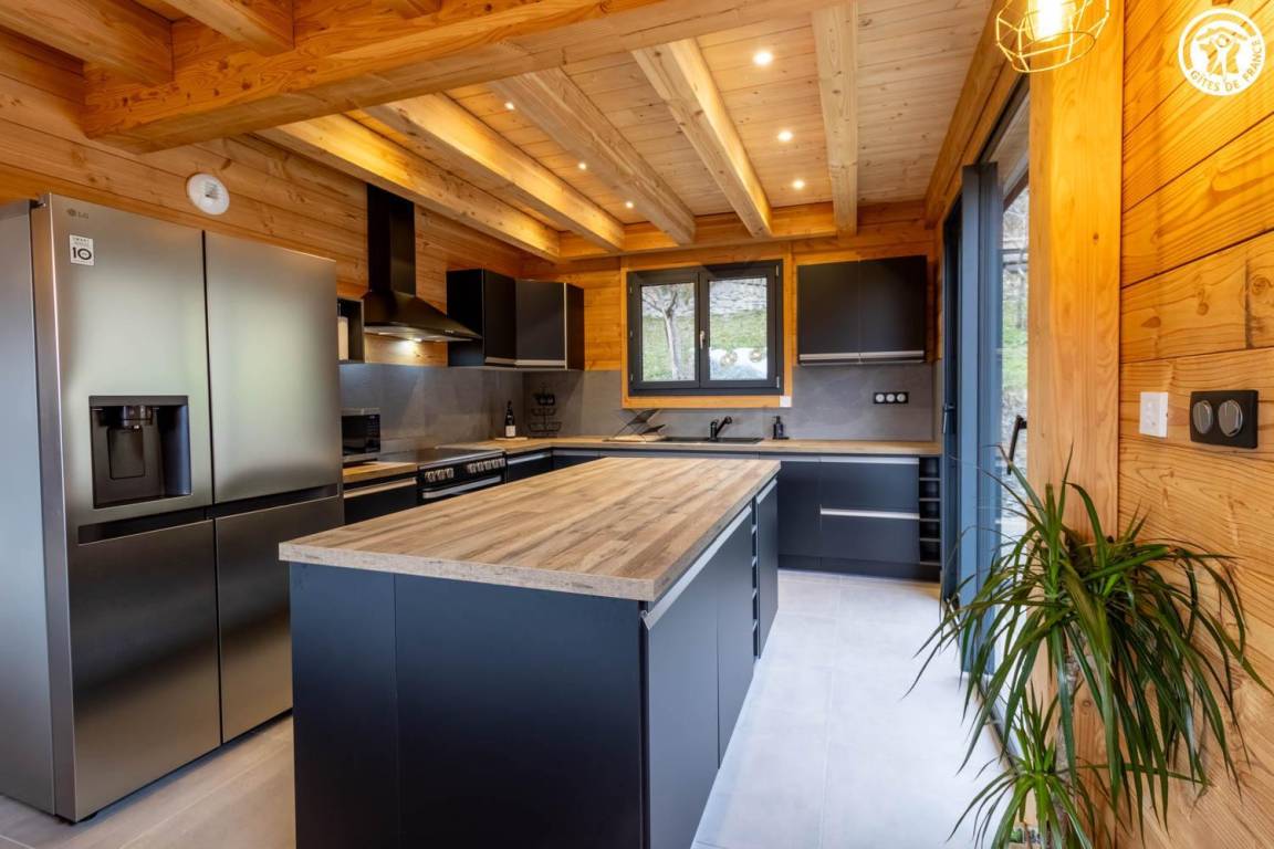 Dieses moderne Chalet vereint Komfort und Charakter. Es verfügt über ein großes, helles Wohnzimmer mit offener Küche. Große, nach Süden ausgerichtete Erkerfenster bieten einen atemberaubenden Blick auf die Berge und die Massive von Lauzière, Belledonne und Arves. Dank der Verwendung edler Materialien ist die Bergatmosphäre warm und behaglich. Die moderne und authentische Inneneinrichtung lädt zum Entspannen und Geselligkeit ein.