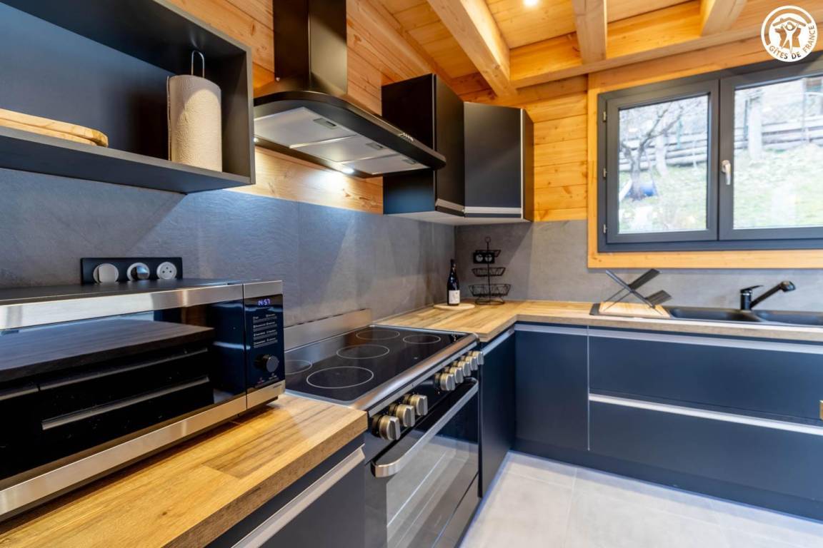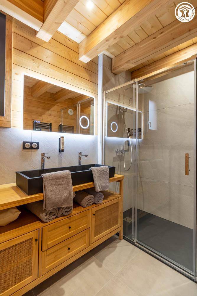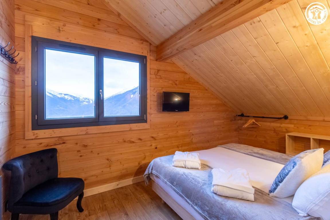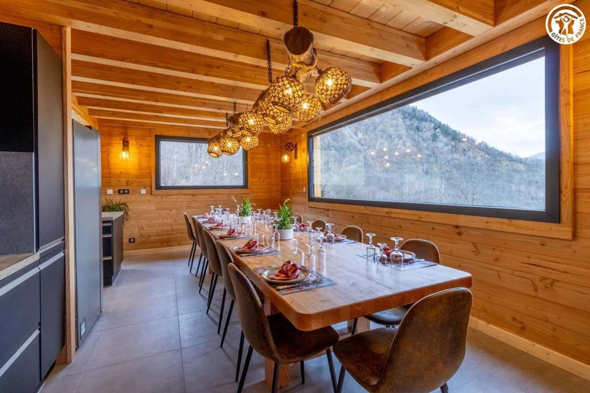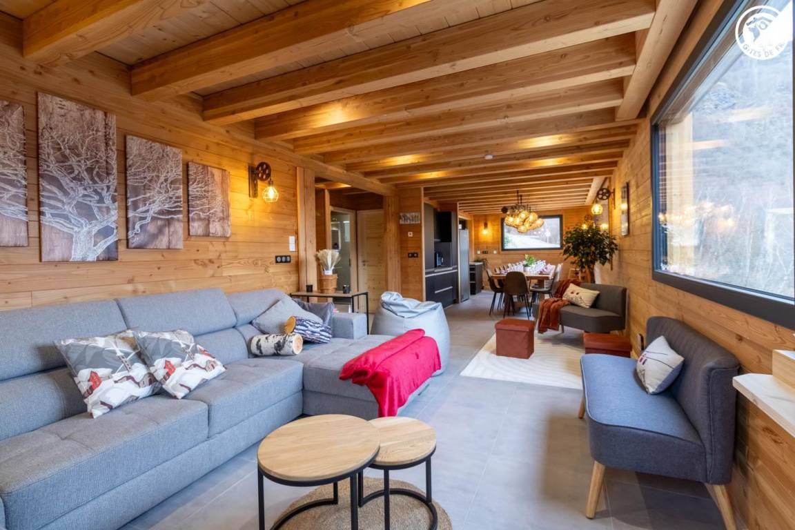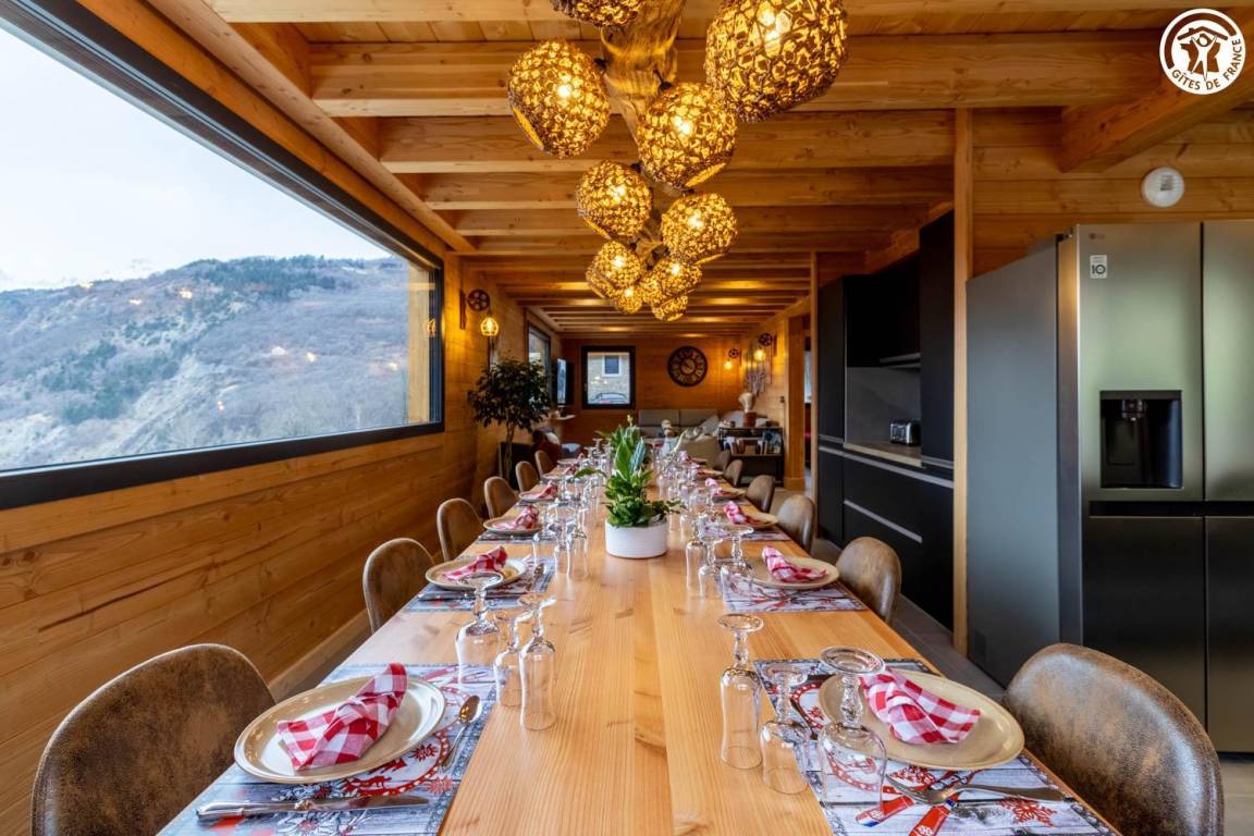 Dieses moderne Chalet vereint Komfort und Charakter. Es verfügt über ein großes, helles Wohnzimmer mit offener Küche. Große, nach Süden ausgerichtete Erkerfenster bieten einen atemberaubenden Blick auf die Berge und die Massive von Lauzière, Belledonne und Arves. Dank der Verwendung edler Materialien ist die Bergatmosphäre warm und behaglich. Die moderne und authentische Inneneinrichtung lädt zum Entspannen und Geselligkeit ein.