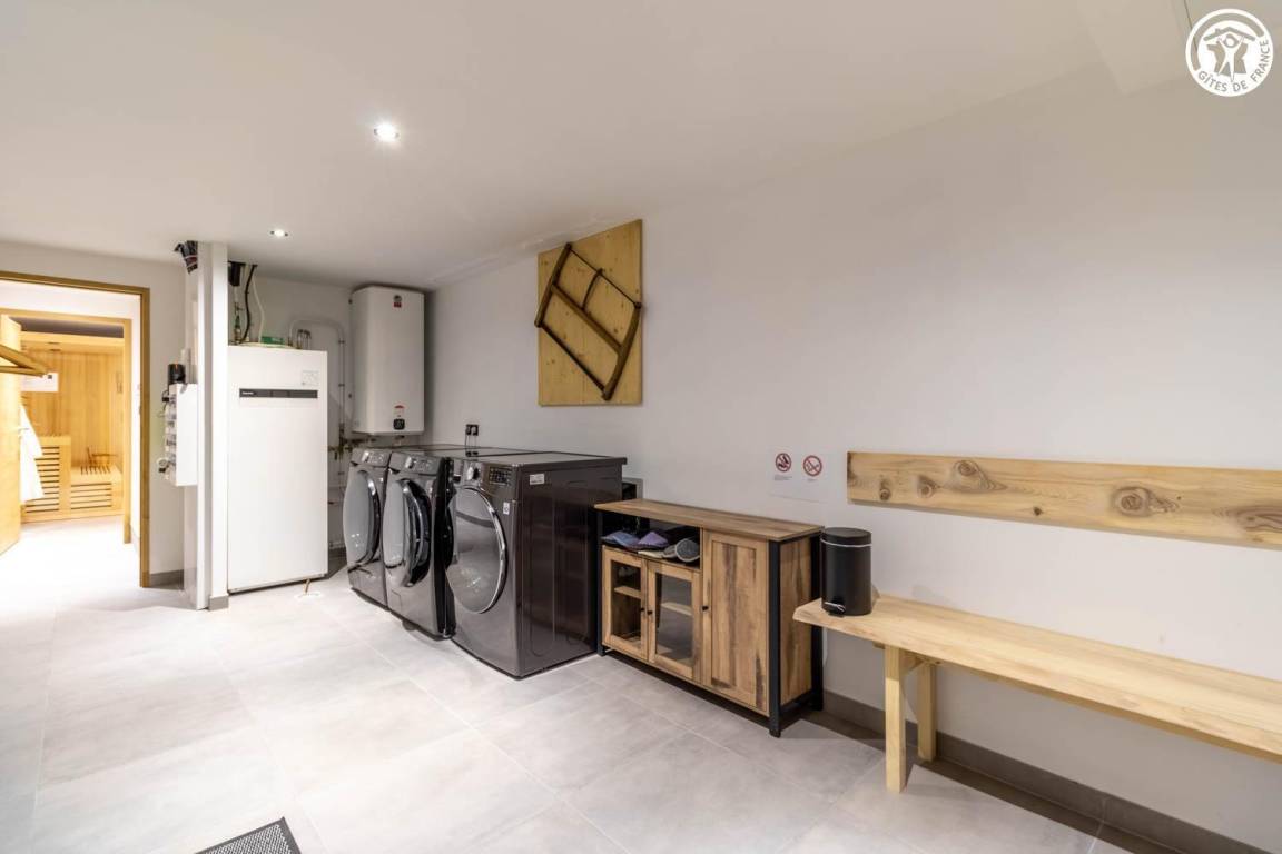 Individuelles Chalet auf 3 Ebenen. Erdgeschoss: Wohnzimmer - Küche, separates WC, Duschraum (ebenerdige Dusche), 1 Schlafzimmer (2 Einzelbetten 90x200 cm, die zusammengestellt werden können). 1. Stock: 5 Schlafzimmer (2 Einzelbetten 90x200 cm können zusammengefügt werden / 2 Einzelbetten 90x200 cm können zusammengefügt werden / 2 Einzelbetten 90x200 cm können zusammengefügt werden / 2 Einzelbetten 90x200 cm können zusammengefügt werden / 2 Einzelbetten 90x200 cm können zusammengefügt werden), separates WC, Badezimmer (Badewanne). Separates WC. Ebene – 1: Wellnessbereich mit Sauna – Dusche – WC, Waschküche (Waschmaschine/Trockner), Fahrrad-/Skiraum. Garage für zwei Autos, 40 m². Nähe zur Straße. Bettwäsche und Handtücher inklusive.