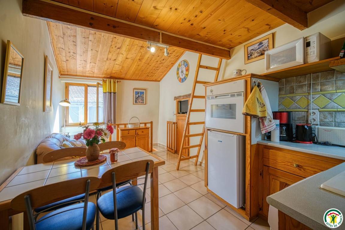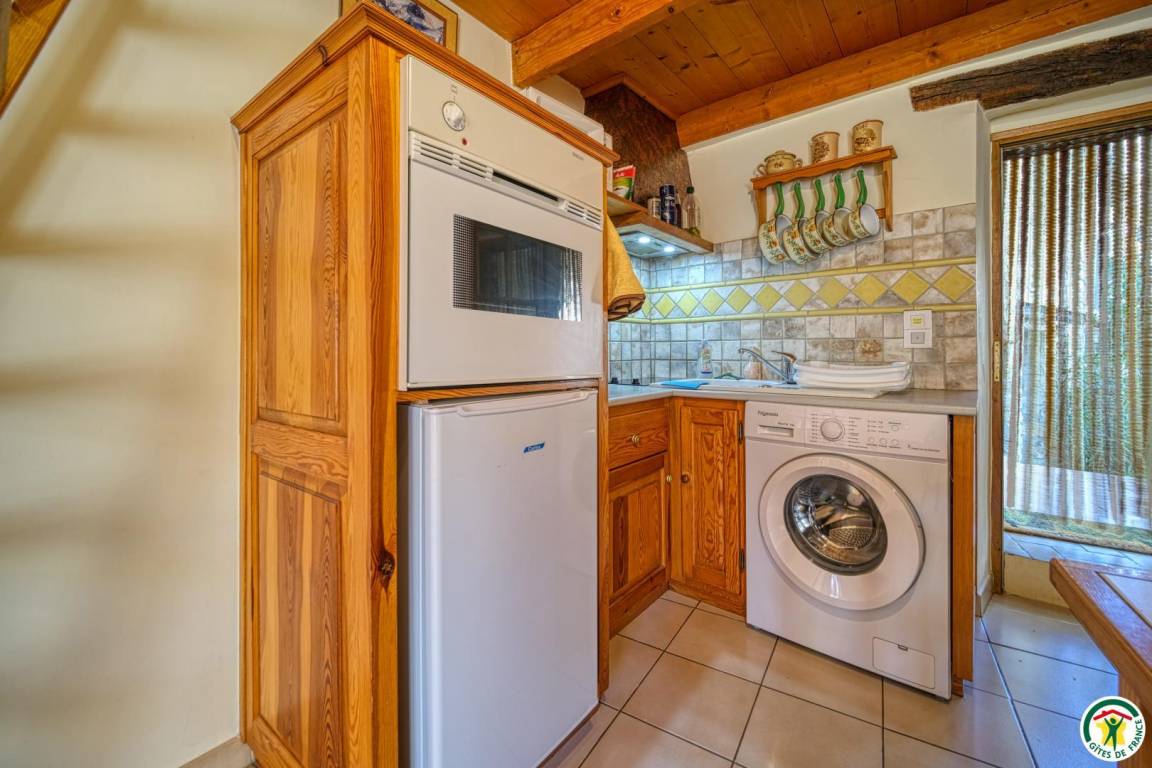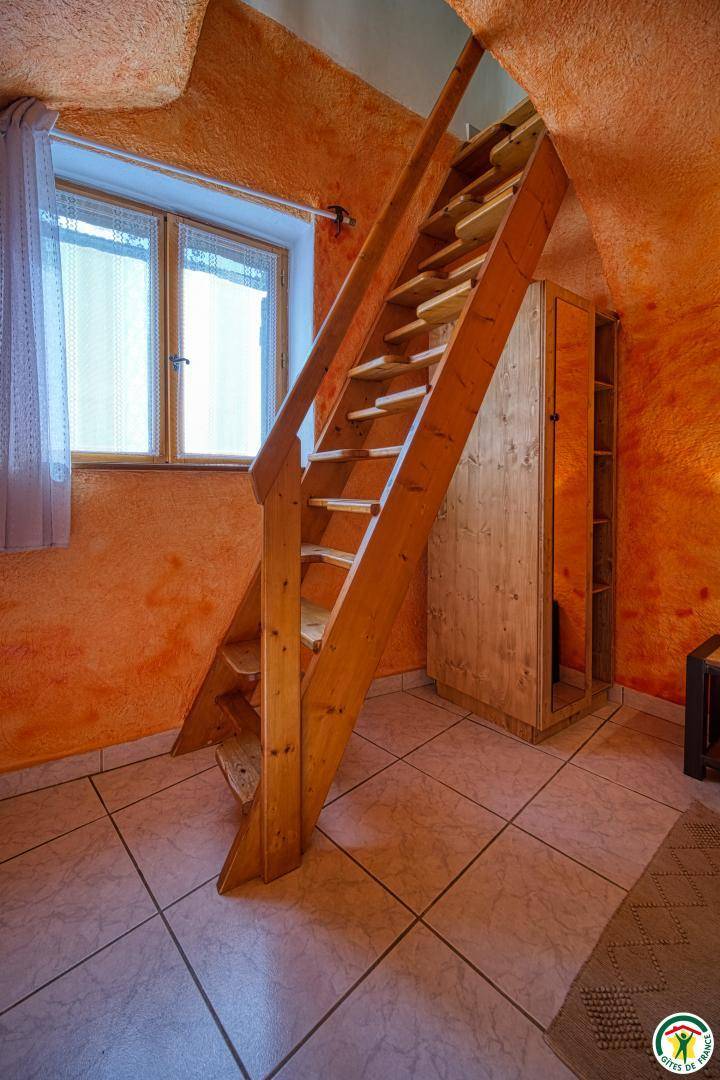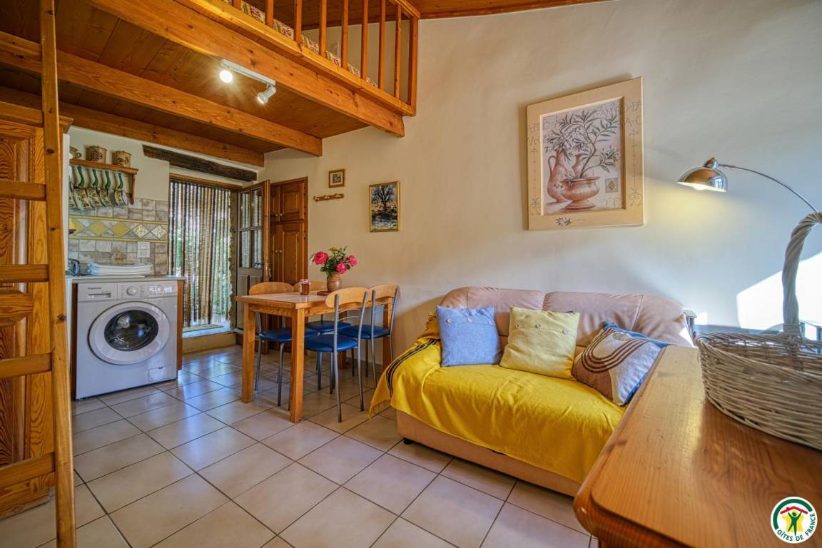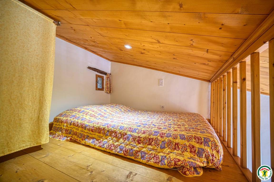 Küchenzeile, Wohnzimmer mit Zwischengeschoss (1 Bett 140 cm). Erdgeschoss (Zugang über eine Steintreppe): 1 Schlafzimmer (1 Bett 140 cm) mit Bad (Dusche) und WC. Parkplatz in der Nähe.