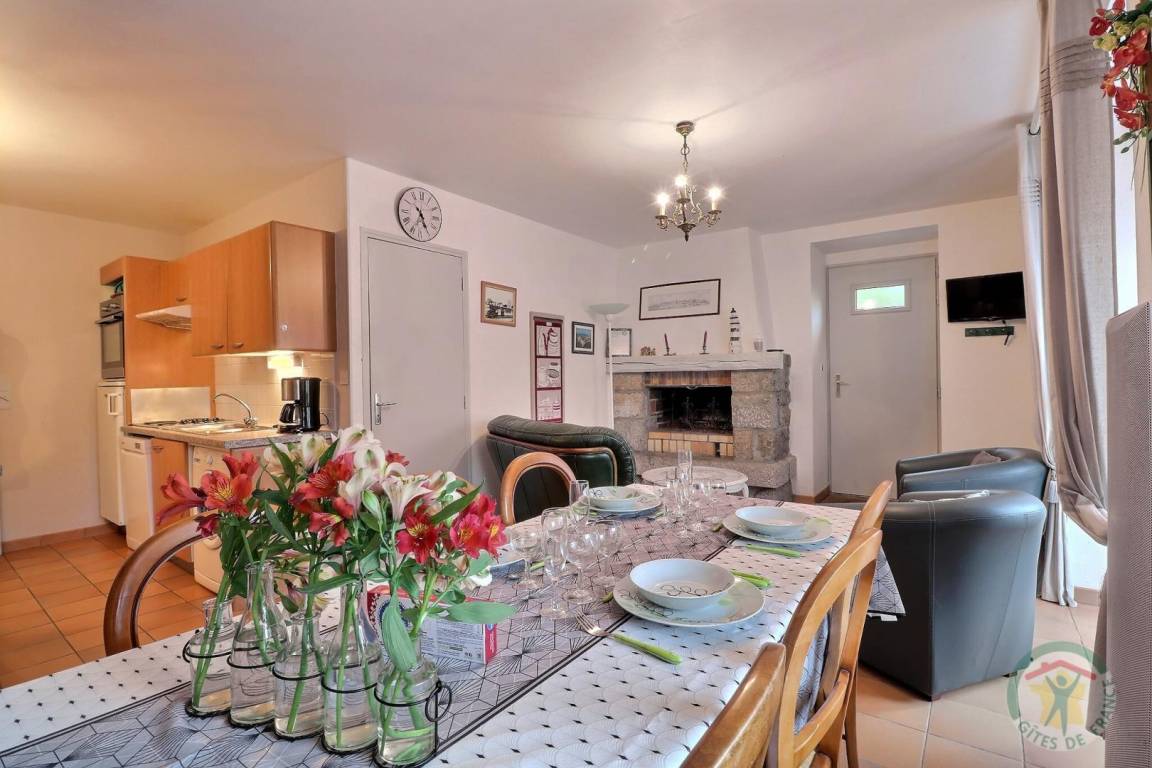 Ebenerdig: Esszimmer mit Küche und Wohnzimmer mit Kamin, ein Schlafzimmer mit 1 Doppelbett 140, ein Schlafzimmer mit 3 Einzelbetten 90, Badezimmer und separates WC. Eigene Terrasse mit Gartenmöbeln und Grill. WLAN im Gemeinschaftsraum. Elektrische Heizung im Mietpreis inbegriffen.