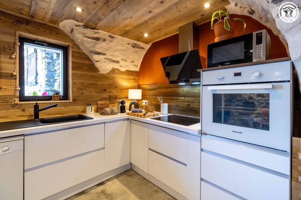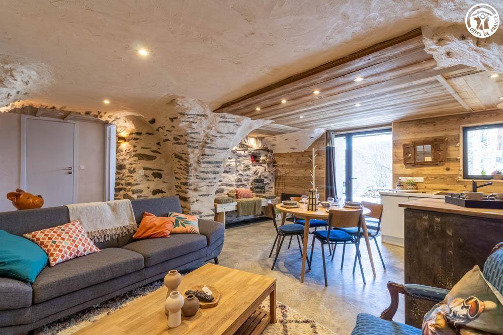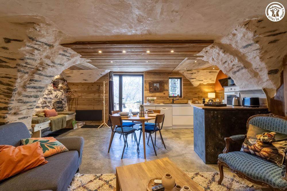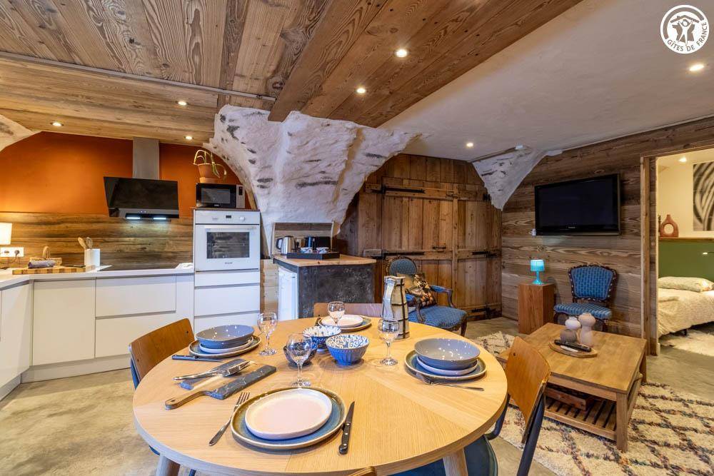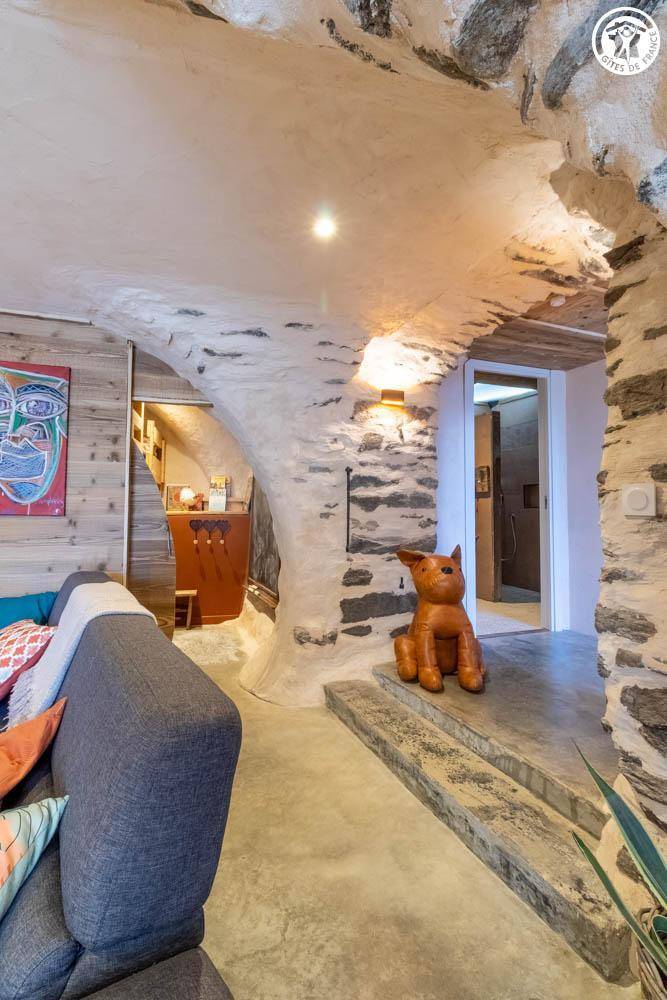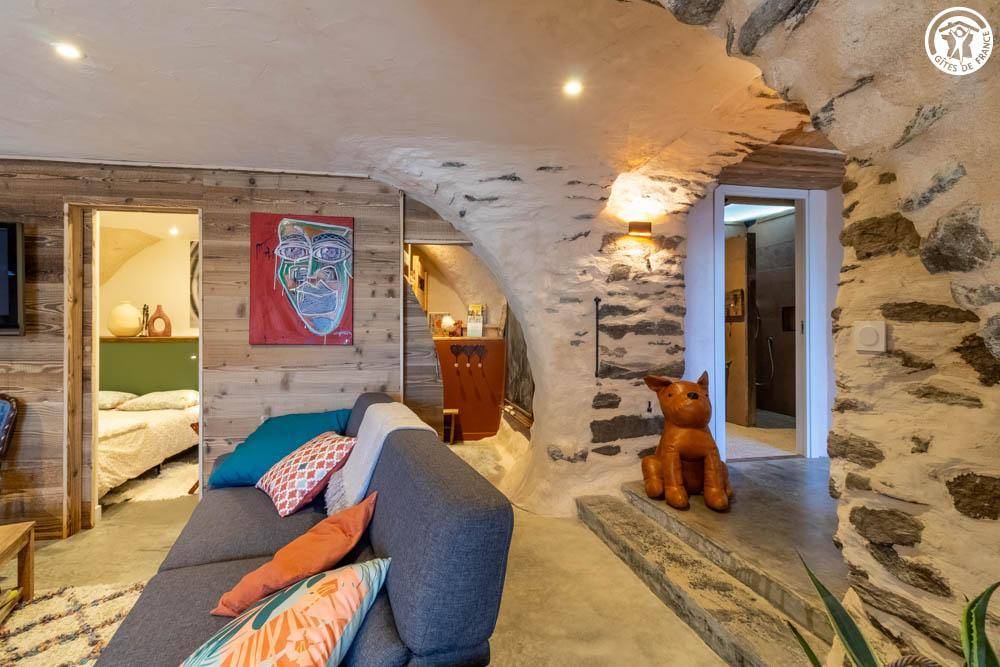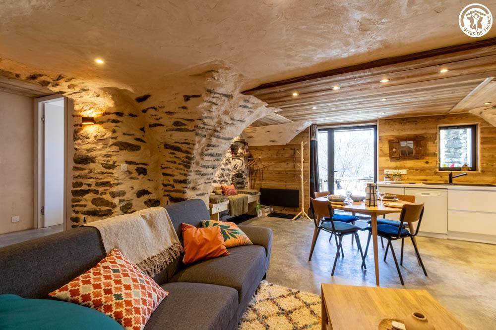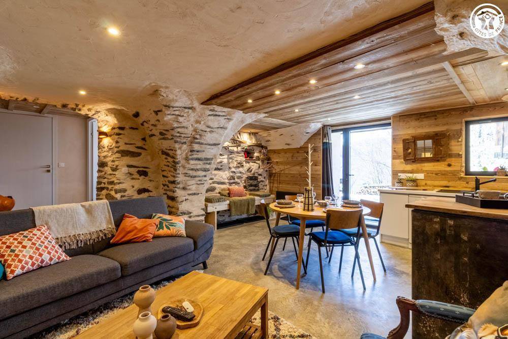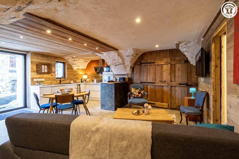 Charmantes Apartment mit viel Charakter. Die gelungene Kombination aus Stein und Holz, Modernem und Antikem verleiht diesem Apartment mit seinem gewölbten Interieur eine einzigartige Note. Wunderschöne Südwestlage auf der Sonnenseite des Maurienne-Tals. Unverbaubarer Blick auf die Gipfel der Thabor-Bergkette.