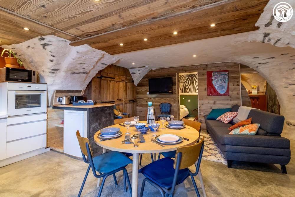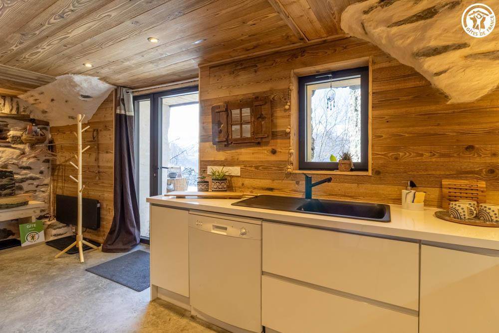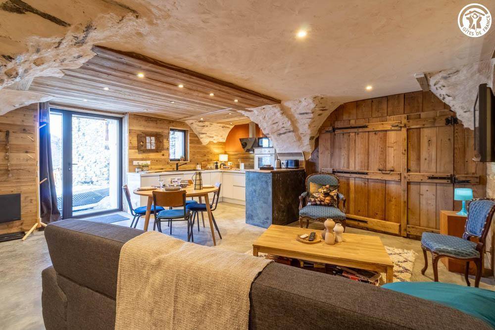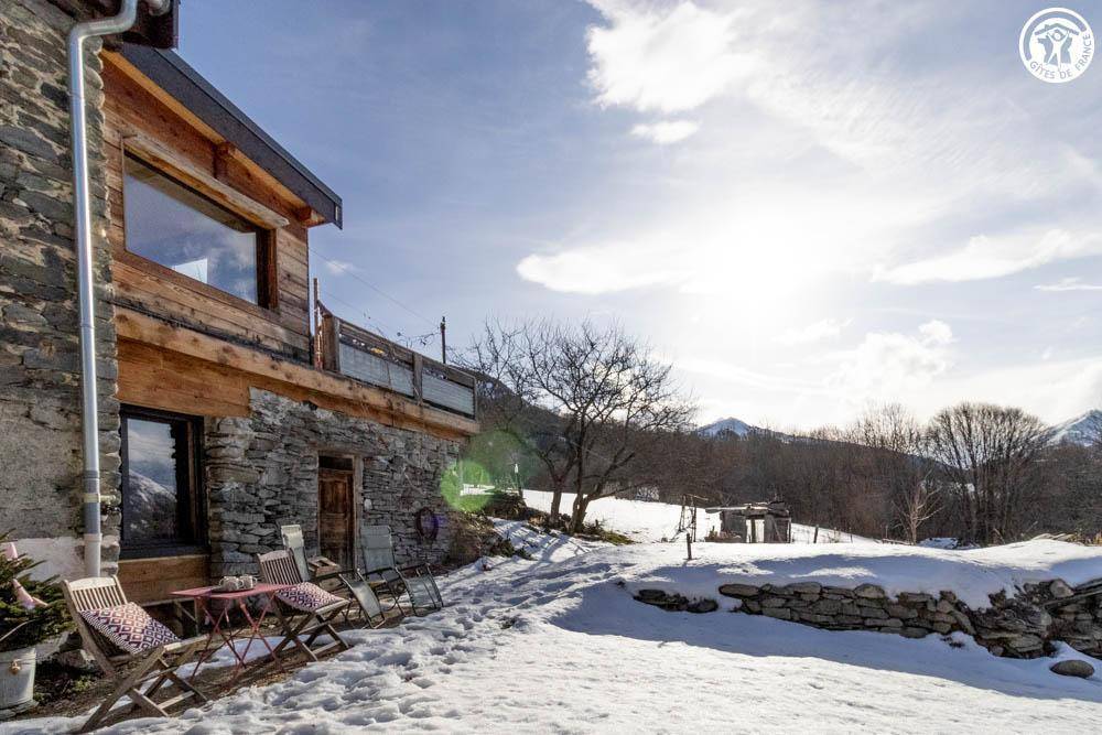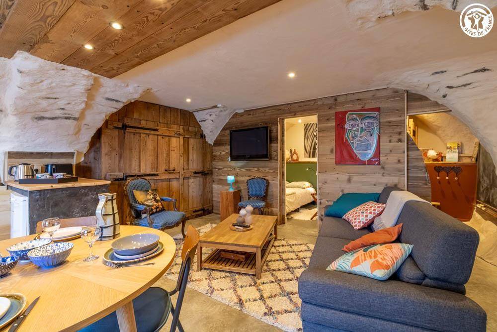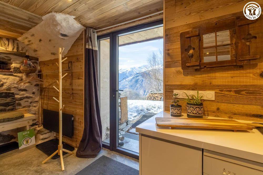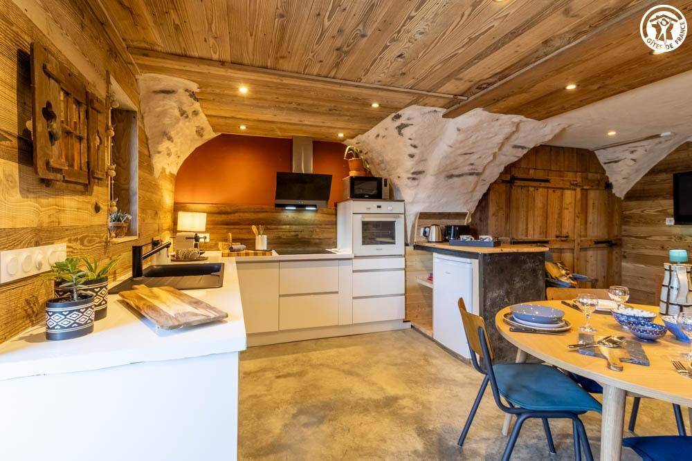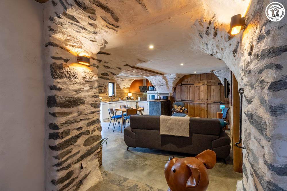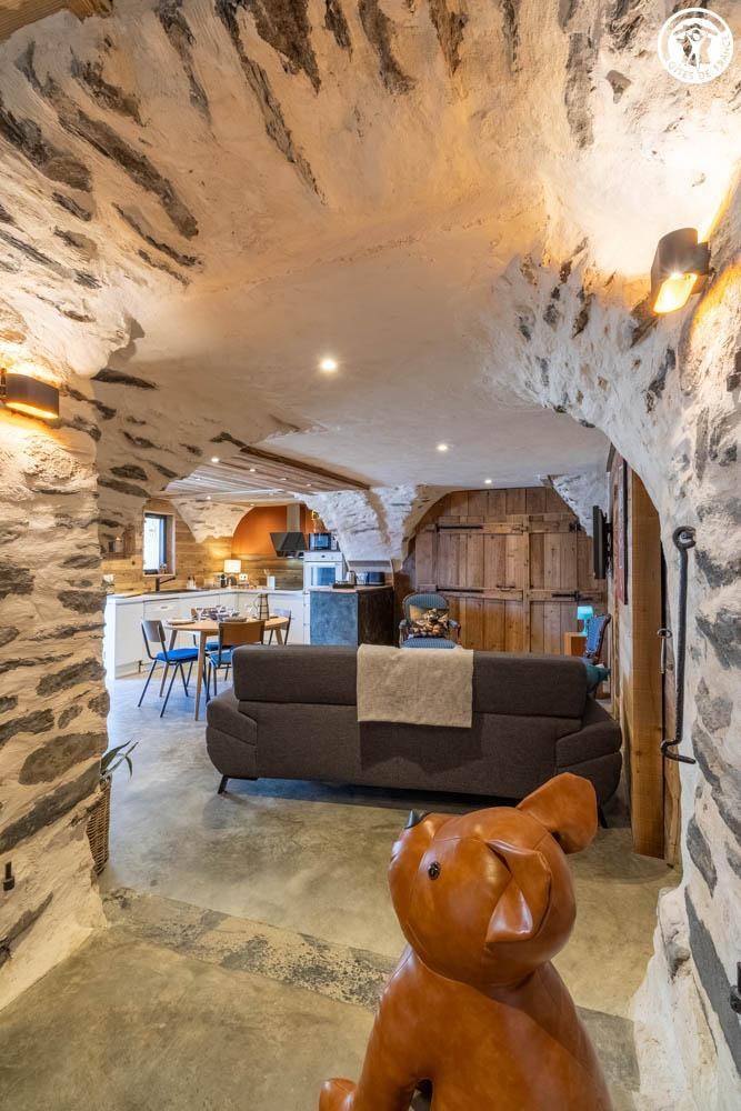 Charmantes Apartment mit viel Charakter. Die gelungene Kombination aus Stein und Holz, Modernem und Antikem verleiht diesem Apartment mit seinem gewölbten Interieur eine einzigartige Note. Wunderschöne Südwestlage auf der Sonnenseite des Maurienne-Tals. Unverbaubarer Blick auf die Gipfel der Thabor-Bergkette.