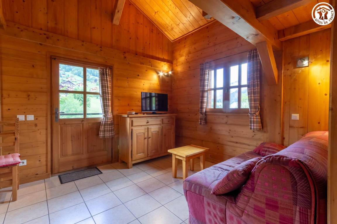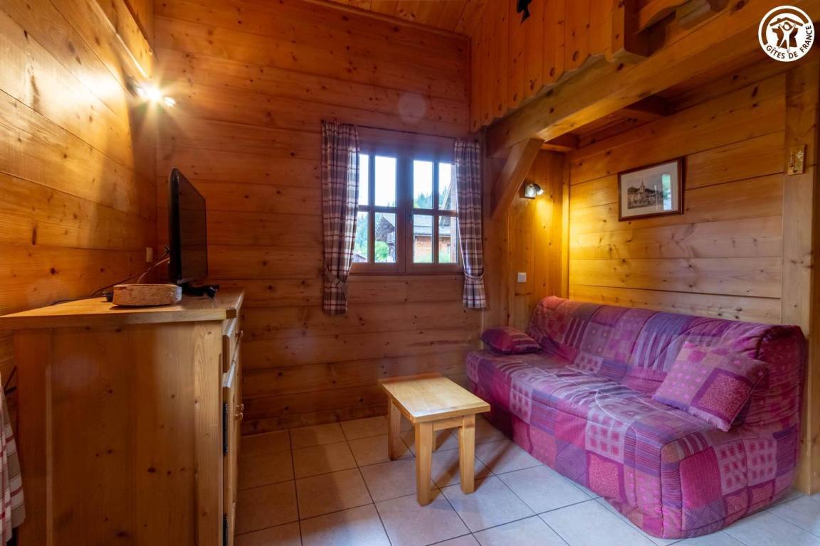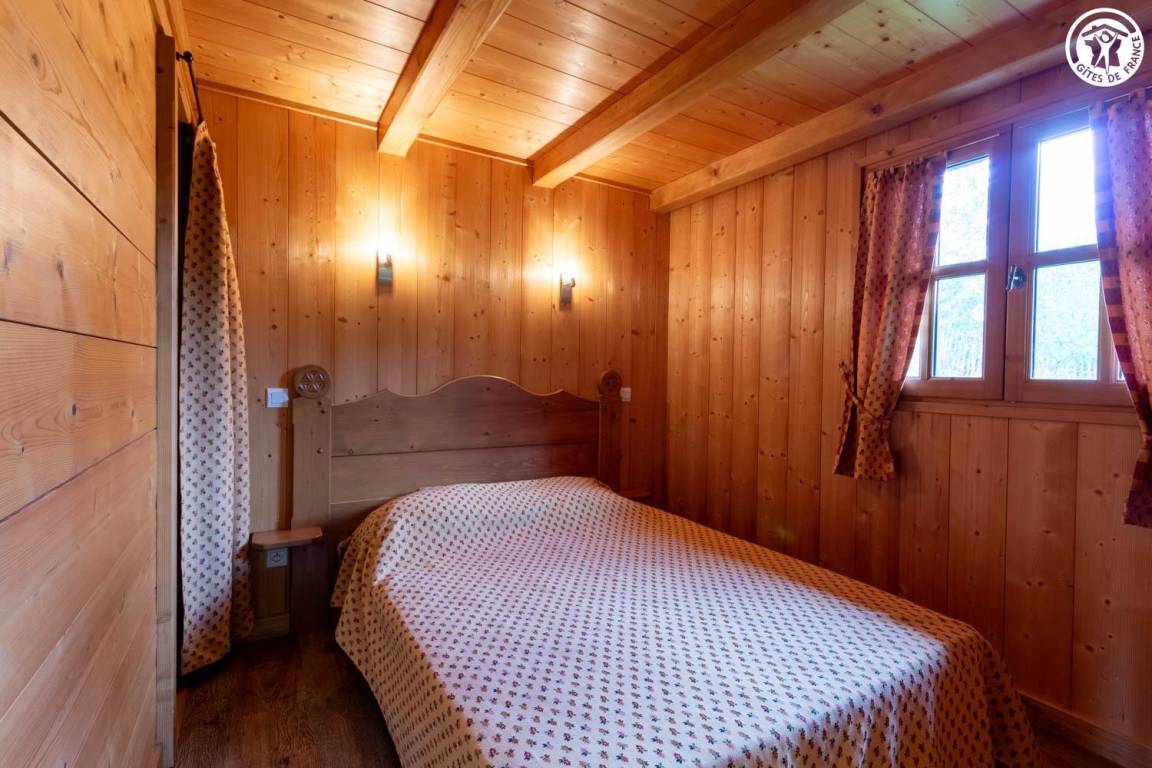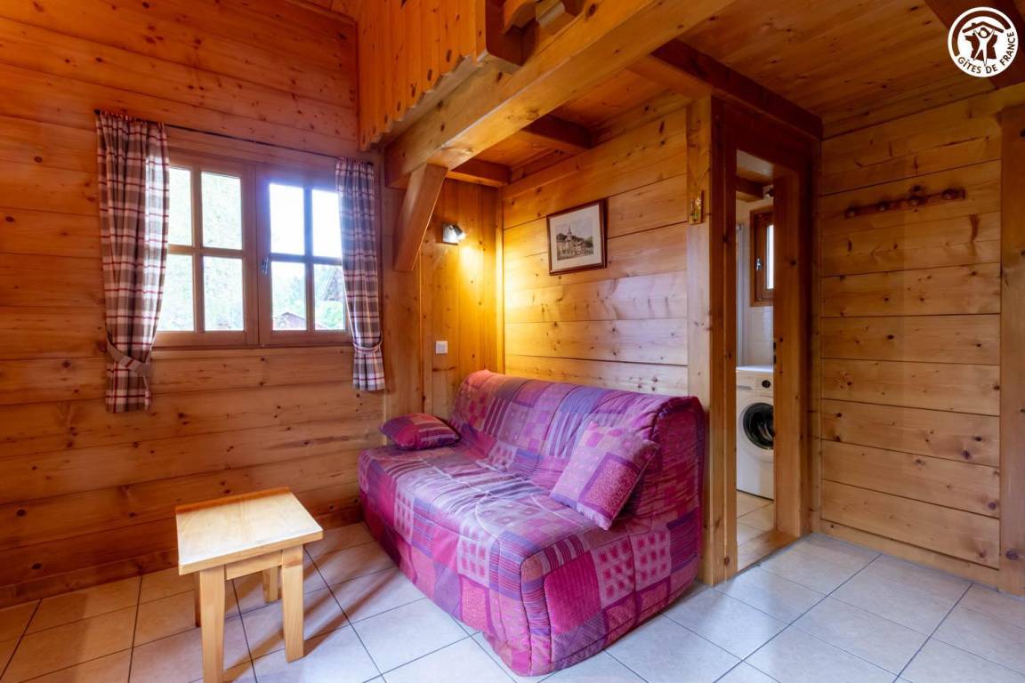 Freistehendes Chalet mit Mezzanin in einer Anlage mit 3 weiteren Chalets, die ganzjährig vermietet werden. Erdgeschoss: Wohnzimmer - Küche, Badezimmer (Dusche), separates WC, 1 Schlafzimmer (1 Doppelbett 140x190 cm). Mezzanin: 3 Einzelbetten 90x190 cm. Terrasse vor dem Ferienhaus. Grundstück. Gemeinsamer Grill. Parkplatz vor dem Ferienhaus.