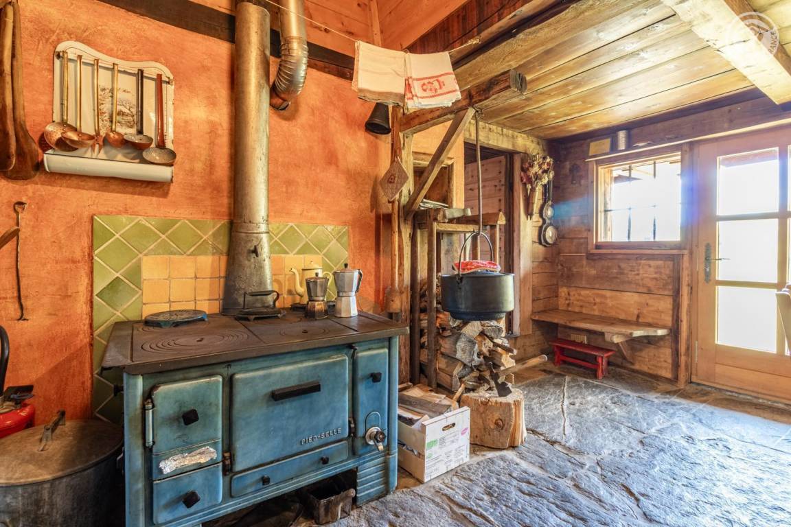 Alpenchalet mitten in der Natur, inmitten einer 10 Hektar großen Alm, am Ende eines Weges. Vom Dorf aus erreichbar über 7 km Asphaltstraße und dann 3 km befahrbaren Schotterweg (bitte mit den Eigentümern besprechen). Auf 3 Ebenen. Im Erdgeschoss: Wohnzimmer, Küche und Speisekammer, 1 Schlafzimmer mit Zugang zur Balkonterrasse (1 Doppelbett 140x190 cm / 1 Einzelbett 90x190 cm - Höhe stellenweise weniger als 1,80 m aufgrund der Balken), Badezimmer (Dusche, Badewanne und WC).