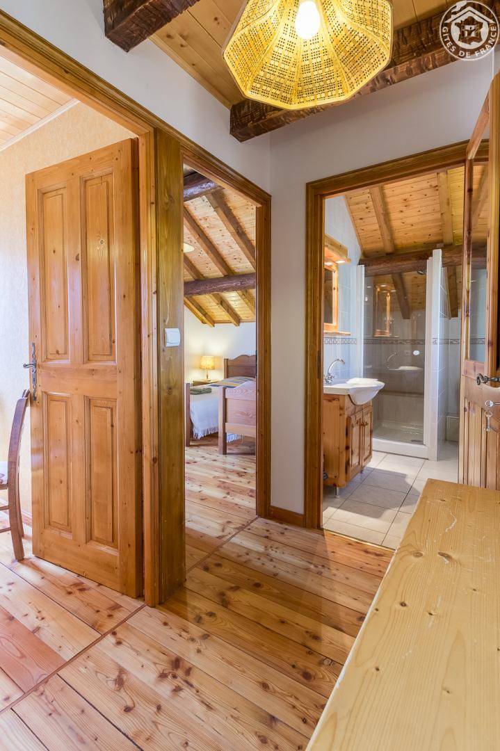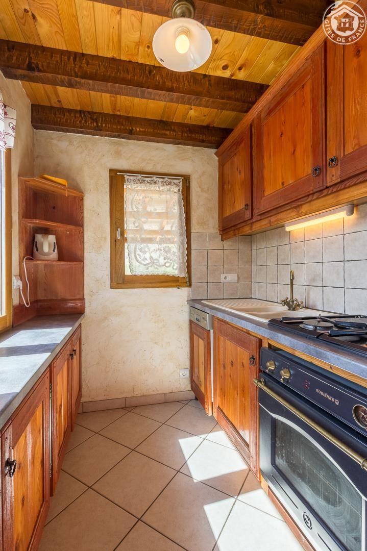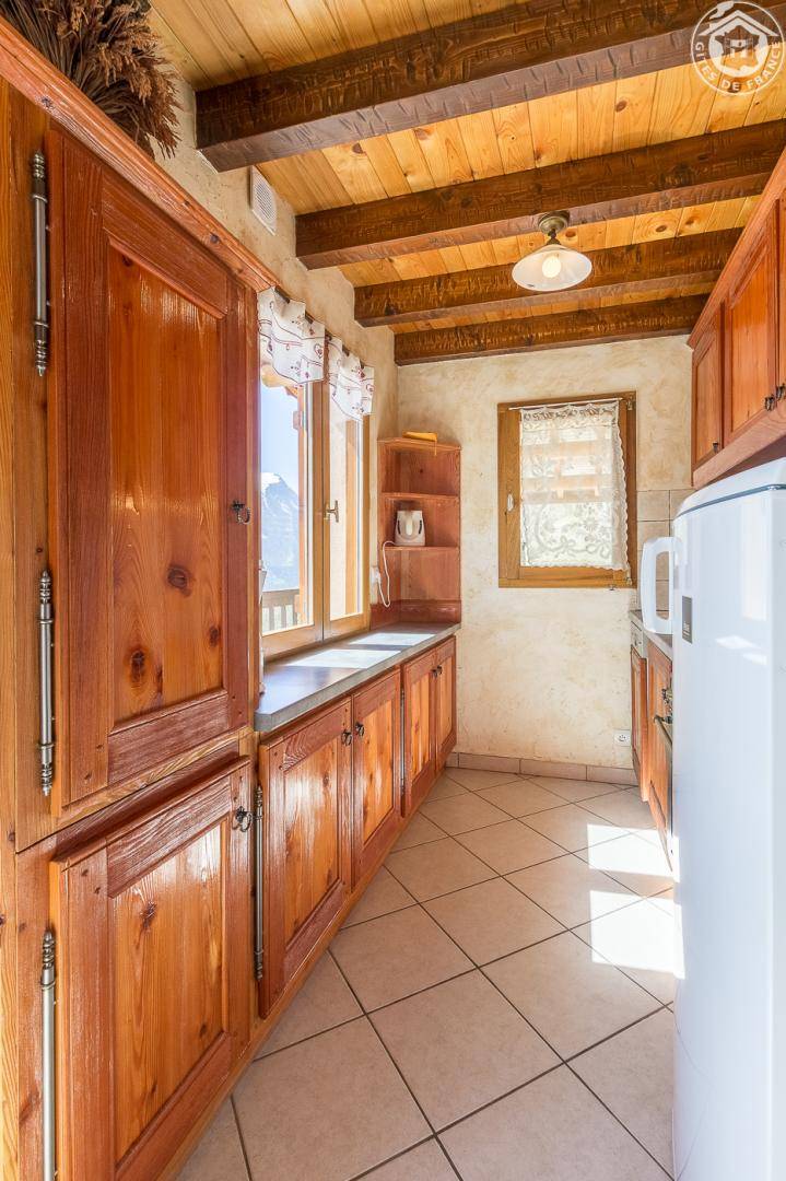 Individuelles Haus. Erdgeschoss: Wohnzimmer mit Küchenbereich. 1. Stock: 2 Schlafzimmer (1 Doppelbett / 2 Einzelbetten), Badezimmer (Dusche), Balkon, Holzterrasse, Carport, Grundstück. Vermietung von Laken und Haushaltswäsche. Ski Les Bottières verbindet La Toussuire 1 km. Wohnfläche 58 m².