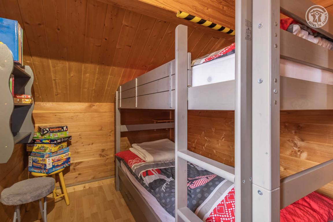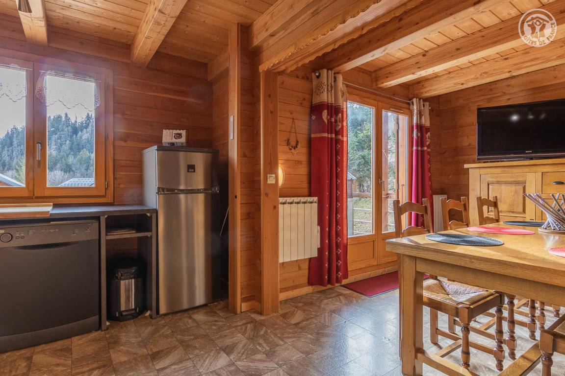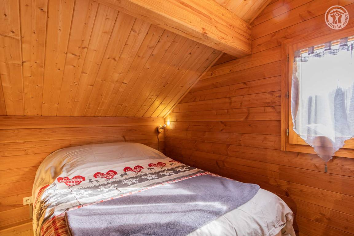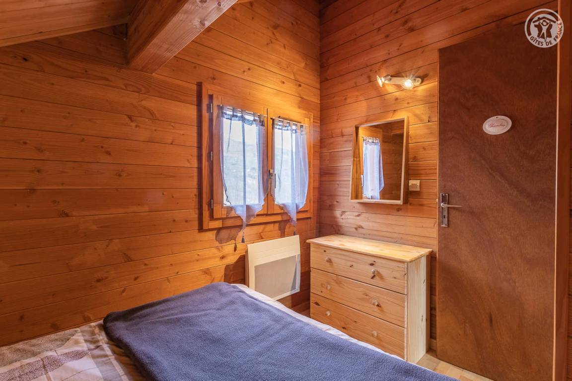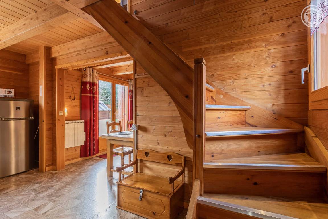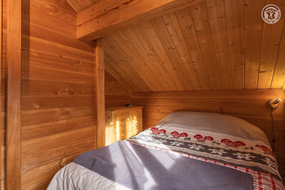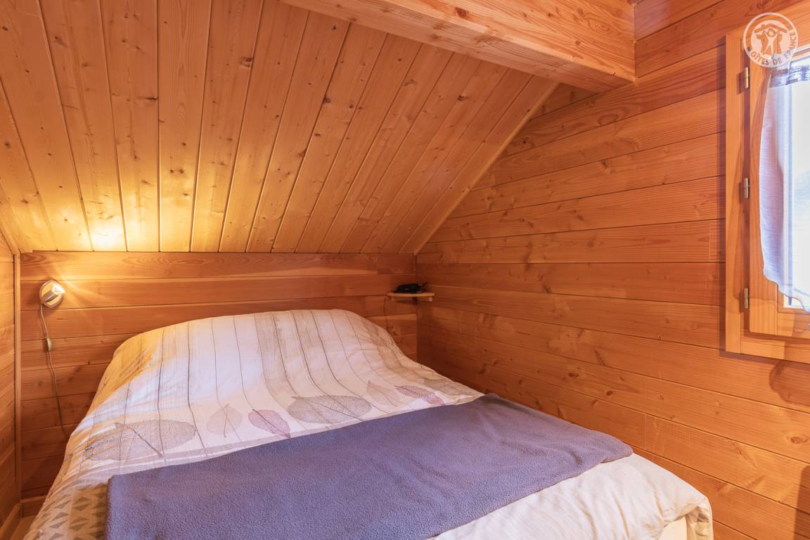 Individuelles Chalet auf 2 Ebenen. Zugang zu Fuß 50 m über einen Grasweg vom gemeinsamen Parkplatz, dann Eingang zum Chalet über eine Außentreppe. Erdgeschoss: Eingang, Wohnzimmer-Küche mit Lounge-Bereich mit Zugang zur Terrasse, separates WC. 1. Stock: 3 kleine schräge Schlafzimmer (1 Doppelbett 140x190 cm / 1 Doppelbett 140x190 cm / 1 Einzelbett 90x190 cm), Duschbad (Dusche mit 1,70 m Höhe, WC).