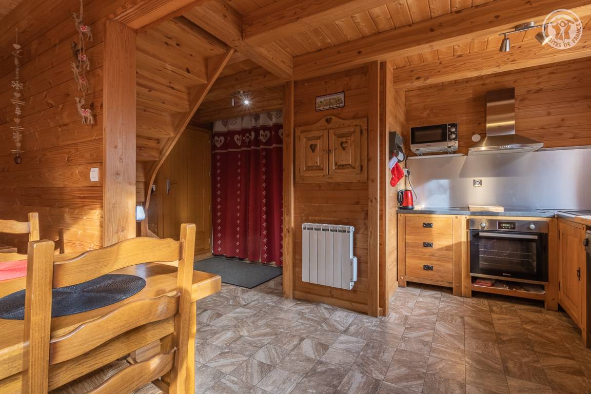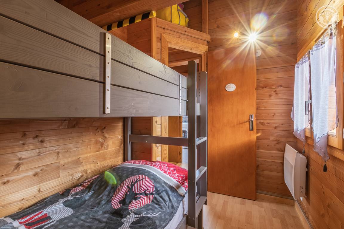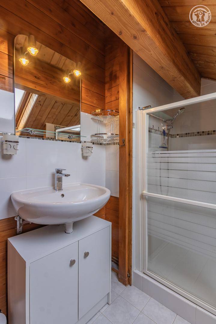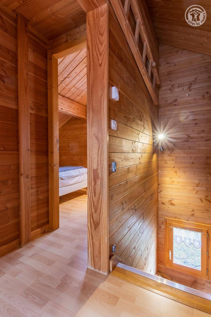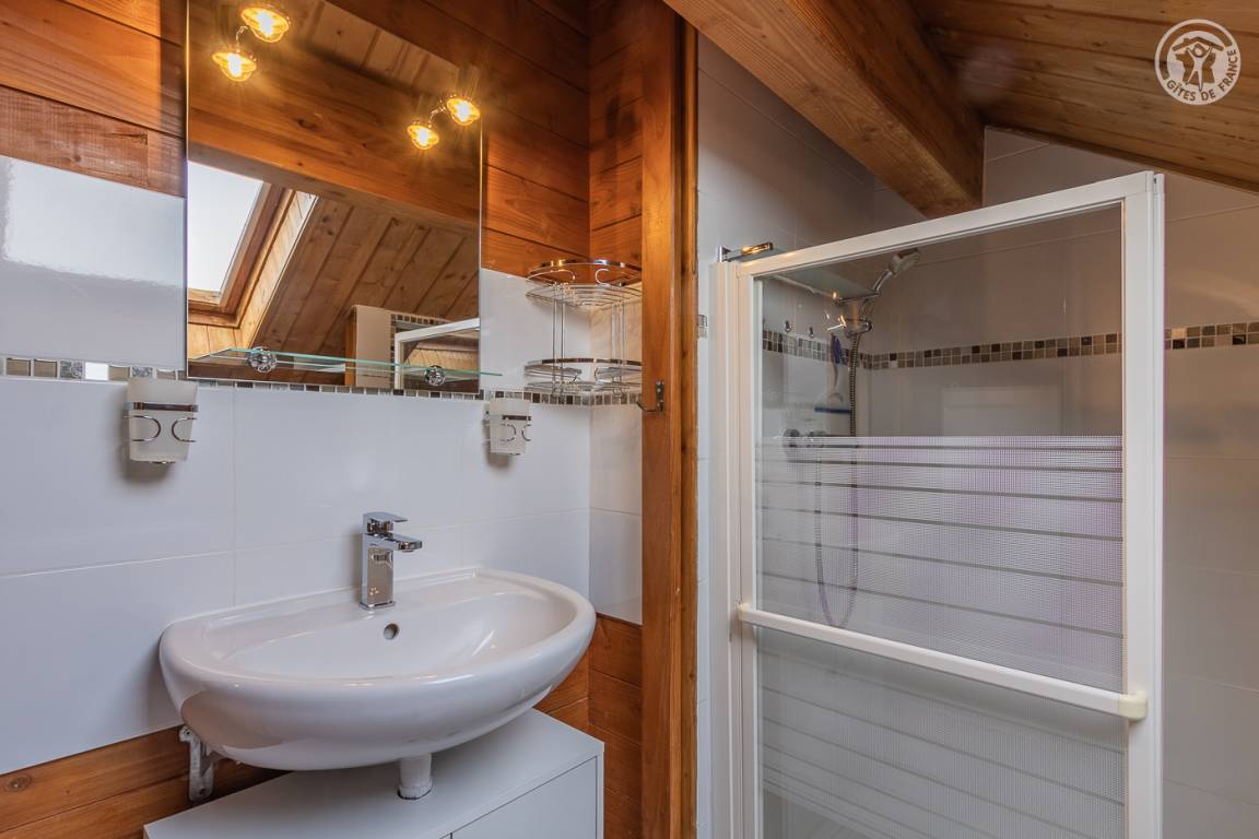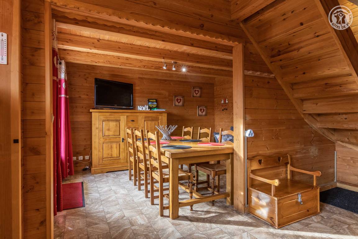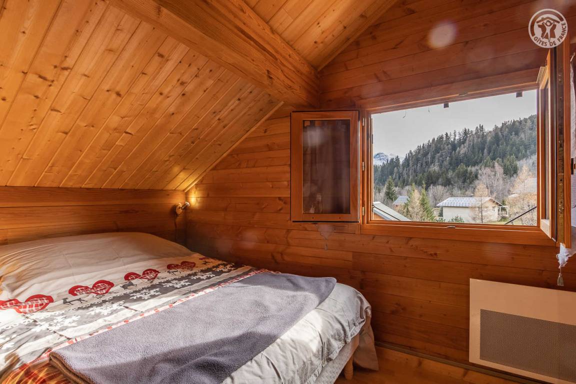 Individuelles Chalet auf 2 Ebenen. Zugang zu Fuß 50 m über einen Grasweg vom gemeinsamen Parkplatz, dann Eingang zum Chalet über eine Außentreppe. Erdgeschoss: Eingang, Wohnzimmer-Küche mit Lounge-Bereich mit Zugang zur Terrasse, separates WC. 1. Stock: 3 kleine schräge Schlafzimmer (1 Doppelbett 140x190 cm / 1 Doppelbett 140x190 cm / 1 Einzelbett 90x190 cm), Duschbad (Dusche mit 1,70 m Höhe, WC).
