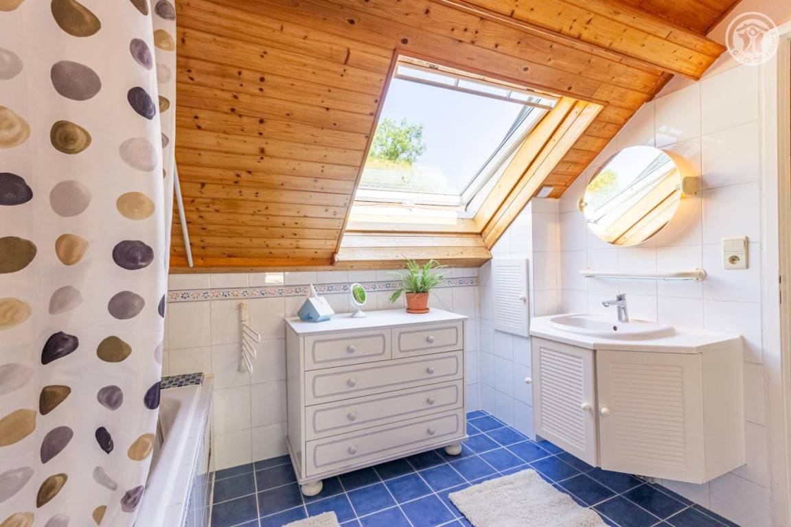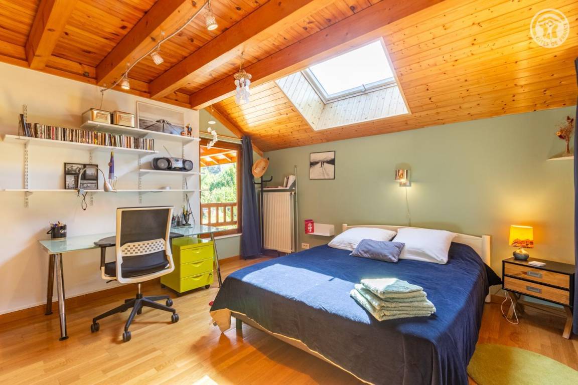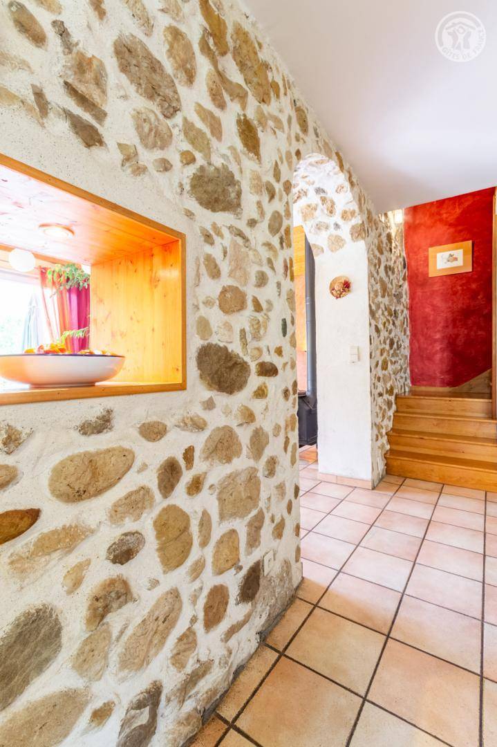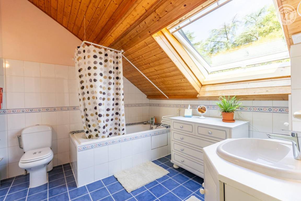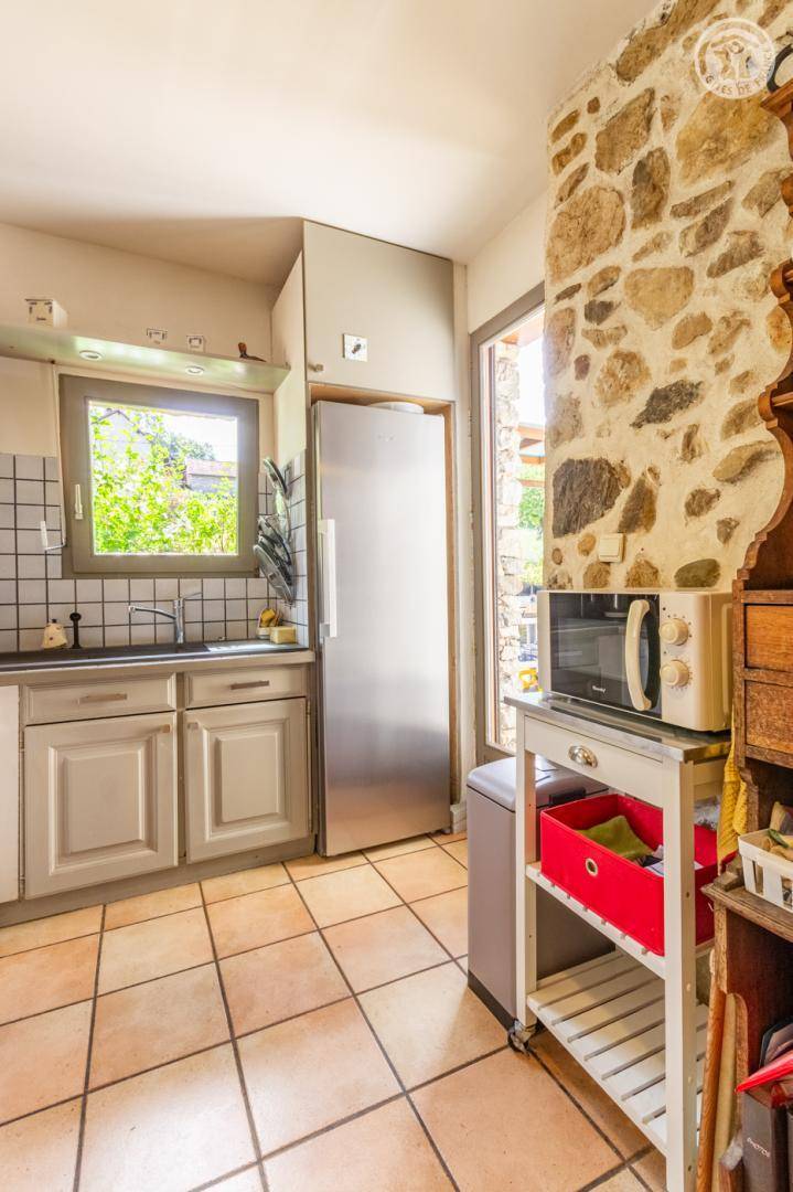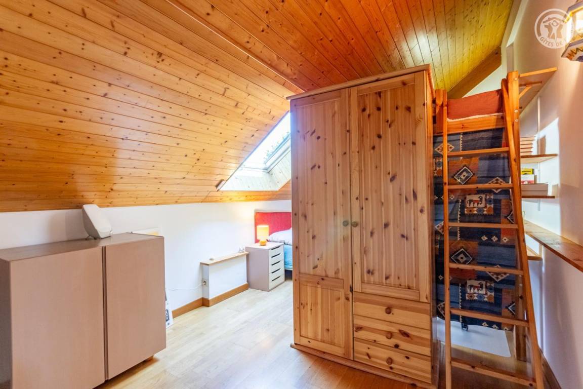 Ferienhaus auf 2 Ebenen mit halbem Treppenabsatz, bestehend aus im Erdgeschoss: einem Eingang, einem großen Flur mit Küchenbereich, einem Wohnzimmer, 1 Schlafzimmer (1 elektrisches Doppelbett 180 x 200 cm) mit eigenem Bad (Dusche), separatem WC, Waschküche Zimmer (Waschmaschine und Gefrierschrank). Obergeschoss: 1 Schlafzimmer (1 Doppelbett 160x200 cm), 1 Schlafzimmer am Hang (1 Einzelbett 130x190 cm) mit integriertem Zwischengeschoss am Hang (Zugang über eine Leiter - 1 Matratze auf Untergestell ohne Untergestell für 2 Personen 140x190 cm), a Badezimmer (Badewanne und WC), ein Wohnzimmer im Zwischengeschoss (Heimkino). Terrasse und Garten.