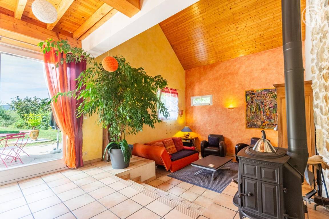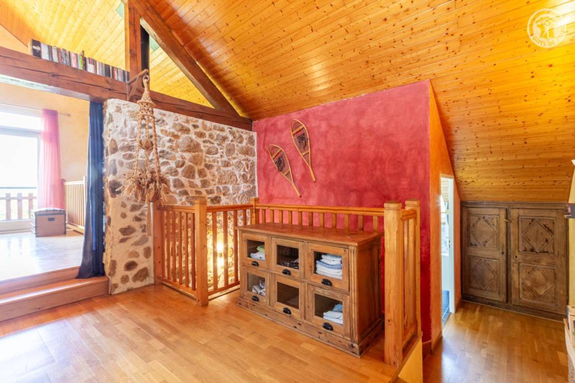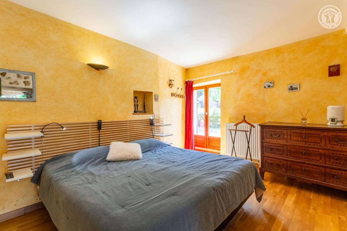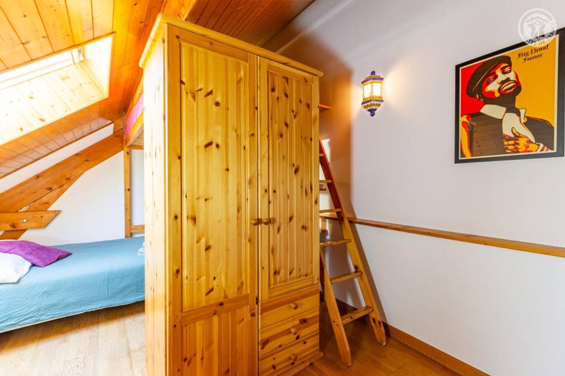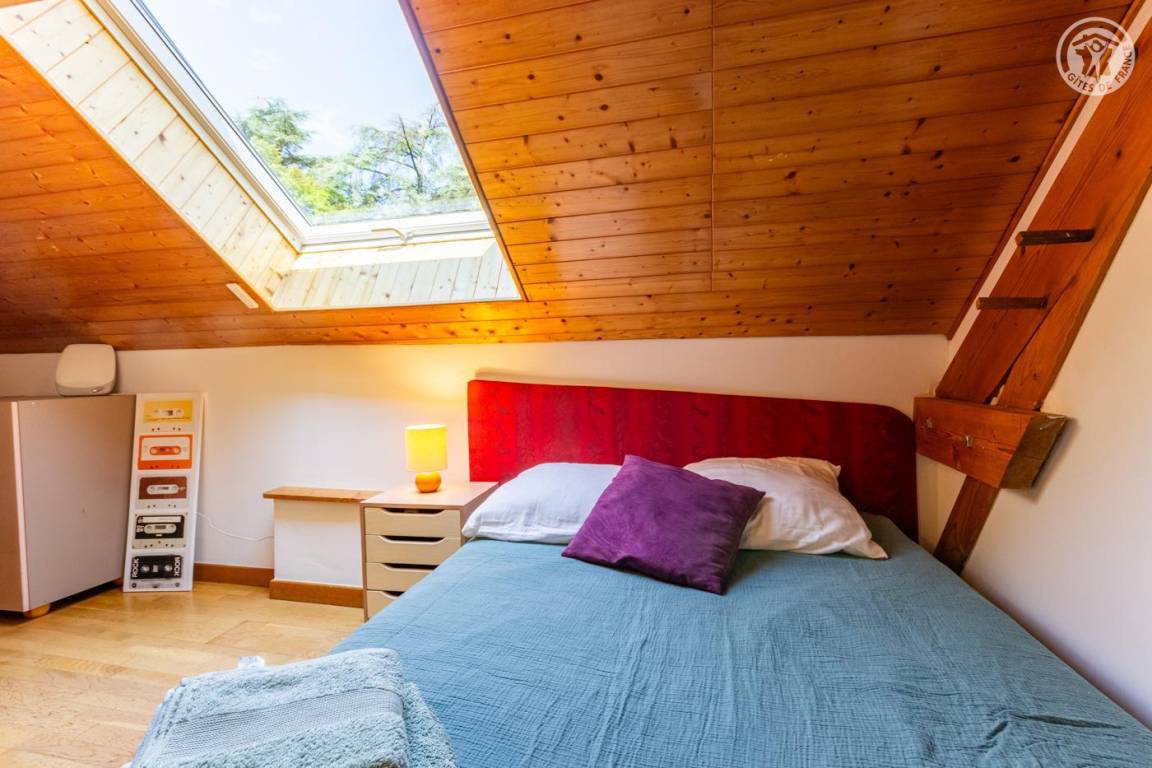 Ferienhaus auf 2 Ebenen mit halbem Treppenabsatz, bestehend aus im Erdgeschoss: einem Eingang, einem großen Flur mit Küchenbereich, einem Wohnzimmer, 1 Schlafzimmer (1 elektrisches Doppelbett 180 x 200 cm) mit eigenem Bad (Dusche), separatem WC, Waschküche Zimmer (Waschmaschine und Gefrierschrank). Obergeschoss: 1 Schlafzimmer (1 Doppelbett 160x200 cm), 1 Schlafzimmer am Hang (1 Einzelbett 130x190 cm) mit integriertem Zwischengeschoss am Hang (Zugang über eine Leiter - 1 Matratze auf Untergestell ohne Untergestell für 2 Personen 140x190 cm), a Badezimmer (Badewanne und WC), ein Wohnzimmer im Zwischengeschoss (Heimkino). Terrasse und Garten.