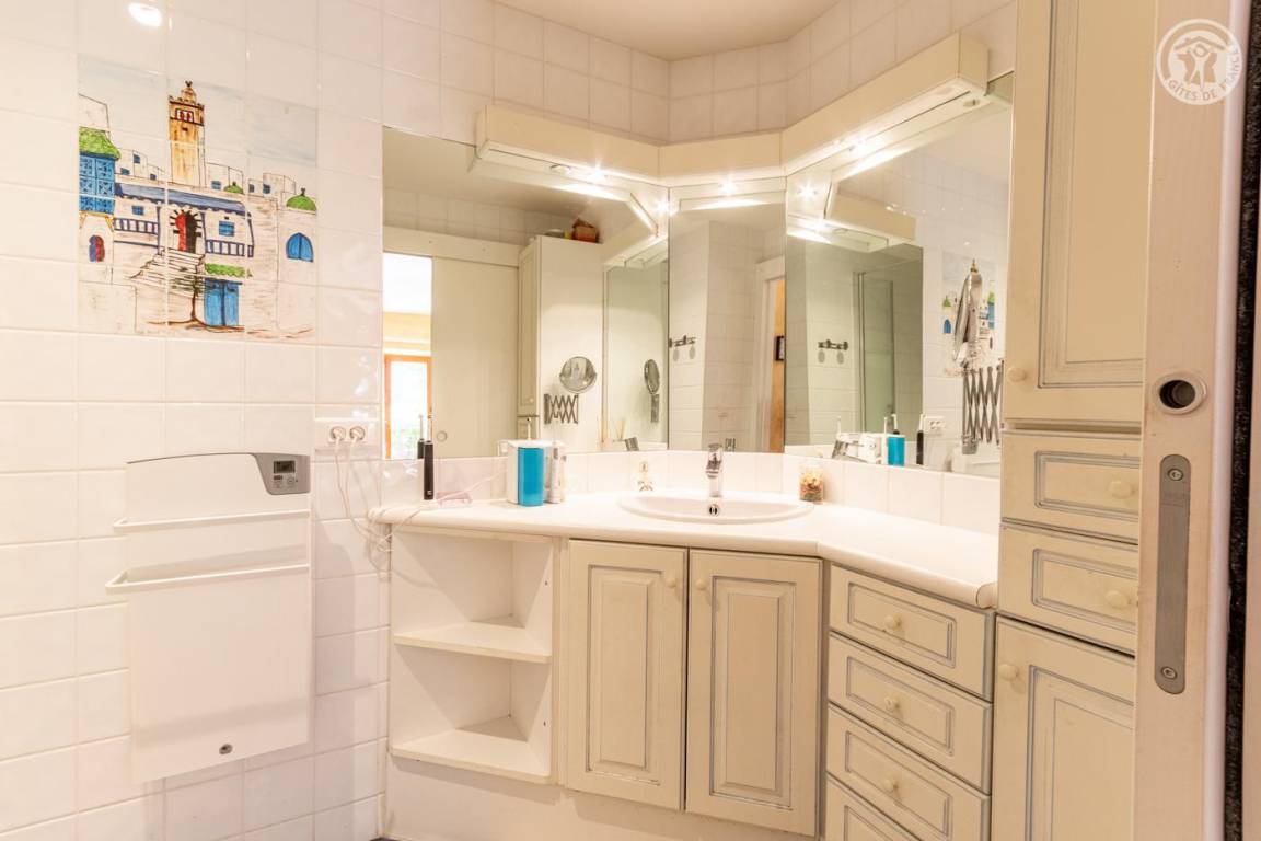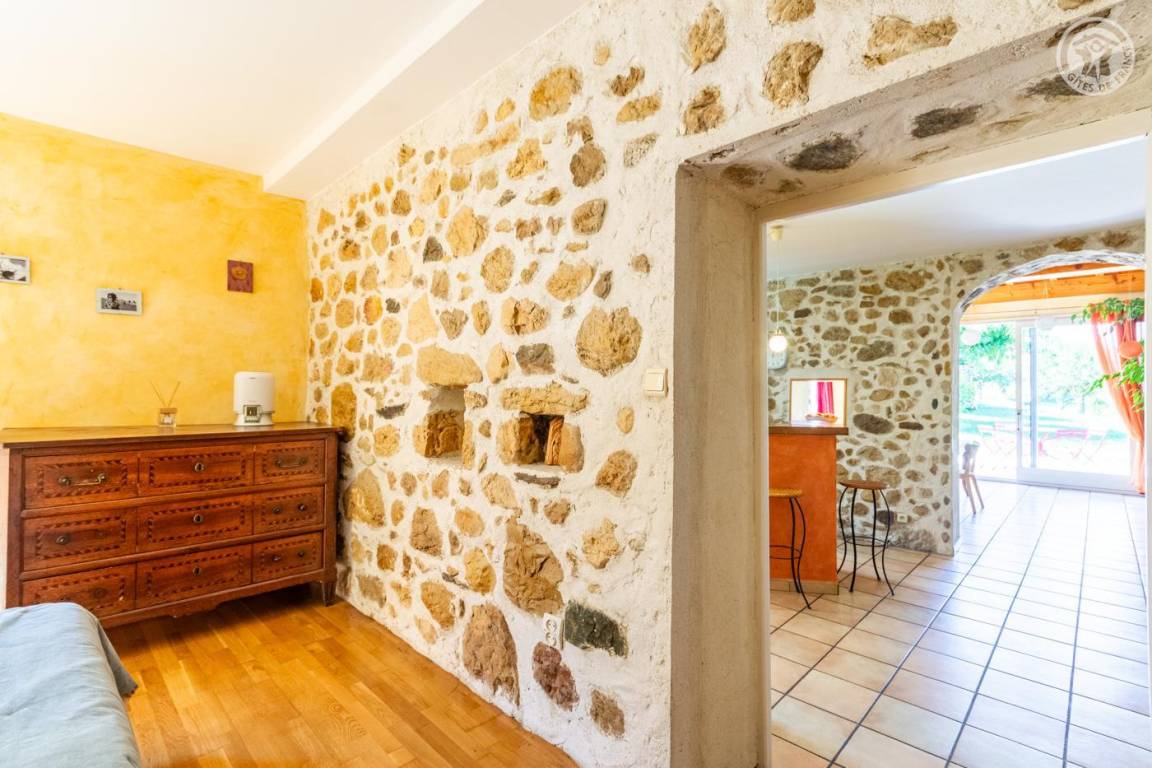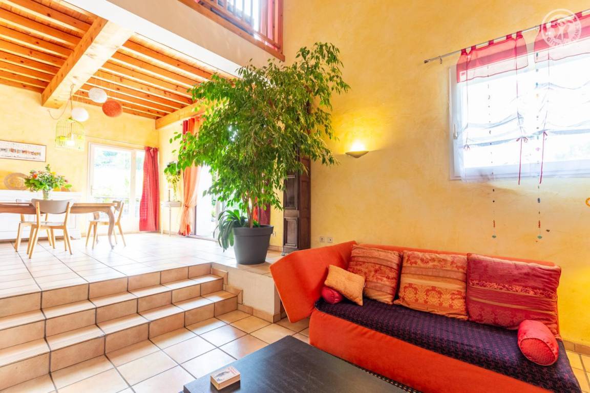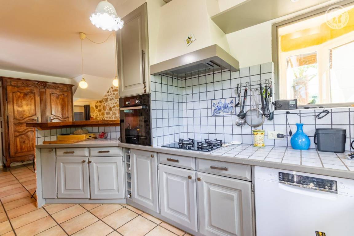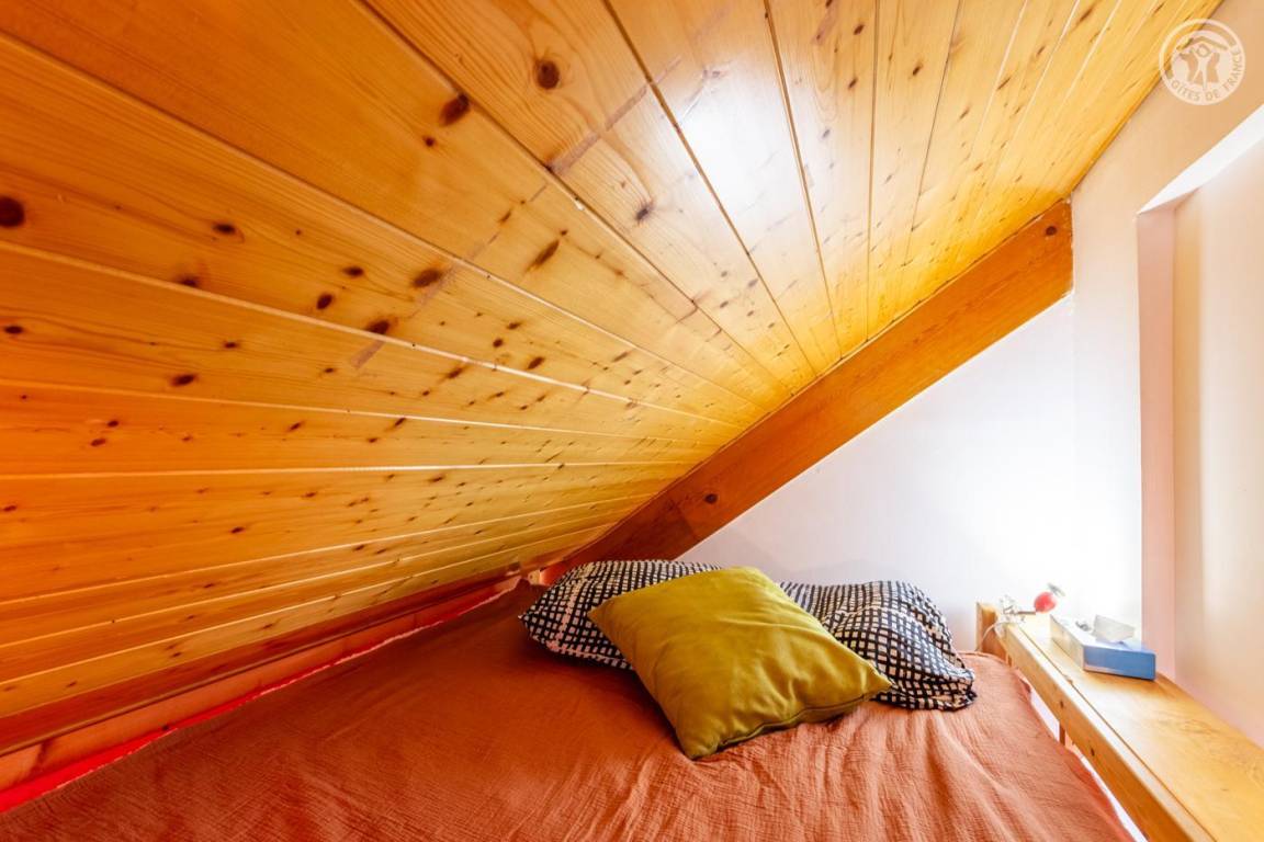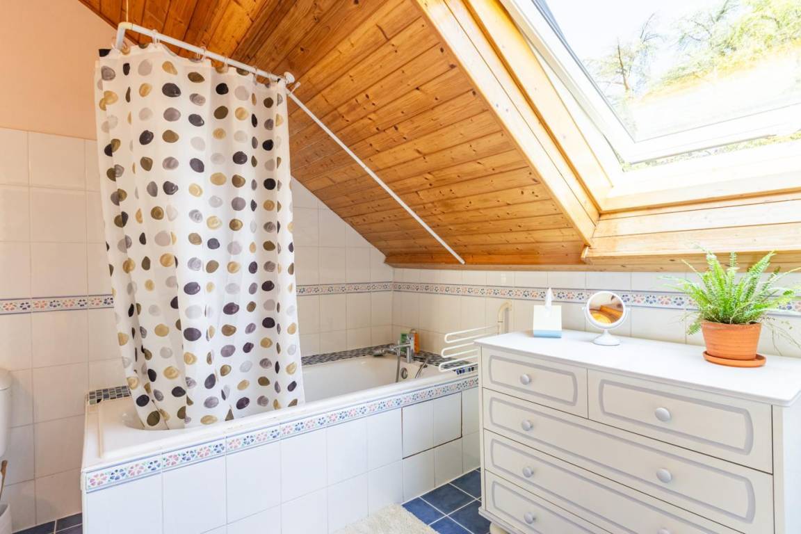 Ferienhaus auf 2 Ebenen mit halbem Treppenabsatz, bestehend aus im Erdgeschoss: einem Eingang, einem großen Flur mit Küchenbereich, einem Wohnzimmer, 1 Schlafzimmer (1 elektrisches Doppelbett 180 x 200 cm) mit eigenem Bad (Dusche), separatem WC, Waschküche Zimmer (Waschmaschine und Gefrierschrank). Obergeschoss: 1 Schlafzimmer (1 Doppelbett 160x200 cm), 1 Schlafzimmer am Hang (1 Einzelbett 130x190 cm) mit integriertem Zwischengeschoss am Hang (Zugang über eine Leiter - 1 Matratze auf Untergestell ohne Untergestell für 2 Personen 140x190 cm), a Badezimmer (Badewanne und WC), ein Wohnzimmer im Zwischengeschoss (Heimkino). Terrasse und Garten.