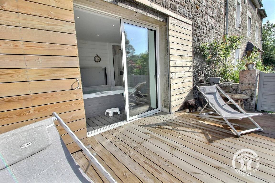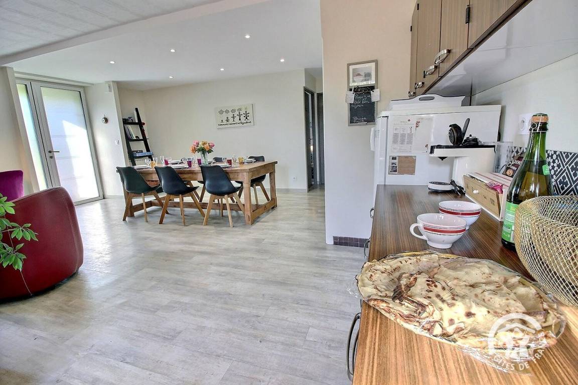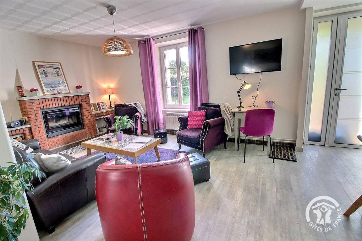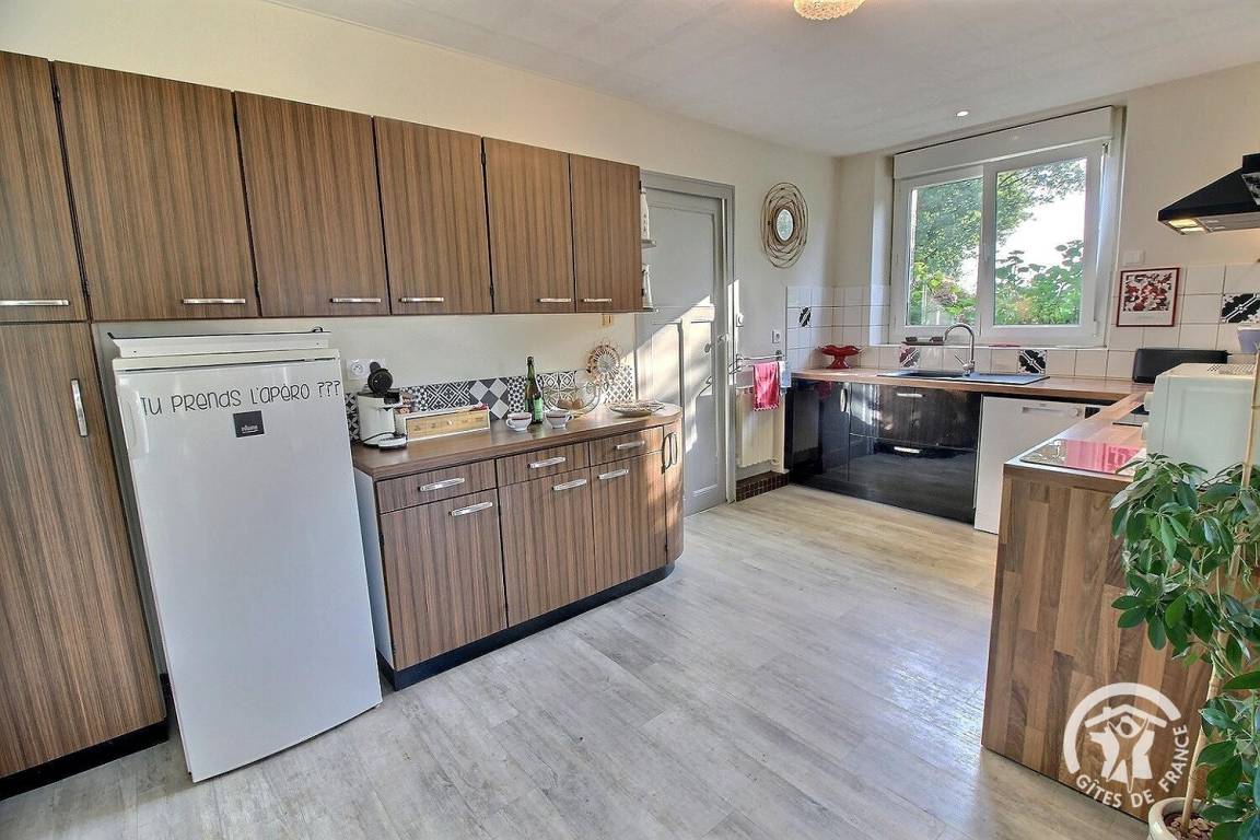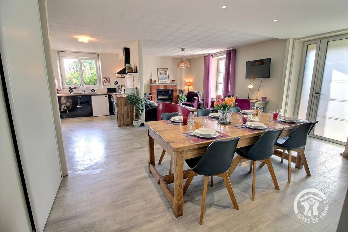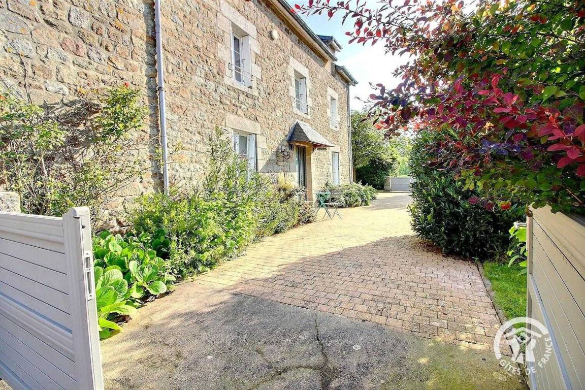 Ganz renovierten Gite aus Stein, auf einem milchwirtschaftlichen Betrieb, in der Nähe von dem Haus der Besitzern, mit Terrasse und abgeschlossenem Garten von 350 qm. Erdgeschoss : eingebauter Küche, Wohnzimmer (Kamin), Esszimmer, Waschküche, WC. 1 Schlafzimmer (1 160x200 Bett). Etage : 3 Schlafzimmer (2 Doppelbetten, 2 Einzelbetten), Stuhl und Babybett. Badezimmer mit WC. Wagenscheune.