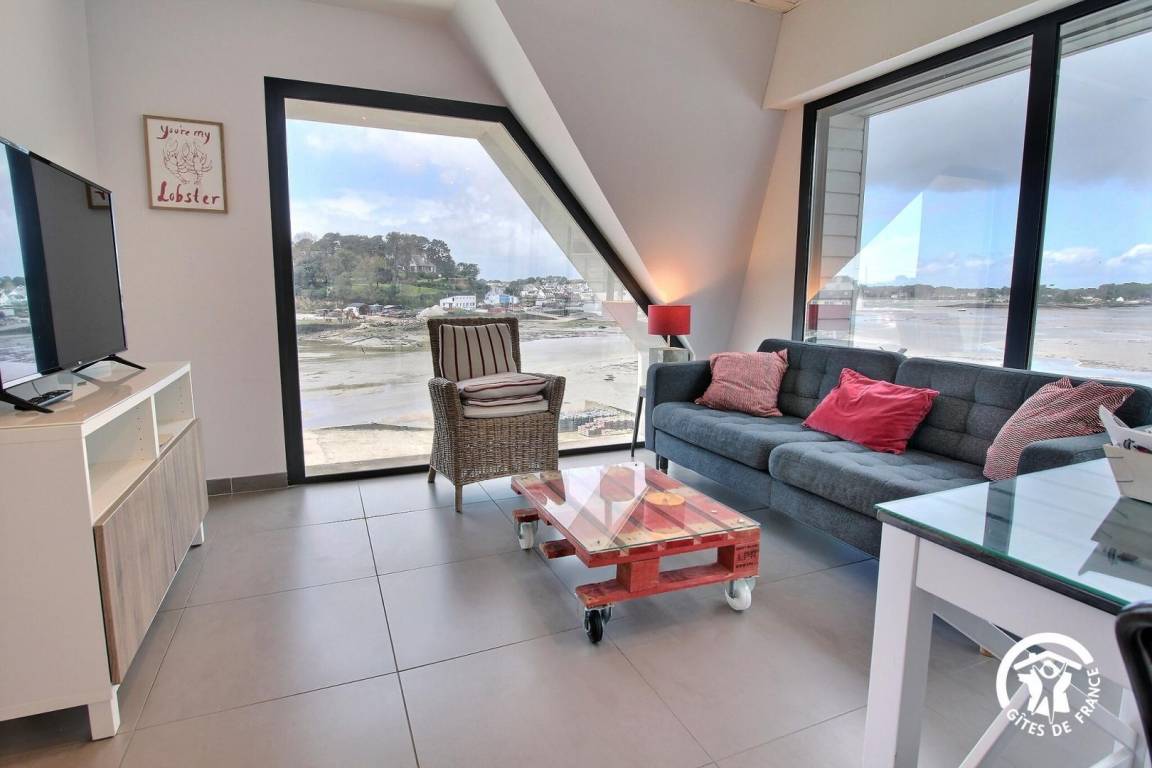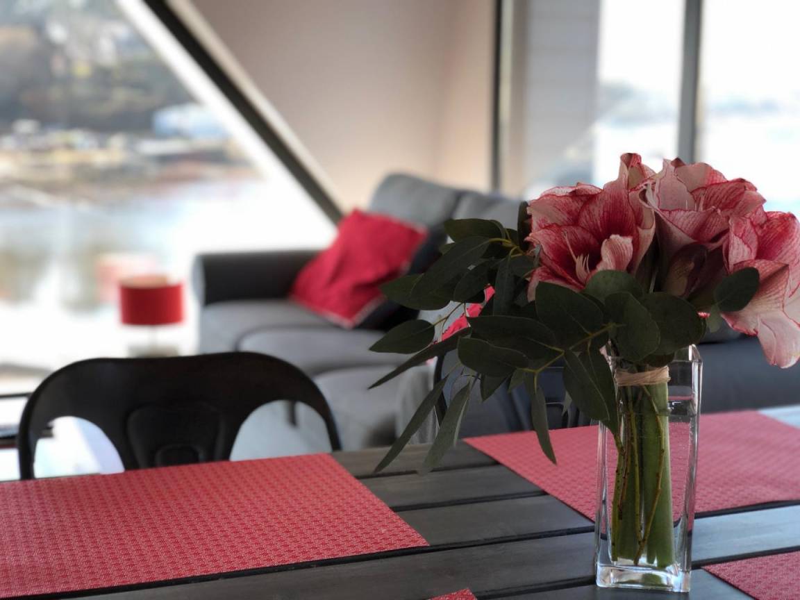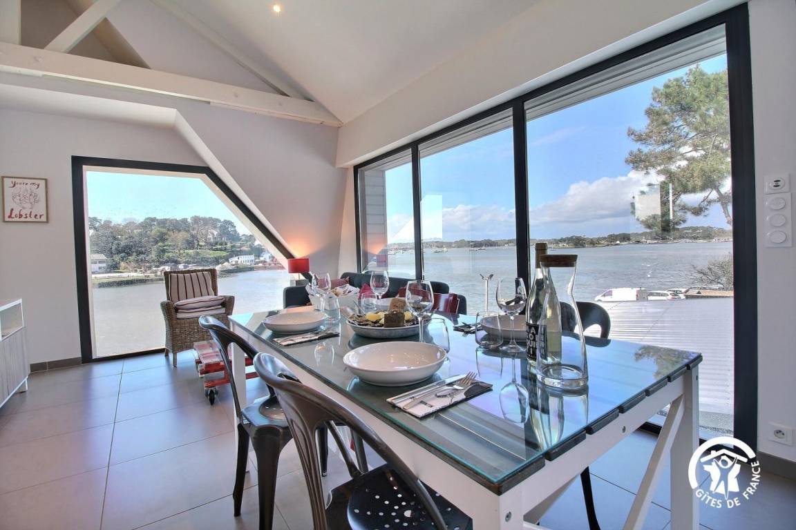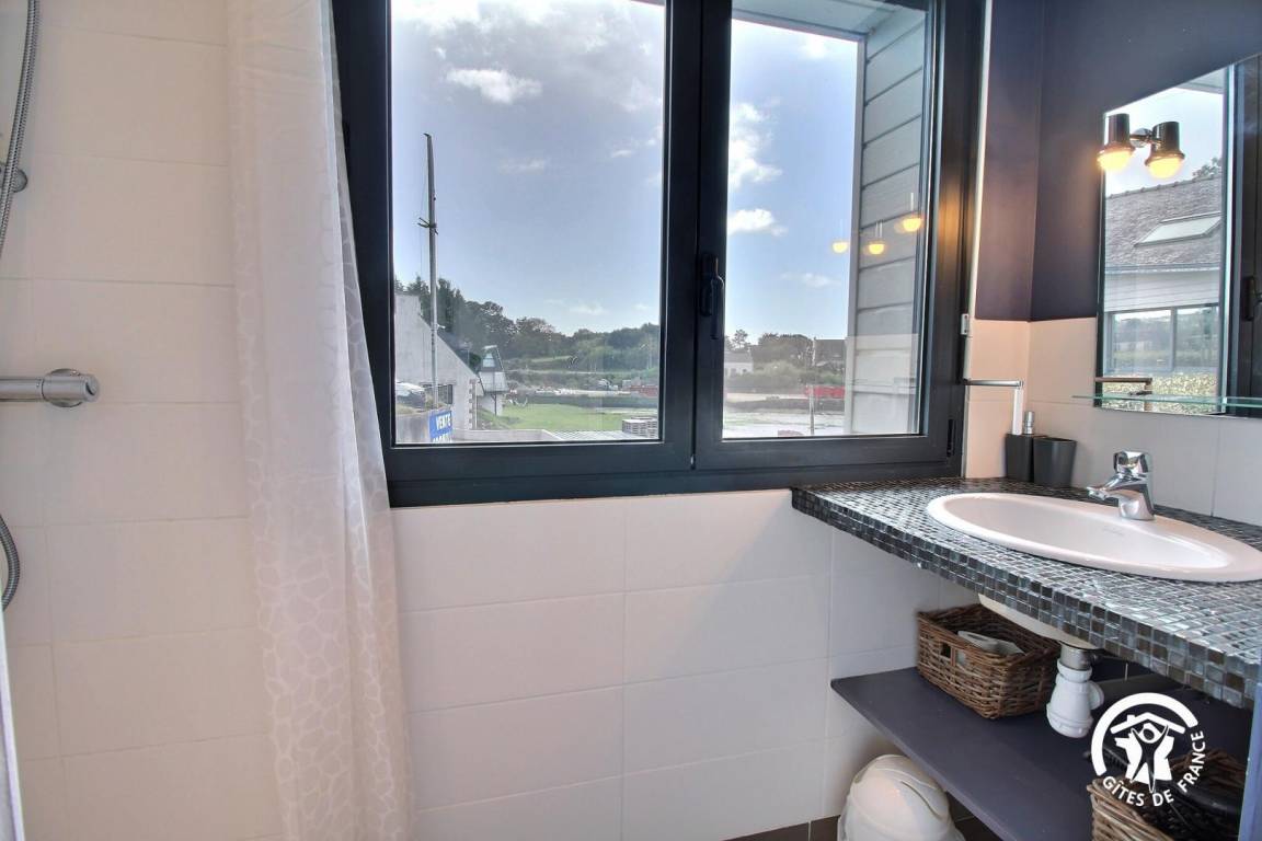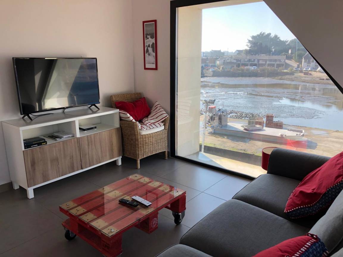 Diese Wohnung mit Blick auf den Fluss Crac'h (Bucht von Quéhan) befindet sich auf der ersten Ebene eines Ferienhauses, das in zwei Gites unterteilt ist. Zehn Stufen ermöglichen den Zugang zur Unterkunft. Der Hauptraum besteht aus einer ausgestatteten Küche, die zu einem vollständig verglasten Wohn-/Wohnzimmer (Netflix-TV mit Zugang) offen ist. Direkter Zugang zu einer schönen Hängeterrasse mit Meerblick und ausgestattet mit Gartenmöbeln. Zwei Schlafzimmer mit kleinem Meerblick (1 Doppelbett 140X200 und 2 Einzelbetten 90X200). Badezimmer mit Dusche und Waschbecken, separates WC.