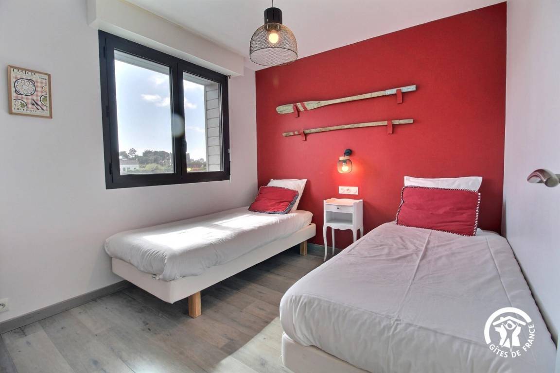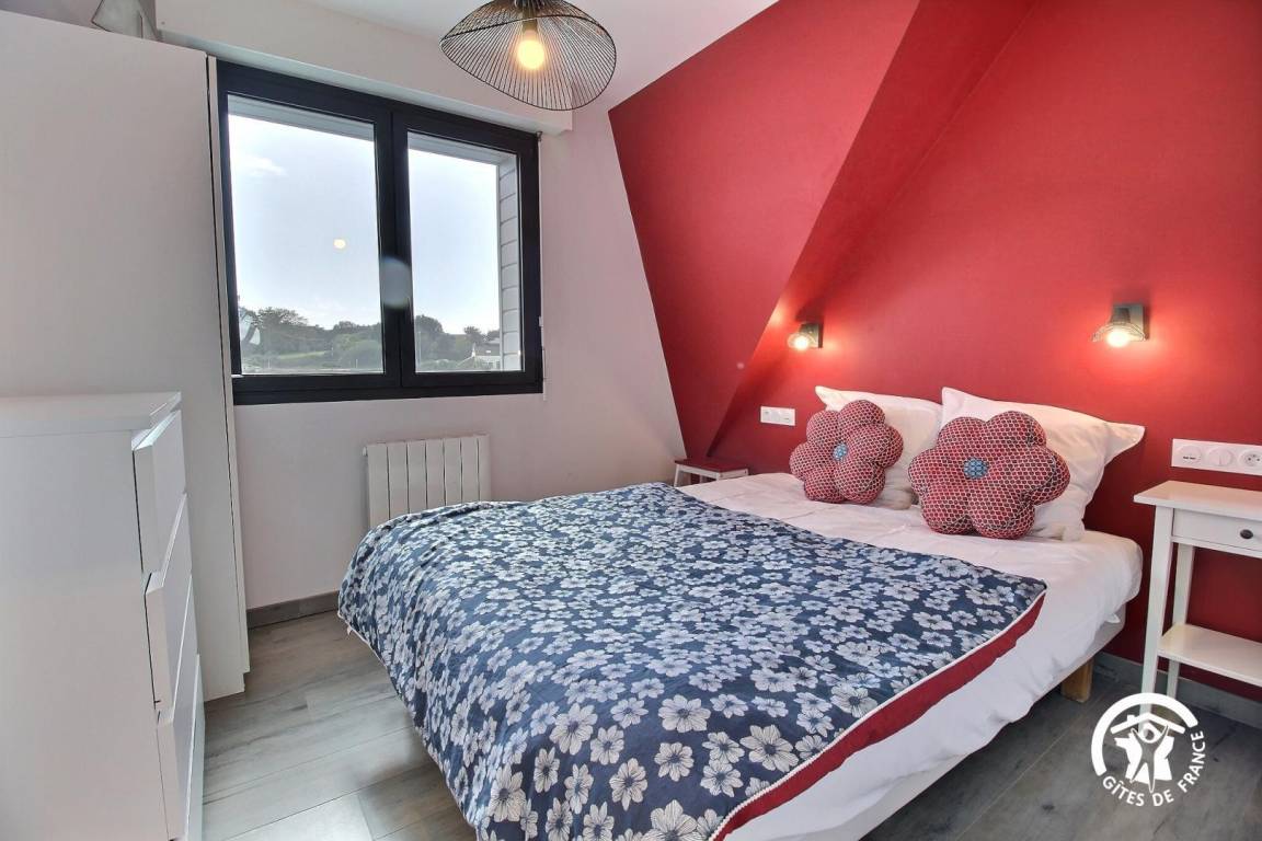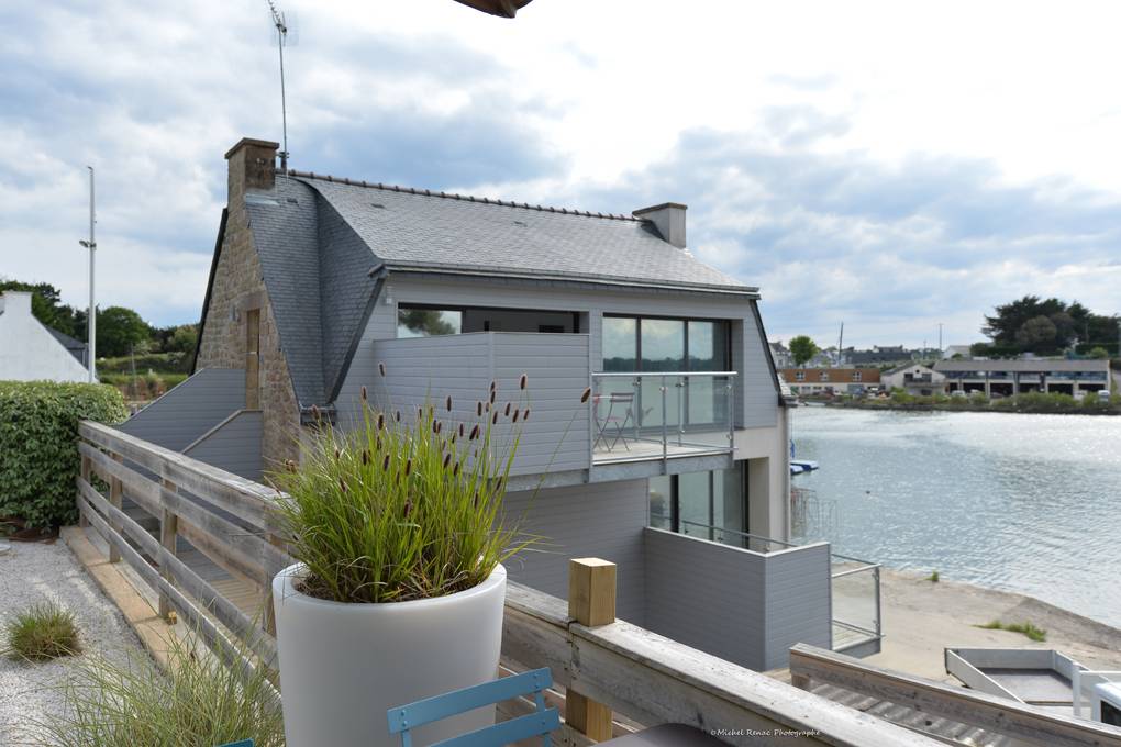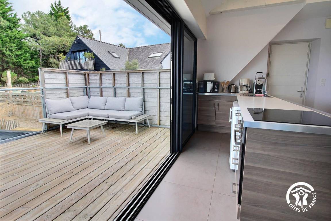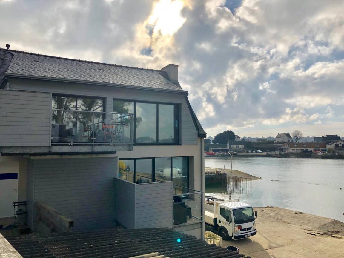 Diese Wohnung mit Blick auf den Fluss Crac'h (Bucht von Quéhan) befindet sich auf der ersten Ebene eines Ferienhauses, das in zwei Gites unterteilt ist. Zehn Stufen ermöglichen den Zugang zur Unterkunft. Der Hauptraum besteht aus einer ausgestatteten Küche, die zu einem vollständig verglasten Wohn-/Wohnzimmer (Netflix-TV mit Zugang) offen ist. Direkter Zugang zu einer schönen Hängeterrasse mit Meerblick und ausgestattet mit Gartenmöbeln. Zwei Schlafzimmer mit kleinem Meerblick (1 Doppelbett 140X200 und 2 Einzelbetten 90X200). Badezimmer mit Dusche und Waschbecken, separates WC.