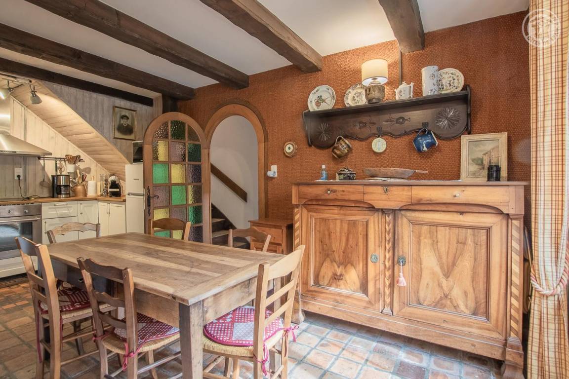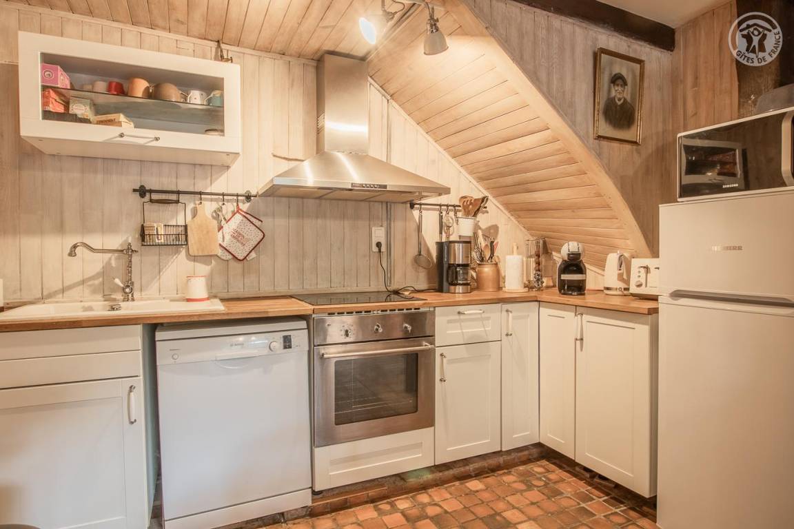 Freistehendes Haus auf 2 Ebenen, bestehend aus: einer Eingangshalle, einer Wohnküche, einem Wohnzimmer (mit Kamin - Chromcast-Box) mit separatem WC. 1. Etage: 1 Schlafzimmer (1 Doppelbett 140x190 cm) mit Badezimmer (Dusche), 2 Schlafzimmer (1 Doppelbett 140x190 cm mit Waschbecken / 2 Einzelbetten 80x190 cm, die zu 1 Doppelbett 160x190 cm kombiniert werden können), ein Badezimmer im Keller (Dusche, Waschmaschine und Trockner). Gesamtnutzfläche: 105 m² inklusive Dachgeschossflächen. Terrasse mit Essbereich im Freien. Parkplatz für 1 Auto vor dem Haus und öffentlicher Parkplatz 100 m entfernt. Garage zum Abstellen von Fahrrädern.