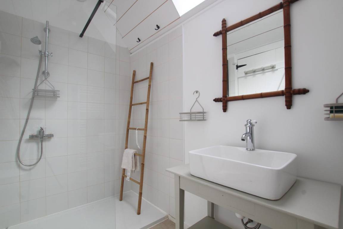 Freistehendes Haus. Wohnzimmer (TV, WLAN). Über eine Stufe gelangt man in die Küche (3-Flammen-Gasherd mit Backofen und Grill, Geschirrspüler, Kühlschrank mit Gefrierfach, Mikrowelle, Espressomaschine). Schlafzimmer 1 (Bett 140x190) mit Zugang von außen. Waschküche (Waschmaschine, Mikrowelle) mit separater Toilette. Duschraum. Im Obergeschoss: Schlafzimmer im Zwischengeschoss (2 Betten 90x190) + 2 zusätzliche Betten 90x190 und angrenzendes Schlafzimmer 2 (Bett 160x200) mit Waschbecken und freistehender Badewanne. Babyausstattung auf Anfrage. Bettwäsche wird gestellt und Betten bei Ankunft bezogen. Handtücher optional. Reinigungsservice gegen Aufpreis. Elektroheizung inklusive. Alle Gebühren inklusive. Privater, nicht eingezäunter Garten. Überdachte Terrasse. Gartenmöbel. Grill. Liegestühle. Parkplatz.