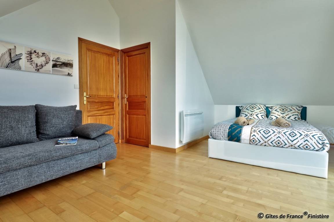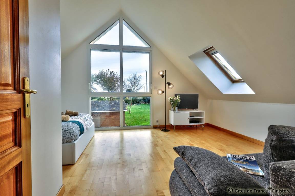 „Bon séjour en Bretagne, belle location, avec cuisine bien équipée, mais quelques remarques: Grande TV au salon, mais qui ne fonctionne pas (signalé plusieurs fois depuis 2024). Il faut monter à l'étage. Pourquoi ne pas prendre l'option Box TV ou mettre une antenne râteau? ? A noter le WIFI est maintenant disponible (code sur box) Volet roulant manuel cuisine inutilisable (pas de manivelle). Chambre à l'étage, super volet roulant électrique, mais une grande partie triangulaire au dessus est non occultée (face au soleil levant)... à réserver aux lèves-tôt. Pas d'avis sur propriétaire car n'habite pas sur place, l'accueil délégué est plutôt sympathique. Globalement nous avons passé un très bon séjour.“