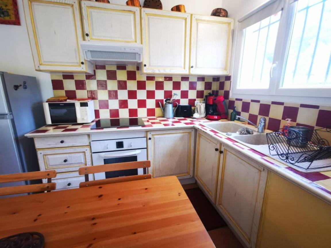 Dieses ebenerdige Ferienhaus ist für zwei Personen ausgelegt und bietet ein traditionelles und einladendes Ambiente. Der Hauptraum umfasst einen Schlafbereich mit einem Doppelbett (140 x 190 cm), einen Wohnbereich mit Sofa und Fernseher, einen Essbereich sowie eine gut ausgestattete offene Küche (Backofen, Mikrowelle, Kühlschrank, Gefrier
