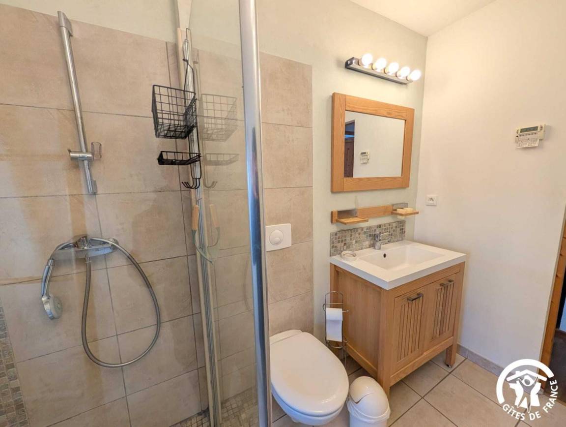 Im Obergeschoss finden Sie ein Badezimmer mit Dusche, WC und Waschbecken sowie zwei Schlafzimmer: