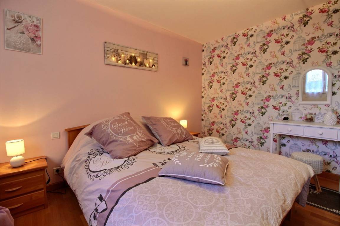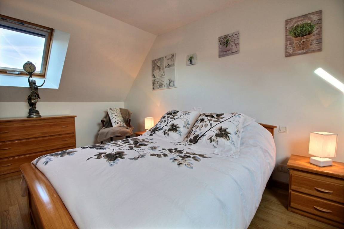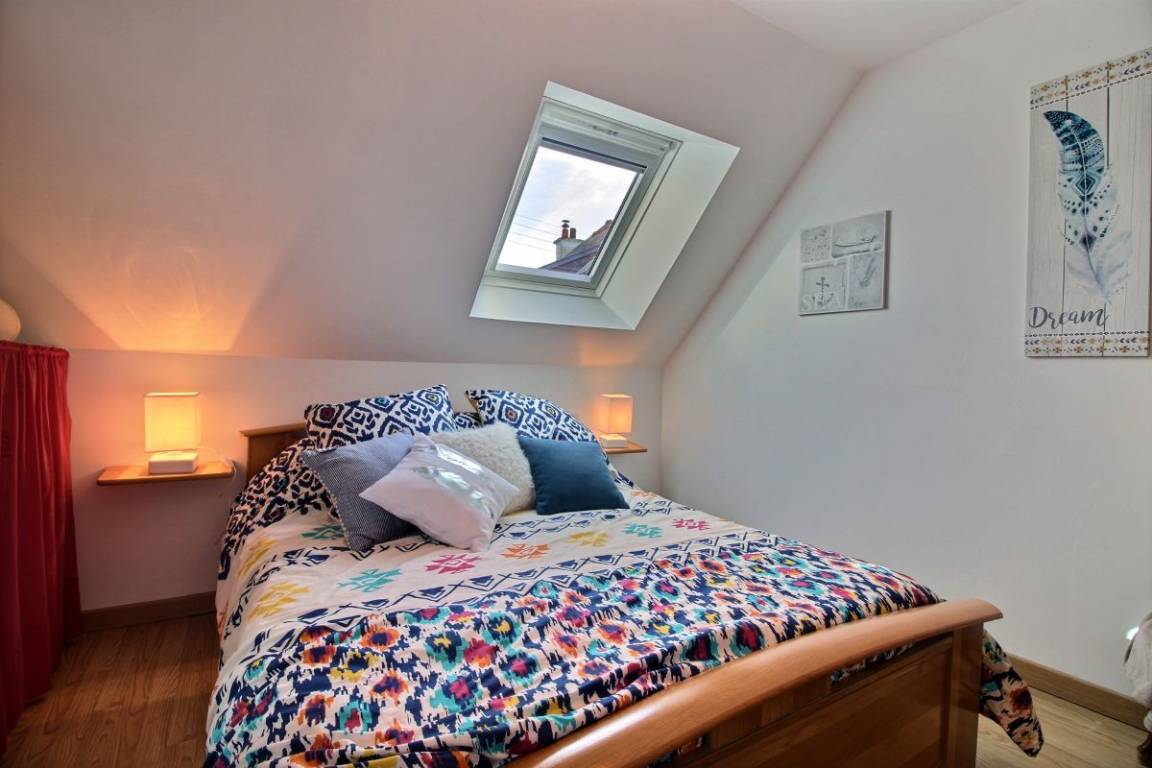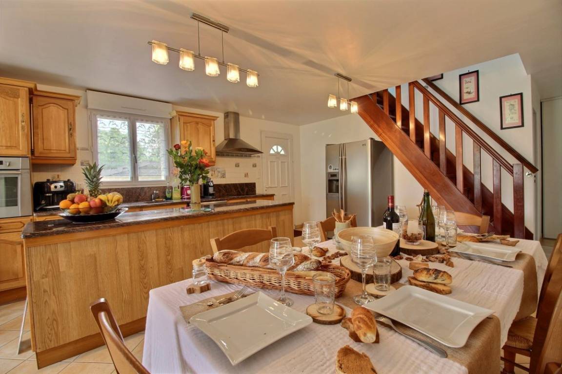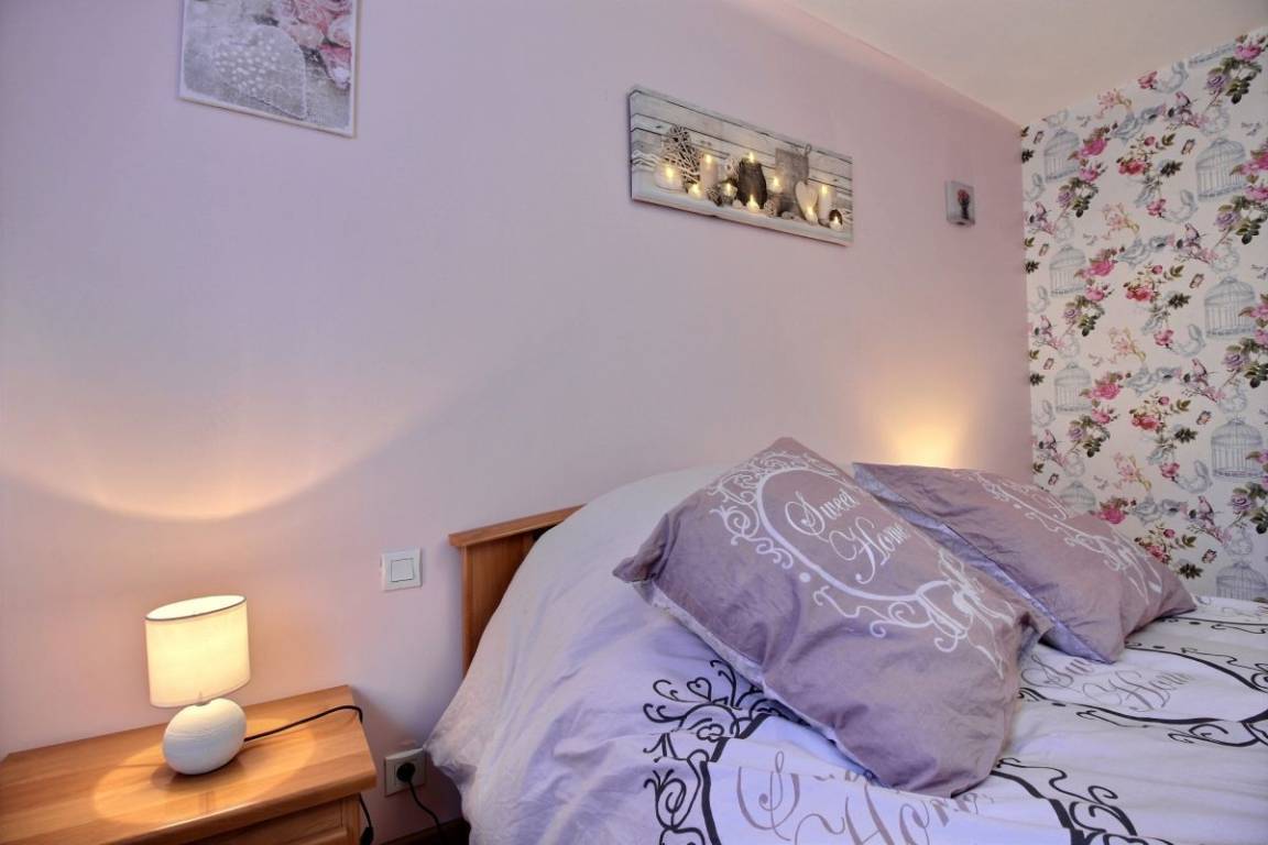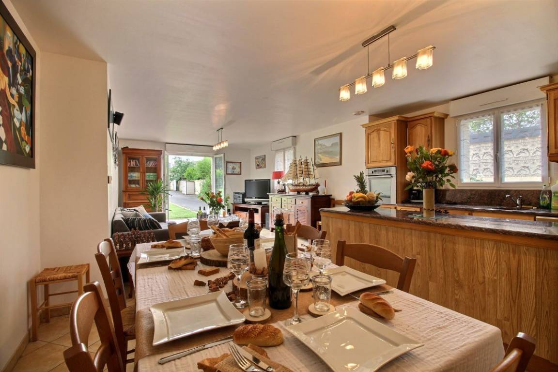 Dieses Urlaubshausangebot umfasst: Im Erdgeschoss: ein Ess-Wohnzimmer mit offener, komplett ausgestatteter Küche, ein Zimmer mit einem Bett 140 cm. Ein Badezimmer mit Toilette, eine separate Toilette und eine Waschküche. Im Obergeschoss: drei Zimmer (3 Betten 140 cm + 1 Bett 90 cm), ein Bad mit WC. Garten mit 100m² großer Rasenfläche und überdachter Terrasse. Eigene Garage vorhanden und Parkmöglichkeit im gepflasterten Innenhof. Wegerecht vor dem Haus für den Zugang eines anderen Mietshauses. A