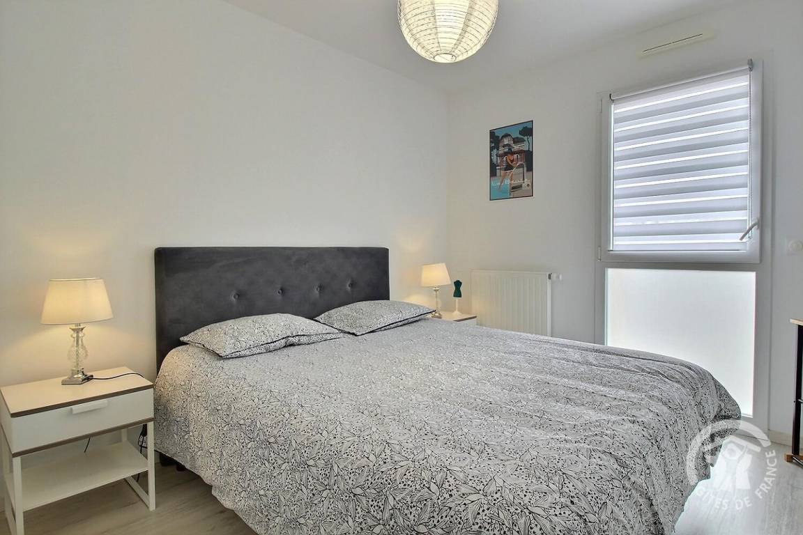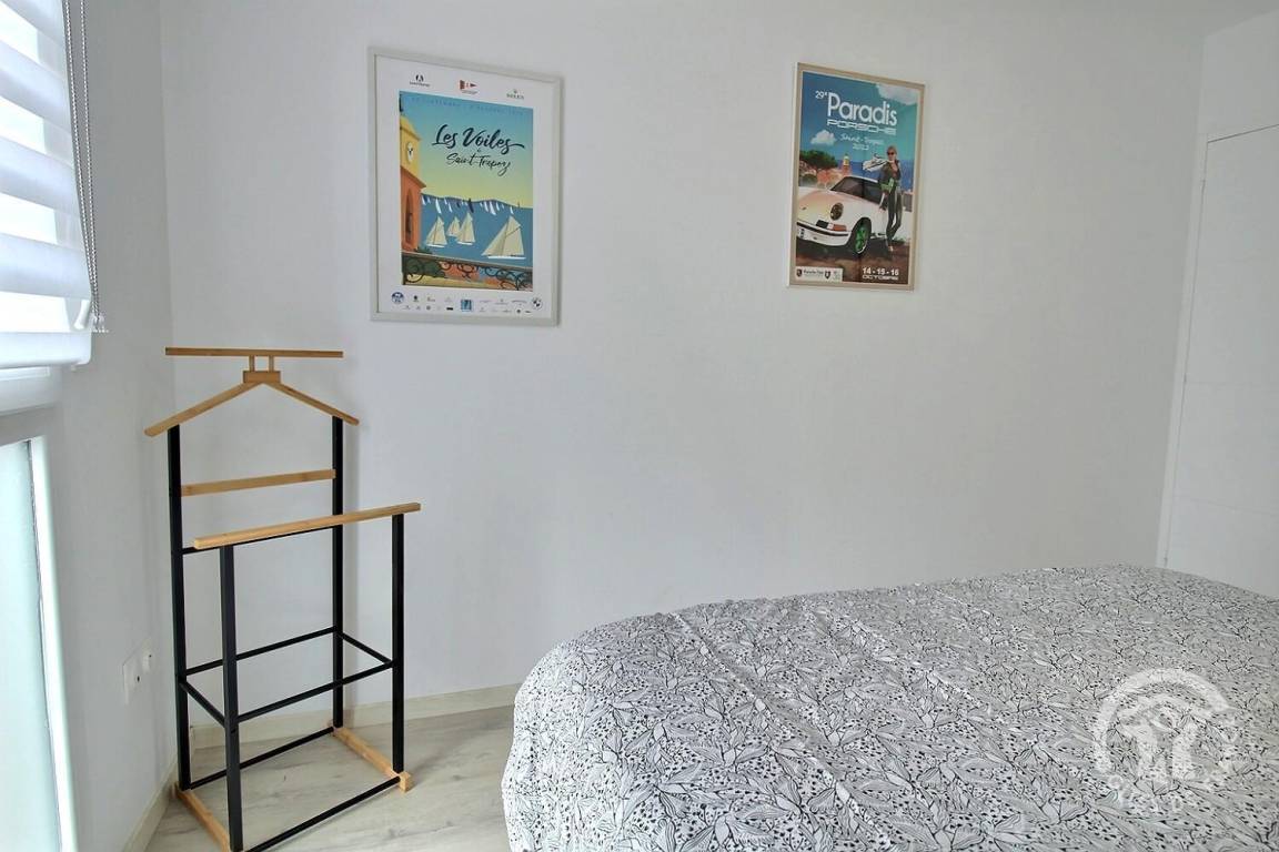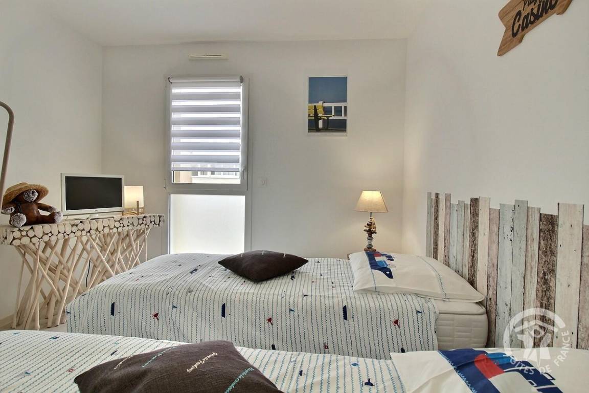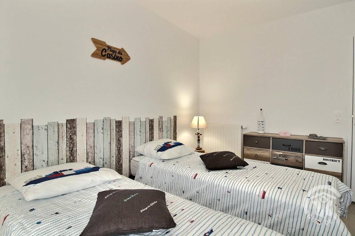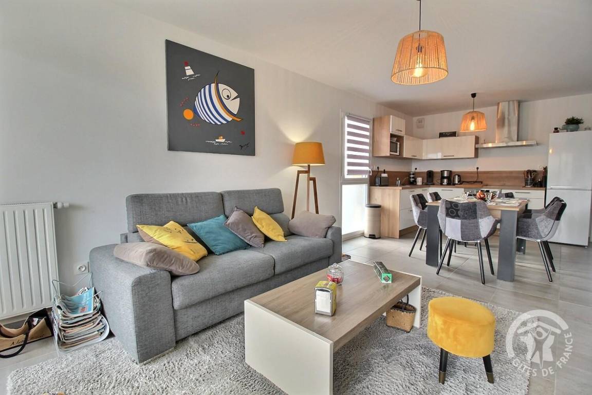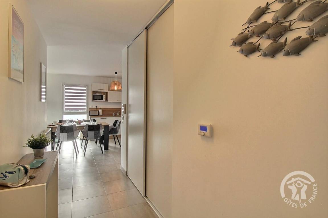 Eingangsbereich mit Schrank, helles Wohnzimmer mit gut ausgestatteter Einbauküche, 7 m² großer Balkon mit Gartenmöbeln und Meerblick, 1 Schlafzimmer (1 Bett 160x200), 1 Schlafzimmer (2 Betten 80x200, die zu 1 Bett 160x200 zusammengestellt werden können), Duschbad (ebenerdige Dusche), separates WC mit Waschmaschine.