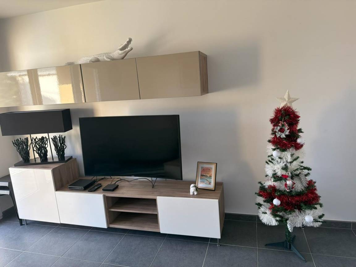 Wohnzimmer mit Einbauküche, 6 m² große Balkon-Terrasse mit Gartenmöbeln und Meerblick, 1 Schlafzimmer (1 Bett 140x190), Duschbad (ebenerdige Dusche, WC und Waschmaschine).