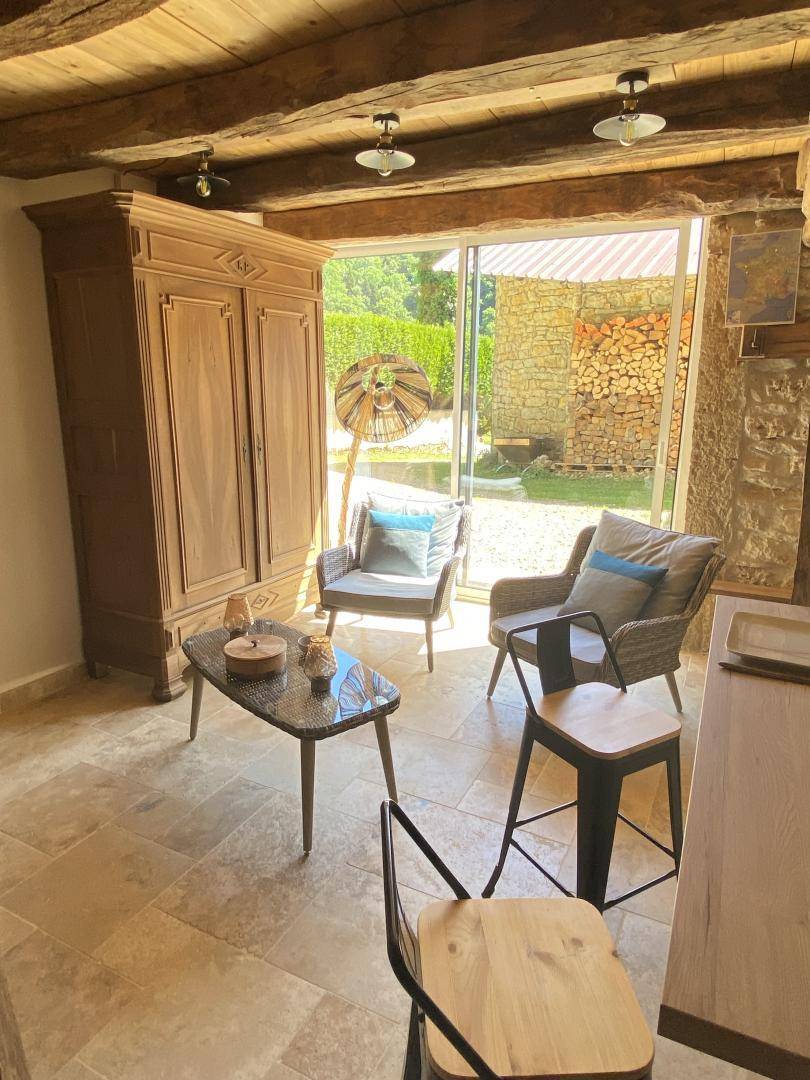 Einstöckige Gîte: sehr gut ausgestattete Küche, offen zum Essbereich und Wohnzimmer. Duschraum und WC.