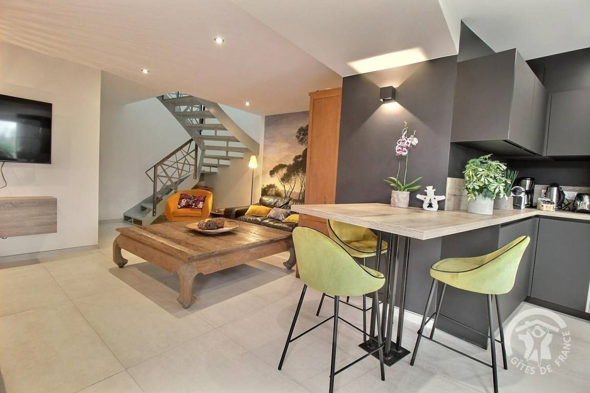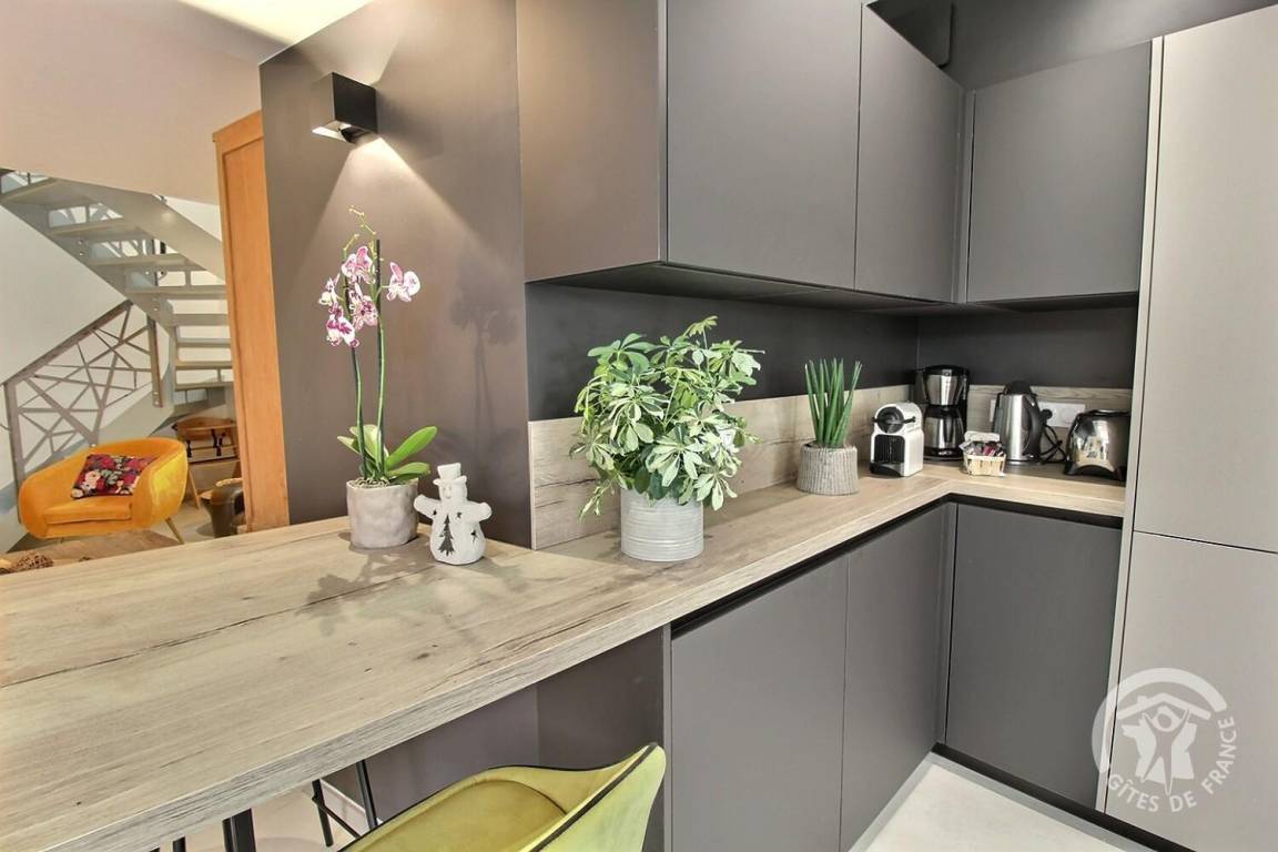 Wohnzimmer mit gut ausgestatteter Einbauküche (Thermomix-Roboter), 1 Schlafzimmer (1 140x190-Bett) mit angrenzendem privatem Badezimmer (ebenerdige Dusche), separater Toilette (Handwaschbecken) und Wäscheschrank.